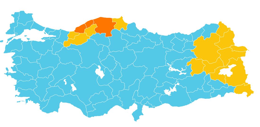 Meteoroloji Genel Müdürlüğü yurdun bazı bölümlerini "turuncu" ve "sarı" kodla uyardı. 17 kentte fırtına ve kuvvetli yağış bekleniyor. Yetkililer sel, su baskını, yıldırım, yağış anında kuvvetli rüzgar, ulaşımda aksamalar gibi olumsuzluklara karşı dikkatli ve tedbirli olunması konusunda uyardı.