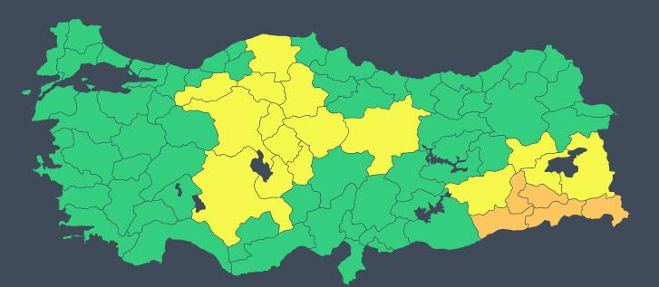 Hava durumu tehlikelidir: Tahmin edilen meteorolojik hadise sıklıkla görülmemektedir. Hasar ve kayıpların oluşması muhtemeldir. Çok tedbirli olmalı, güncel meteorolojik koşullar ve tahminler takip edilmelidir.