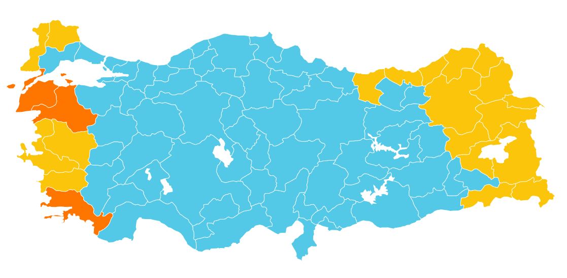 Hava durumu tehlikelidir: Tahmin edilen meteorolojik hadise sıklıkla görülmemektedir. Hasar ve kayıpların oluşması muhtemeldir. Çok tedbirli olmalı, güncel meteorolojik koşullar ve tahminler takip edilmelidir.
