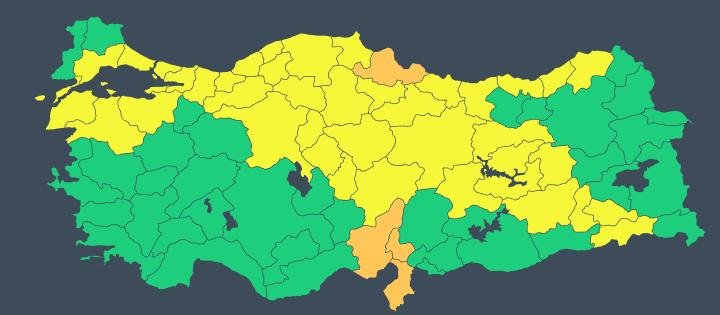 Hava durumu tehlikelidir: Tahmin edilen meteorolojik hadise sıklıkla görülmemektedir. Hasar ve kayıpların oluşması muhtemeldir. Çok tedbirli olmalı, güncel meteorolojik koşullar ve tahminler takip edilmelidir.