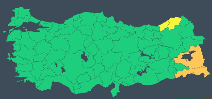 Hava durumu tehlikelidir: Tahmin edilen meteorolojik hadise sıklıkla görülmemektedir. Hasar ve kayıpların oluşması muhtemeldir. Çok tedbirli olmalı, güncel meteorolojik koşullar ve tahminler takip edilmelidir.