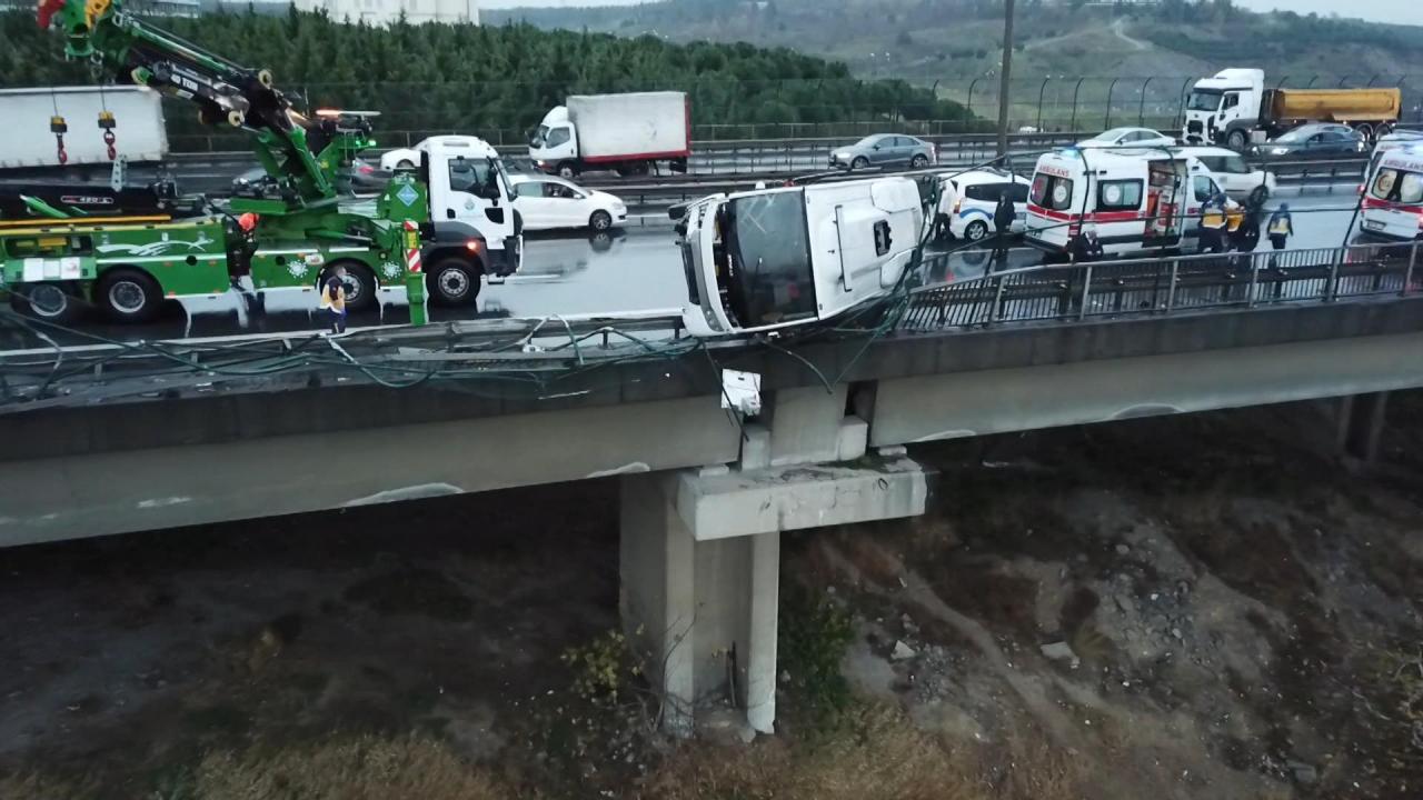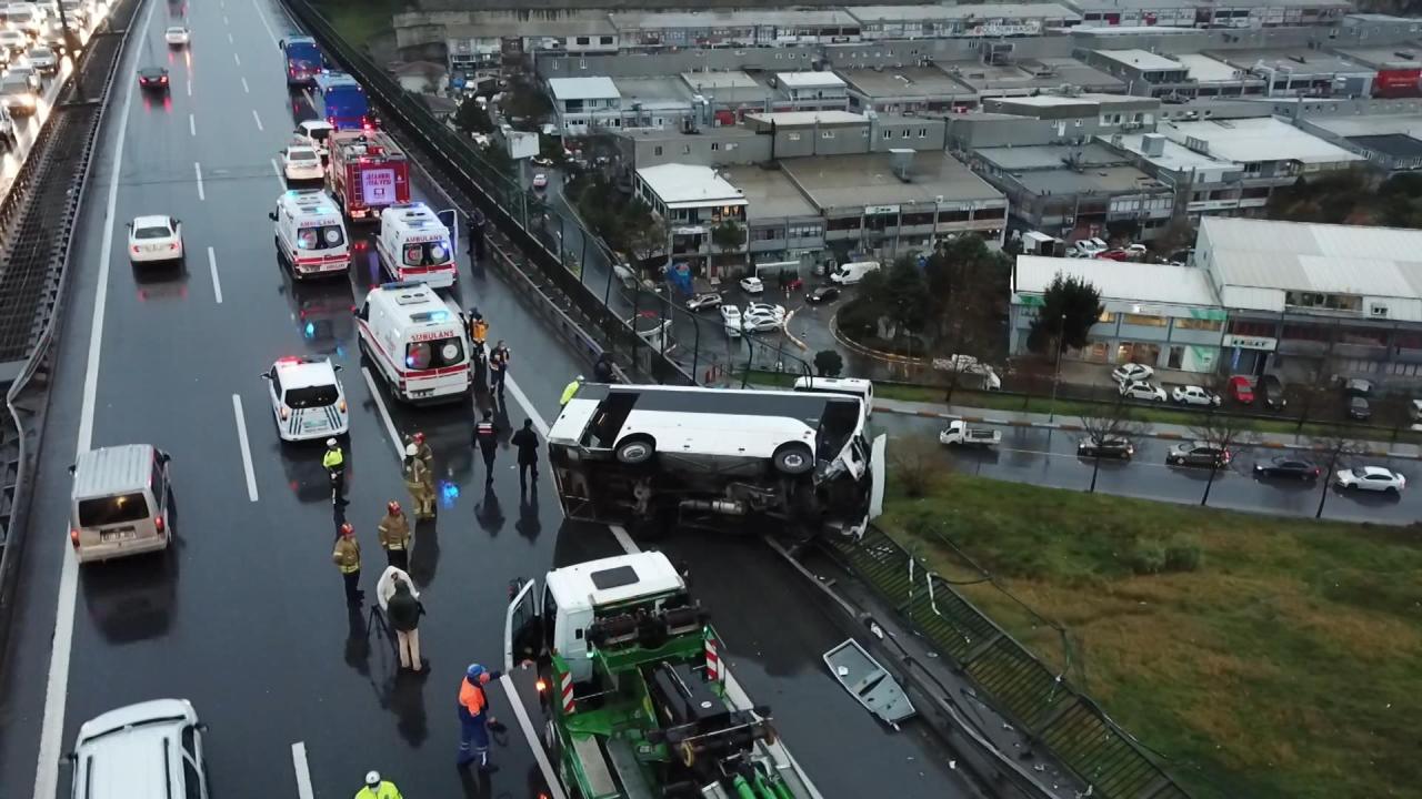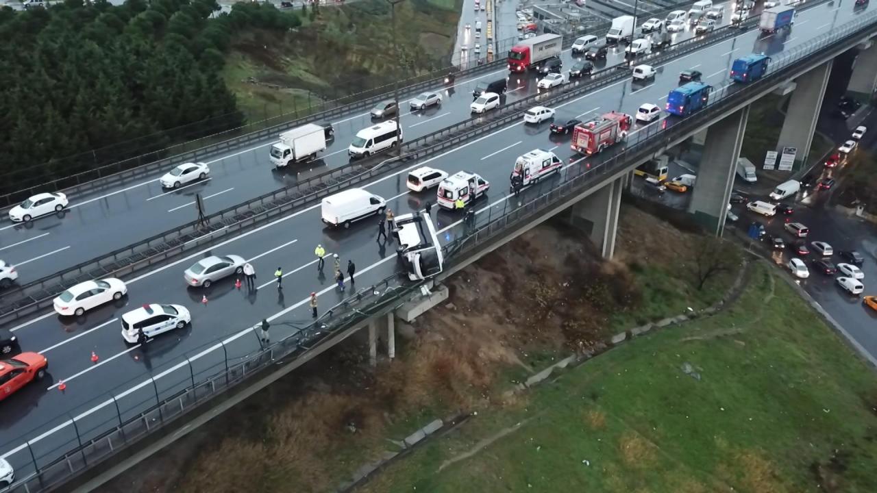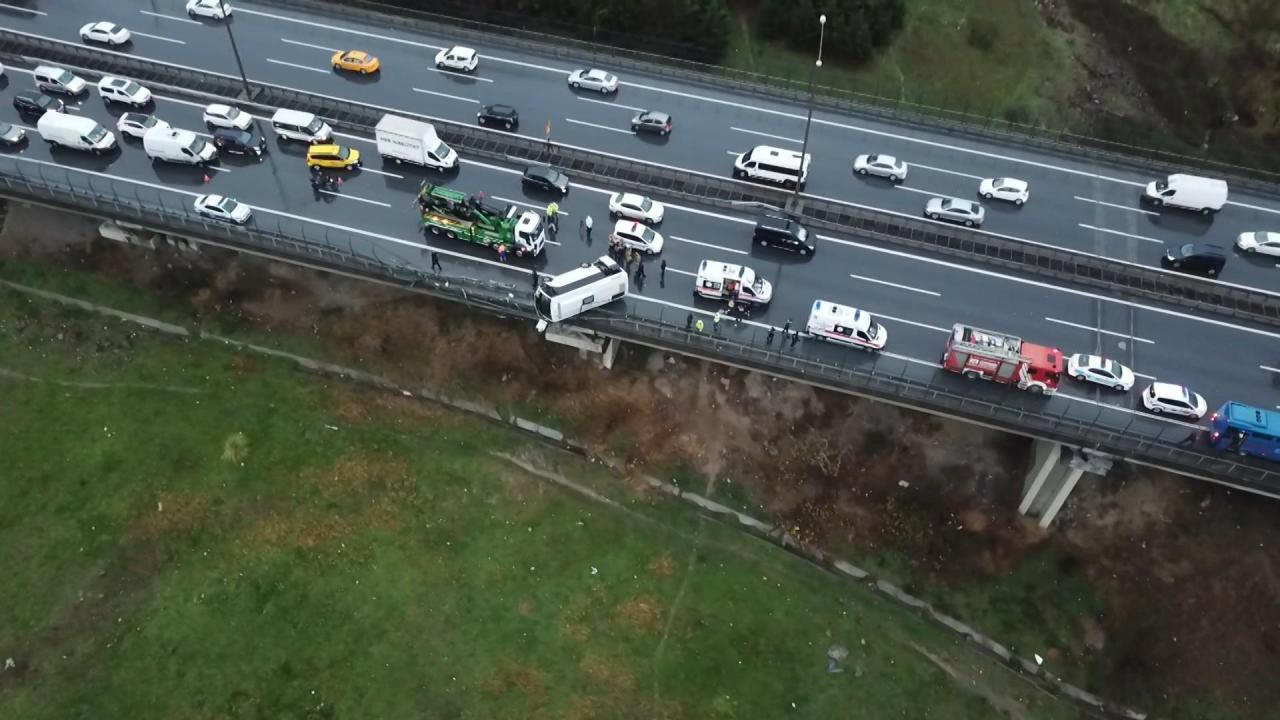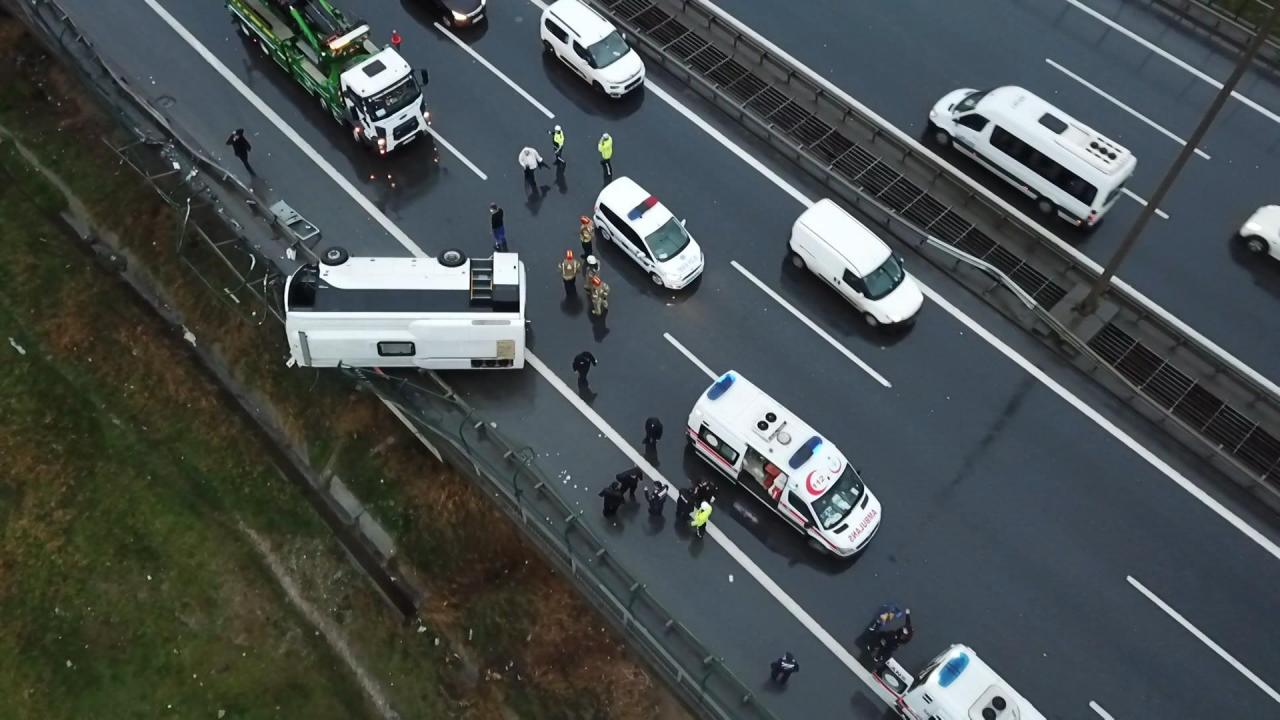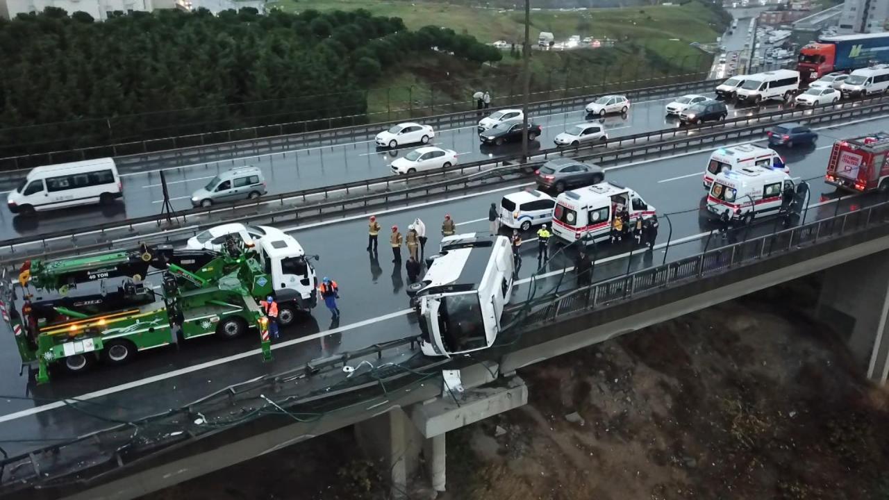 TEM Otoyolu Bağcılar Mevkii Mahmutbey Viyadüğü'nde cezaevi midibüsü kaza yaptı. Kazada 6 kişi yaralandı. Bariyerlere çarparak devrilen midibüsün yarısı bariyerler üzerinde kaldı.