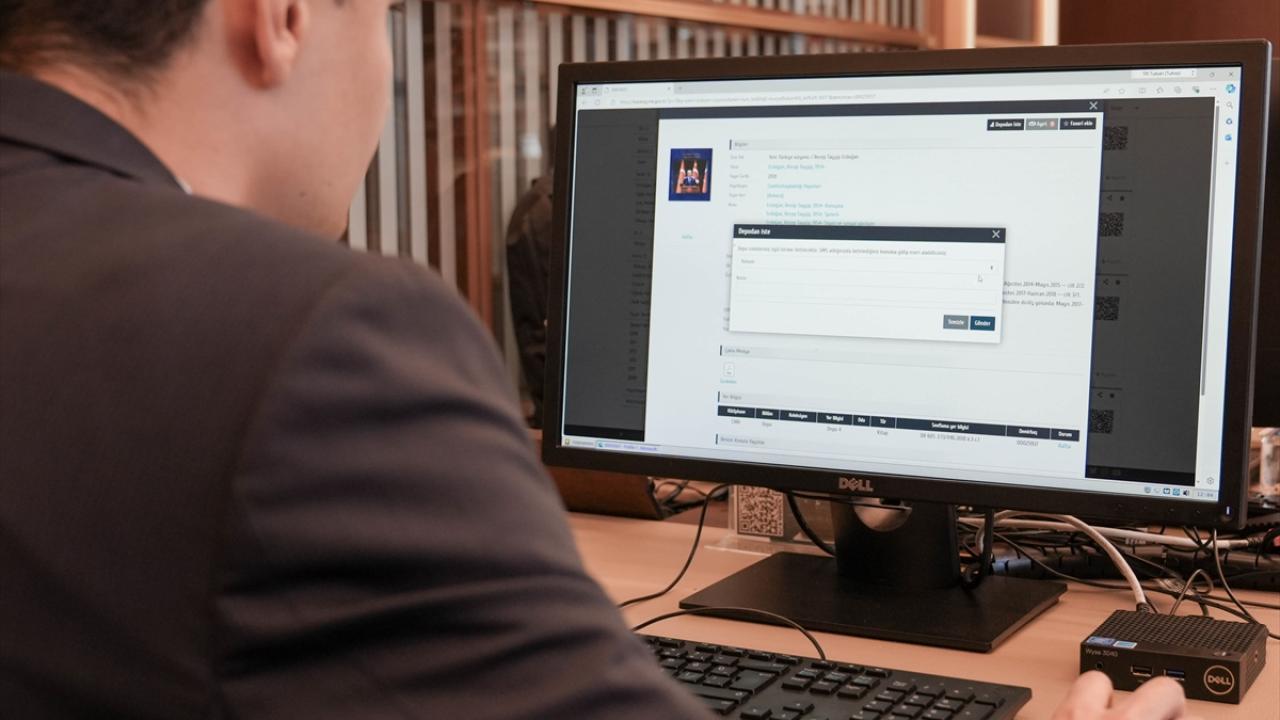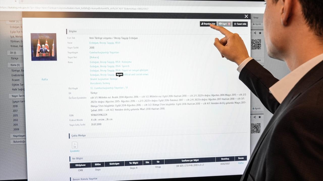 Cumhurbaşkanlığı Millet Kütüphanesi`ne üye okuyucu, katalog tarama ekranından depodaki bir kitabı talep ediyor. Seçilen kitap, farklı kattaki depo görevlisinin ekranına eş zamanlı olarak yansıyor.