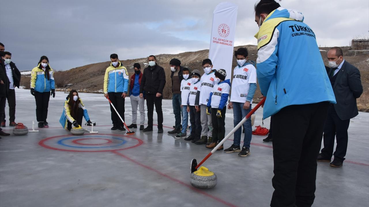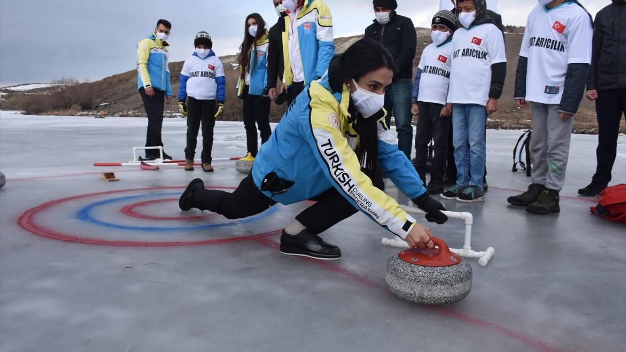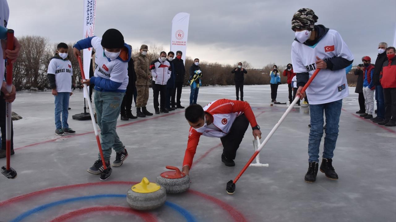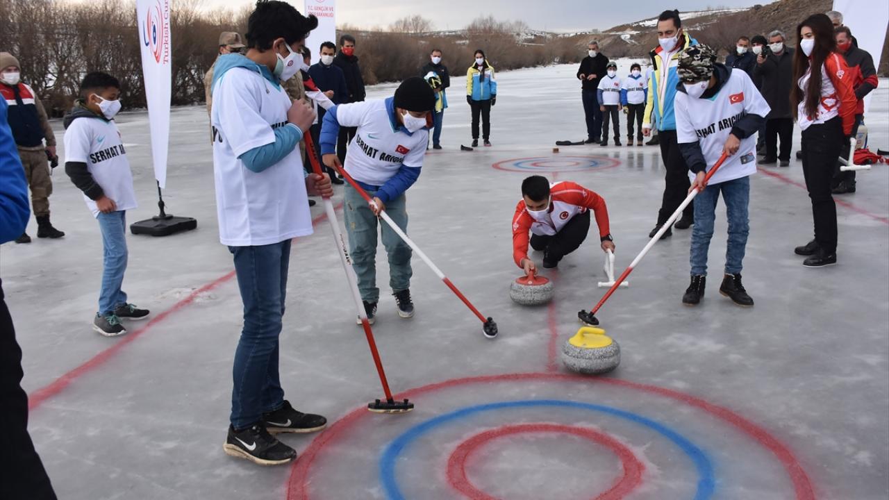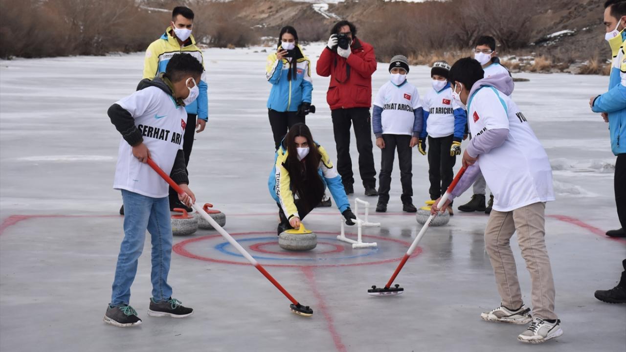 Curling Milli Takım sporcuları, Kars'ın Susuz ilçesine bağlı Yolboyu köylüleri tarafından doğal buz pistine dönüştürülen Kars Çayı üzerinde köy çocuklarıyla bir araya gelerek curling oynadı.