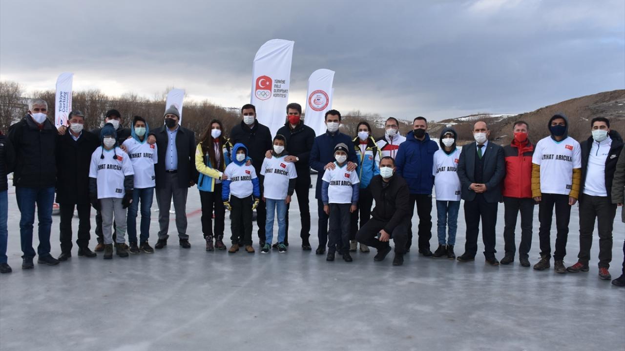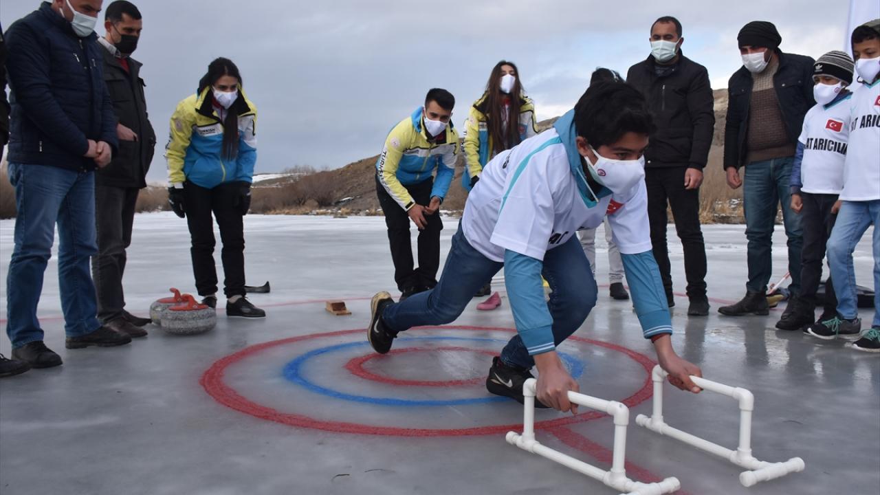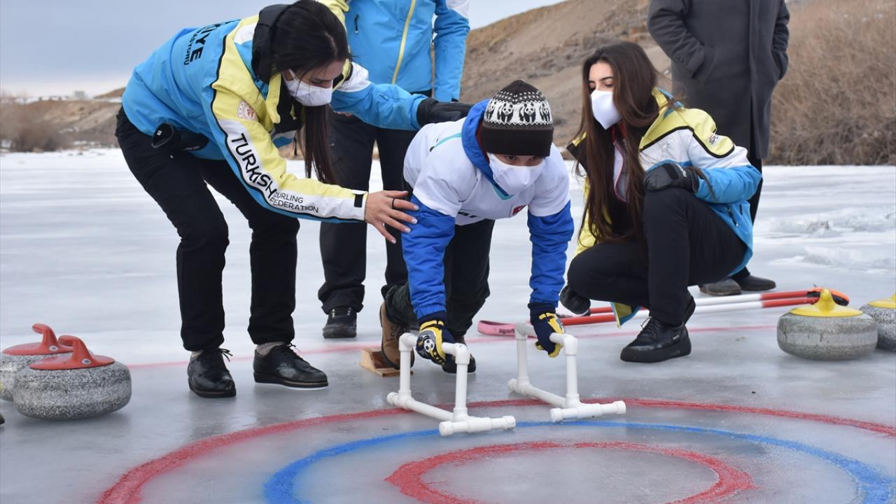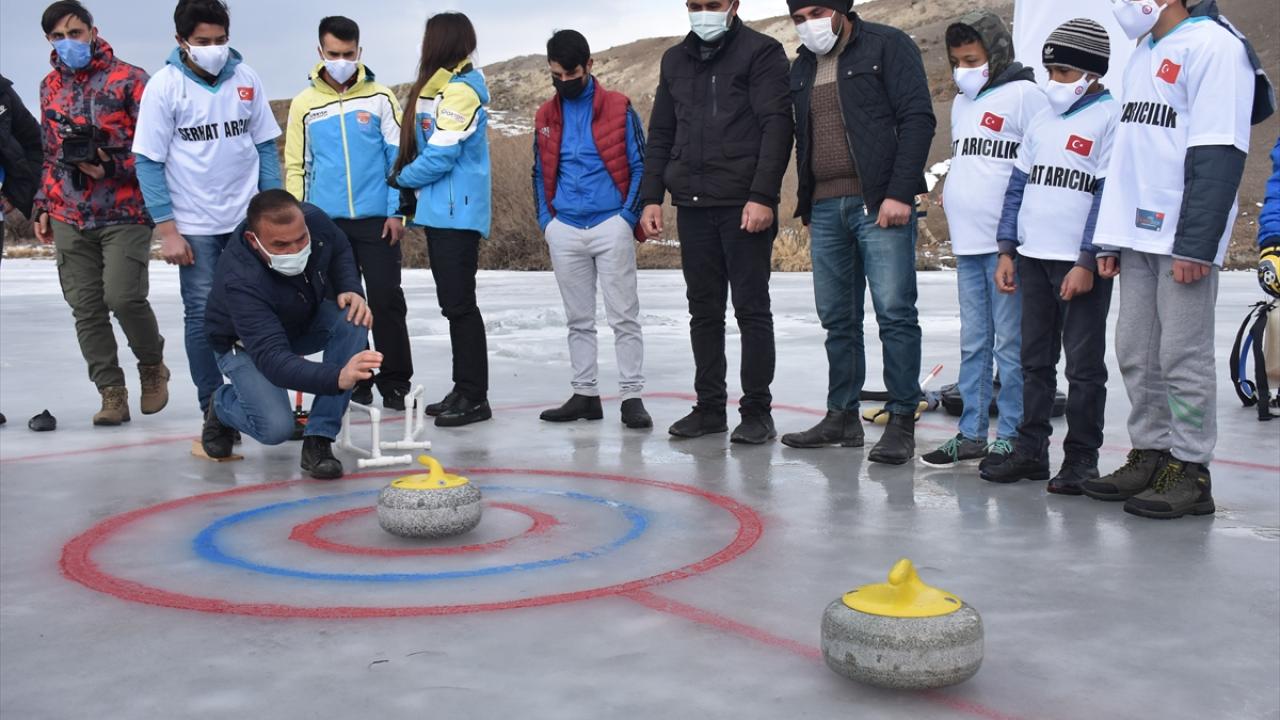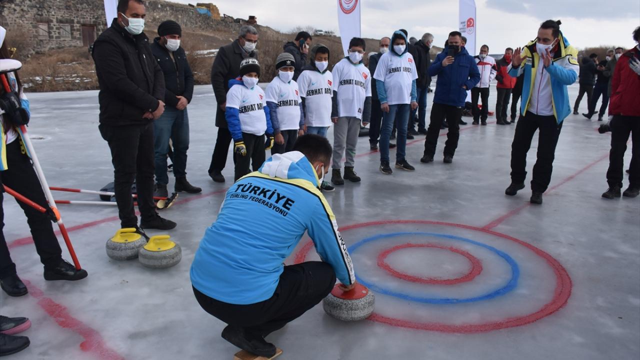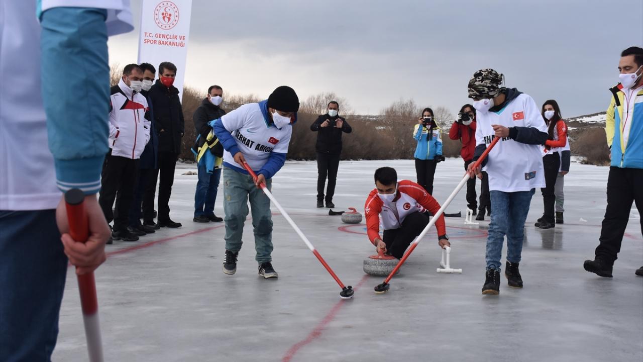 Curling Milli Takım sporcuları, Kars'ın Susuz ilçesine bağlı Yolboyu köylüleri tarafından doğal buz pistine dönüştürülen Kars Çayı üzerinde köy çocuklarıyla bir araya gelerek curling oynadı.