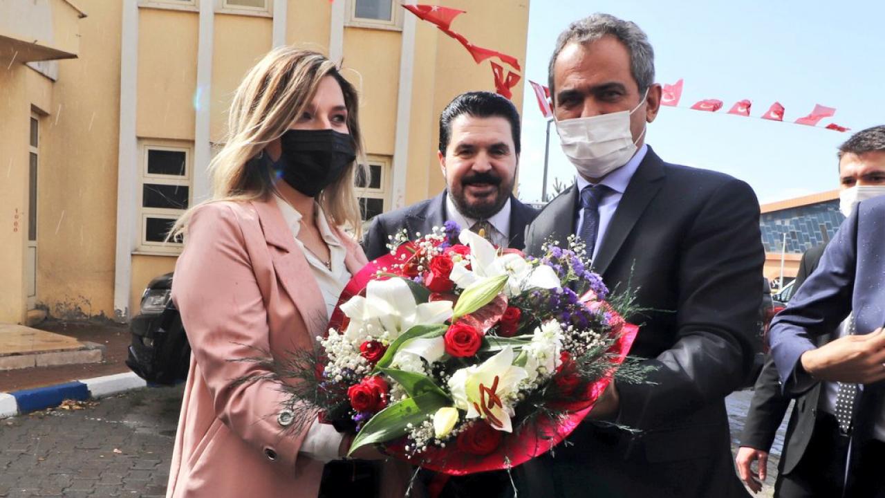 Kitaplar için Özer`e teşekkür eden öğrenciler, ardından Özer`e kendilerinin hazırladığı ve üzerinde Bakan`ın ismi ile Türk bayrağı olan bir tablo hediye etti.