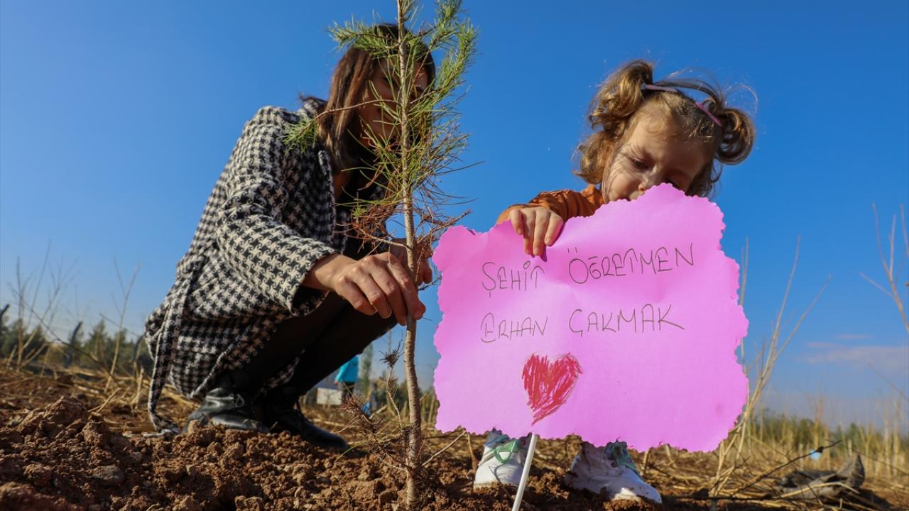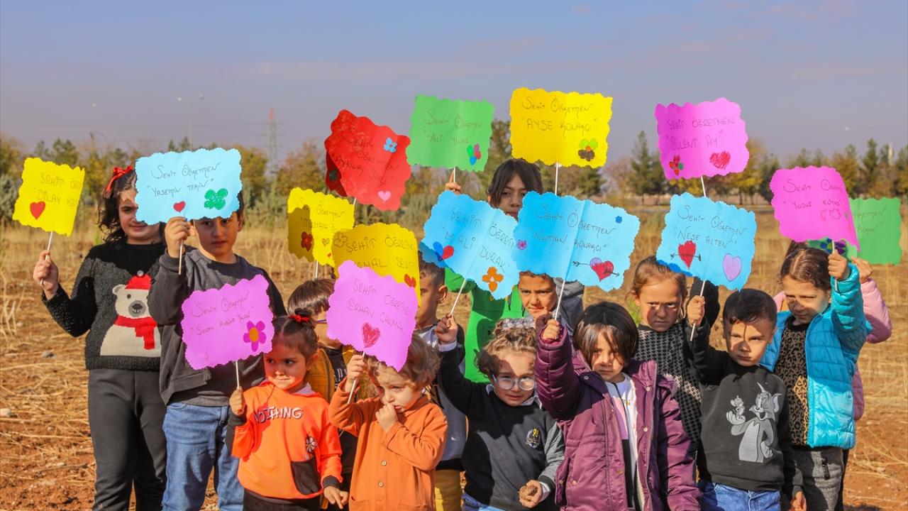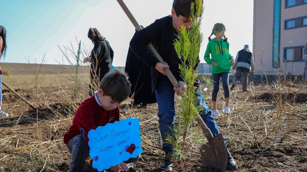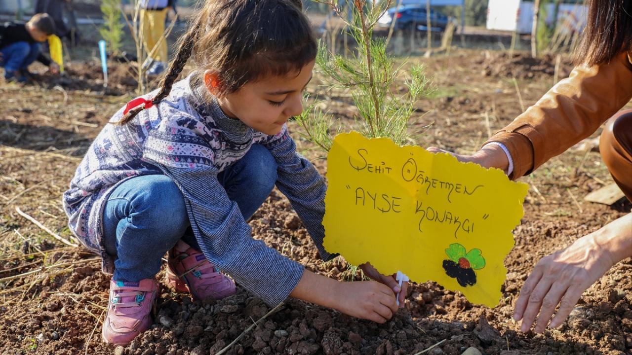 Öğrenciler, Suriye`nin kuzeyinden YPG/PKK`lı teröristlerce Gaziantep`in Karkamış ilçesine 3 gün önce düzenlenen roketli saldırıda şehit olan öğretmen Ayşenur Alkan, Tunceli`de 2017`de PKK`lı teröristlerce katledilen sınıf öğretmeni Necmettin Yılmaz, Batman`ın Kozluk ilçesinde aynı yıl karne dağıtım töreninin ardından evine giderken terör saldırısında şehit olan müzik öğretmeni Şenay Aybüke Yalçın`ın da aralarında bulunduğu onlarca şehit öğretmenin adını yazdıkları ve kalp çizdikleri renkli kağıtları da fidanların yanına dikti.