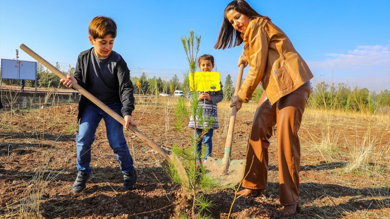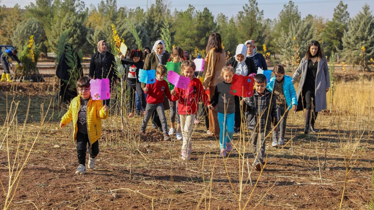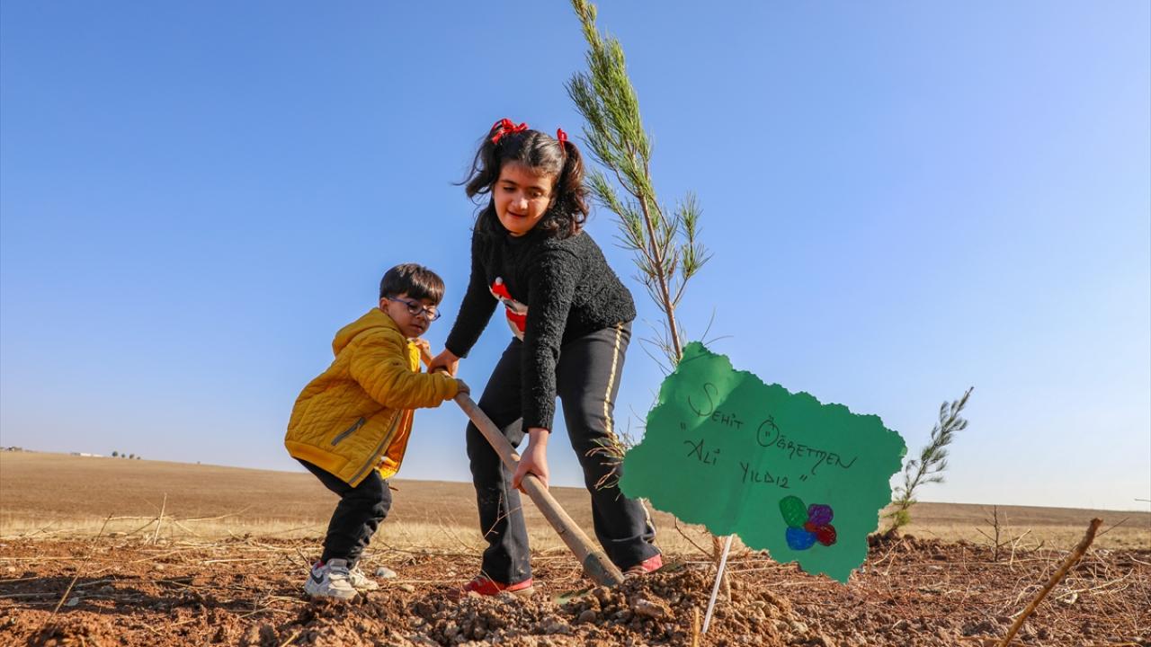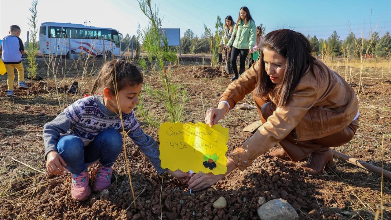 Öğrenciler, Suriye`nin kuzeyinden YPG/PKK`lı teröristlerce Gaziantep`in Karkamış ilçesine 3 gün önce düzenlenen roketli saldırıda şehit olan öğretmen Ayşenur Alkan, Tunceli`de 2017`de PKK`lı teröristlerce katledilen sınıf öğretmeni Necmettin Yılmaz, Batman`ın Kozluk ilçesinde aynı yıl karne dağıtım töreninin ardından evine giderken terör saldırısında şehit olan müzik öğretmeni Şenay Aybüke Yalçın`ın da aralarında bulunduğu onlarca şehit öğretmenin adını yazdıkları ve kalp çizdikleri renkli kağıtları da fidanların yanına dikti.
