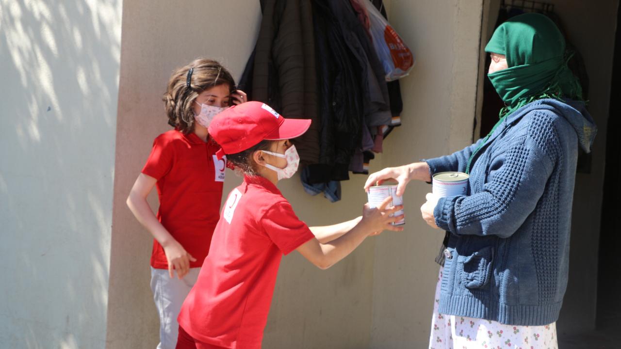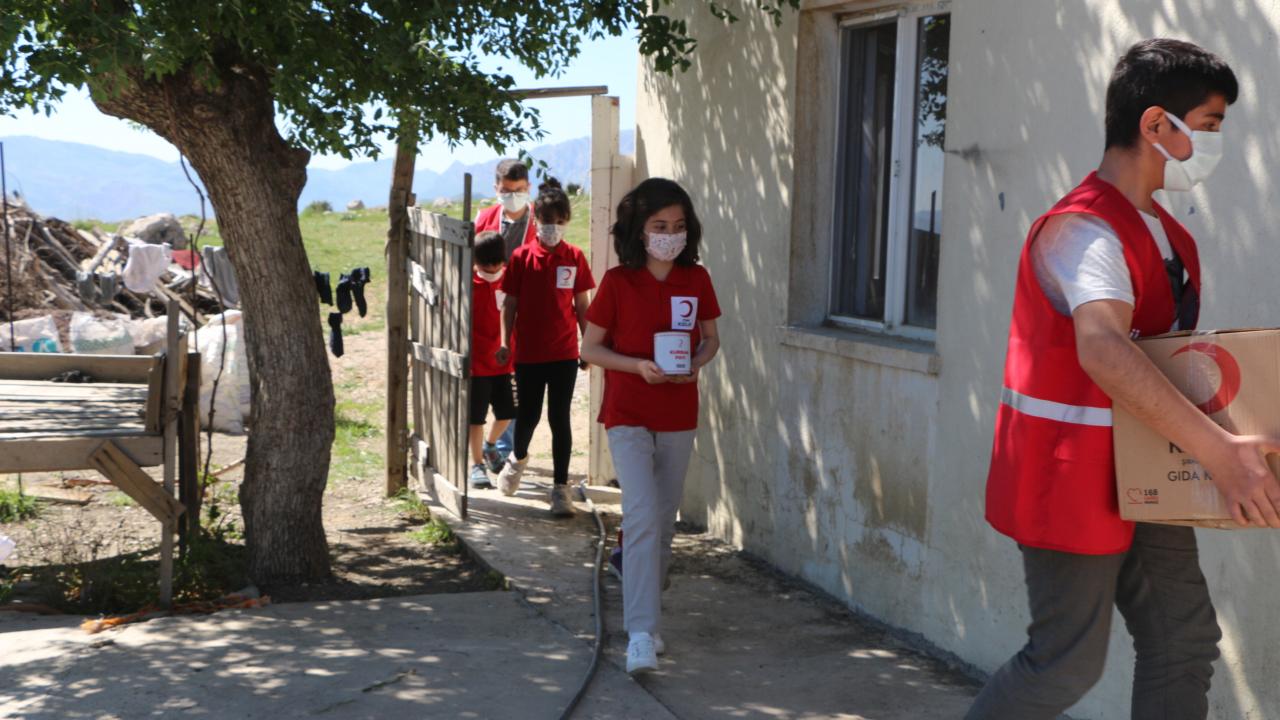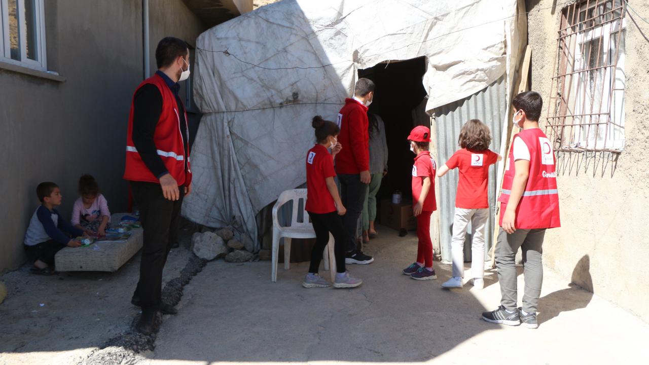Kızılay yeleği giyen minikler, sokak sokak dolaşıp, ellerine aldıkları kolileri ihtiyaç sahiplerine teslim etti.