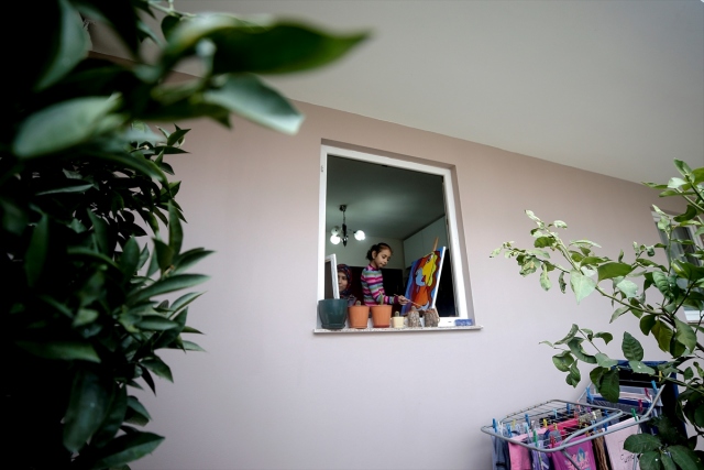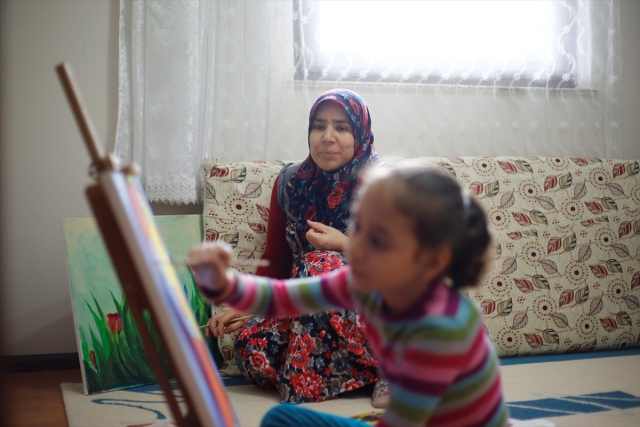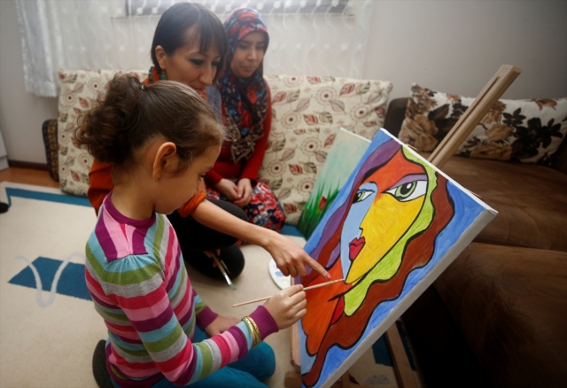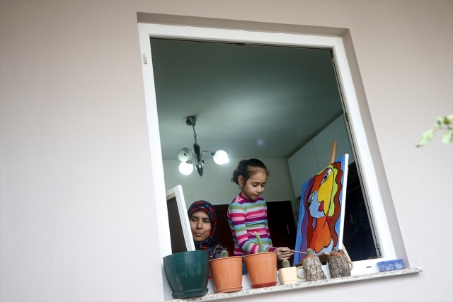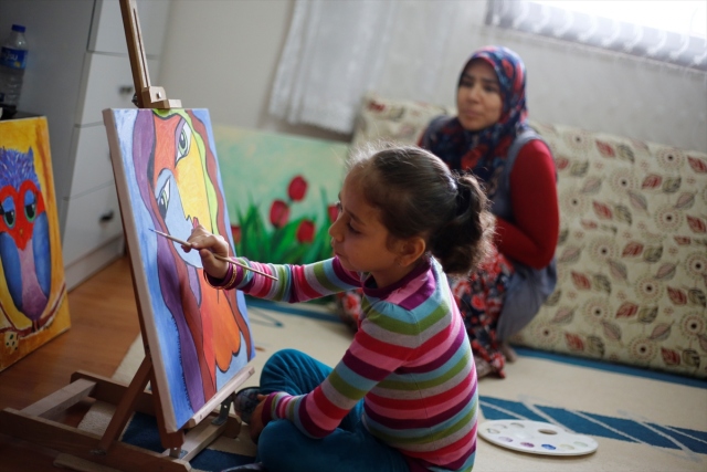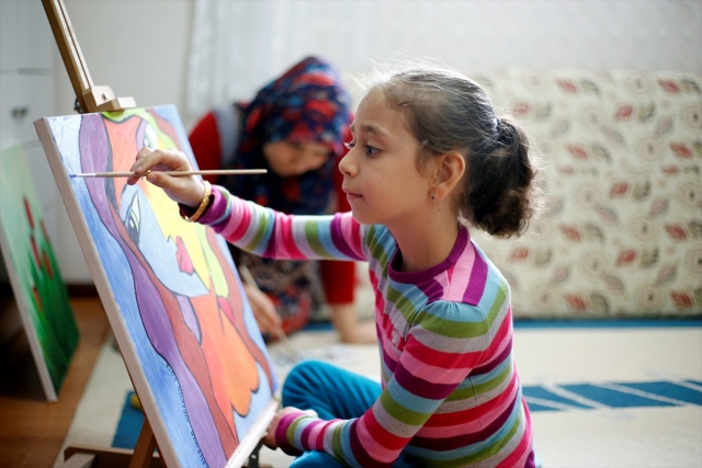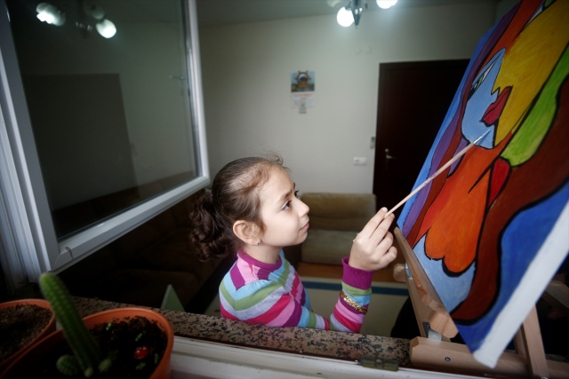Antalya'da yakalandığı karaciğer kanserini nakille yenen ve enfeksiyon riski nedeniyle evde eğitim gören 8 yaşındaki Şerife Nur Aydemir, "Evde Sanatımla Ben de Varım" adlı projeyle hayallerini tuvale yansıtıyor. Aydemir, evdeki bir resmini tamamlıyor.