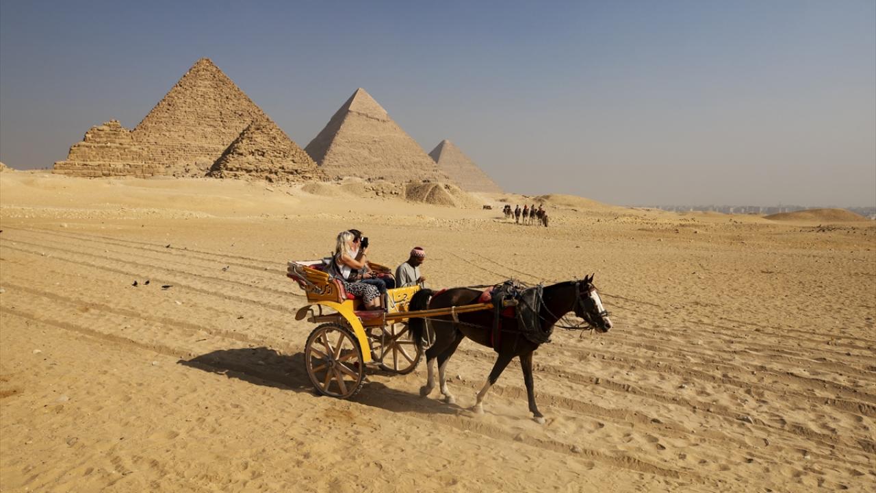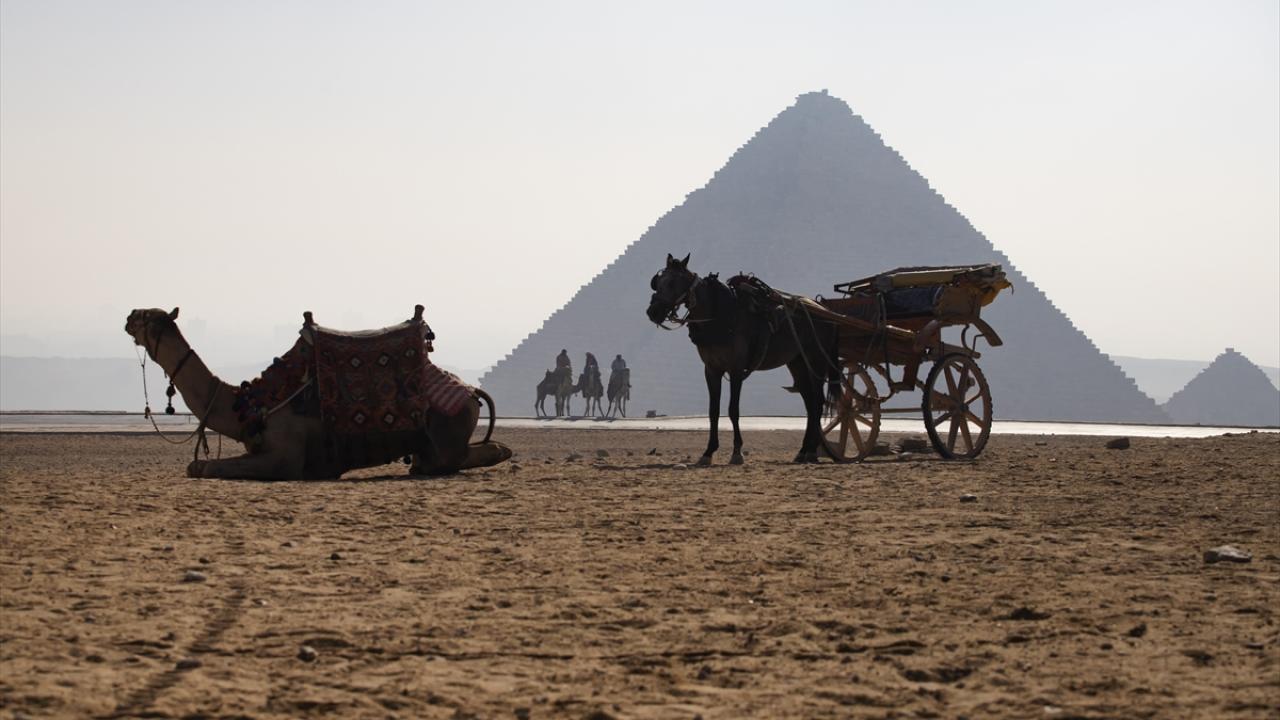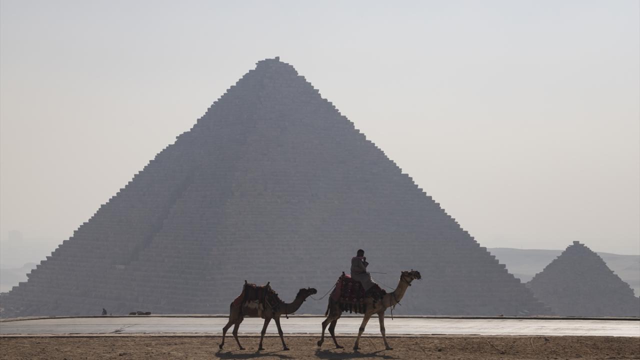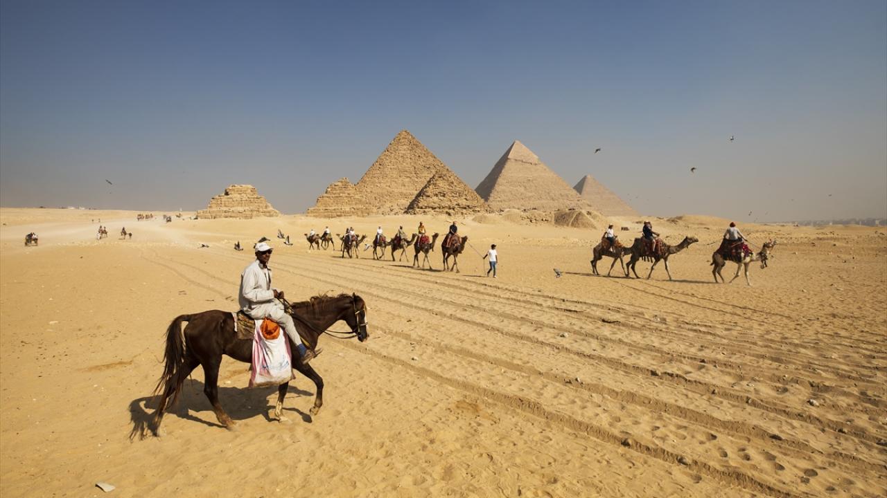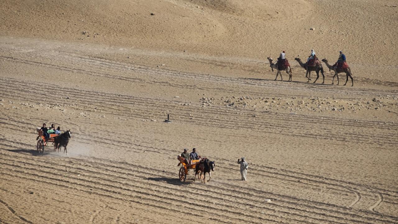 Ziyaretçiler, piramitlerin bulunduğu alanda develerle yolculuk yapıyor.
