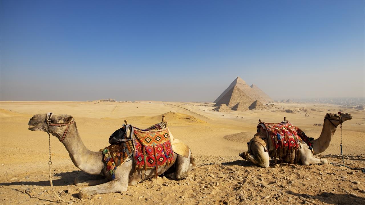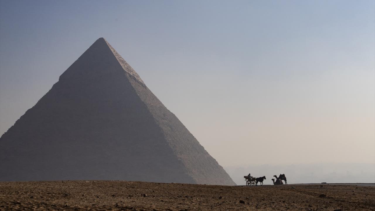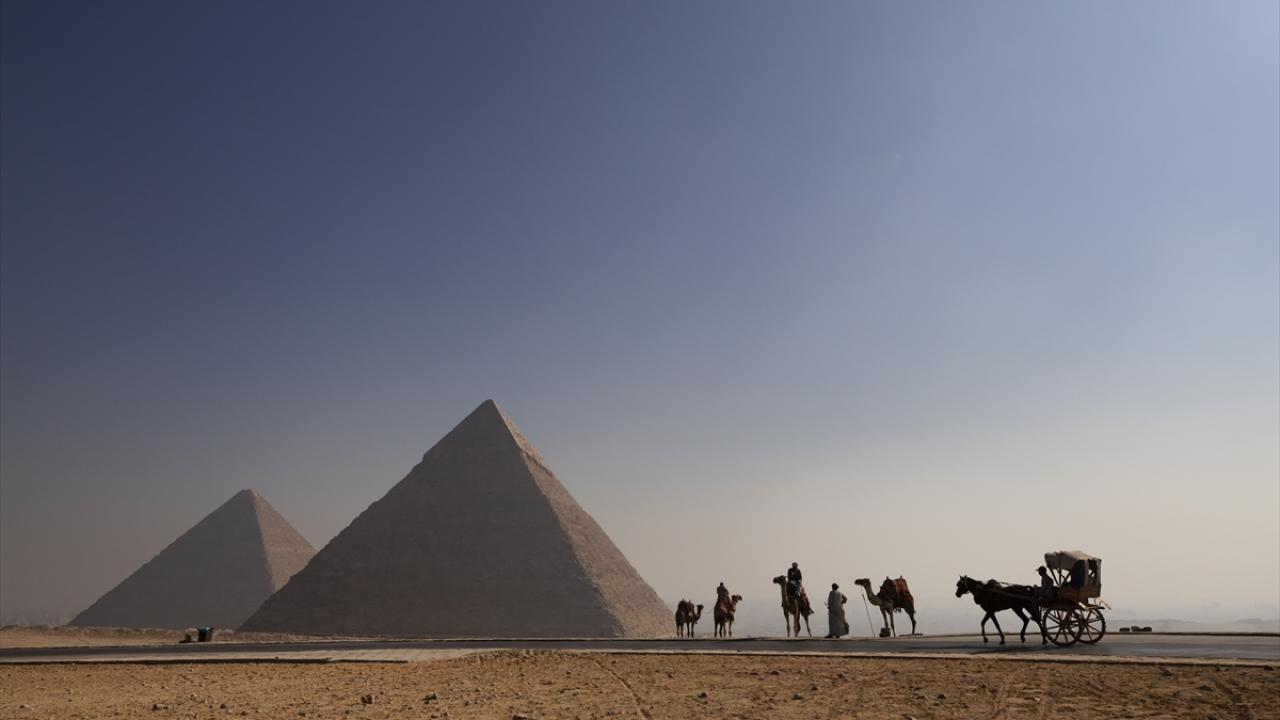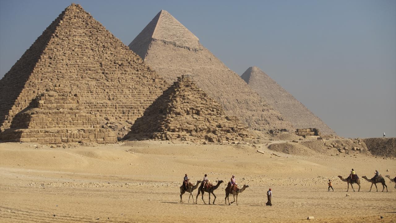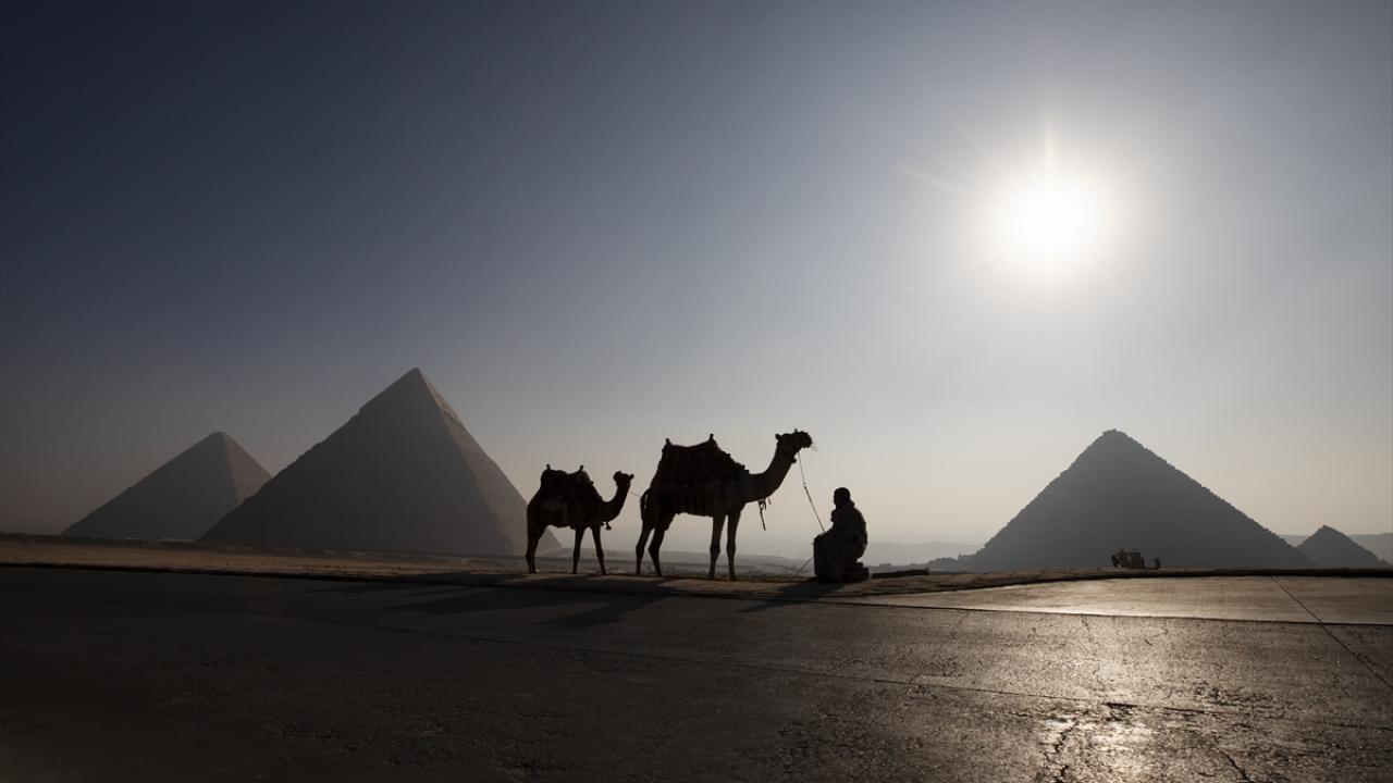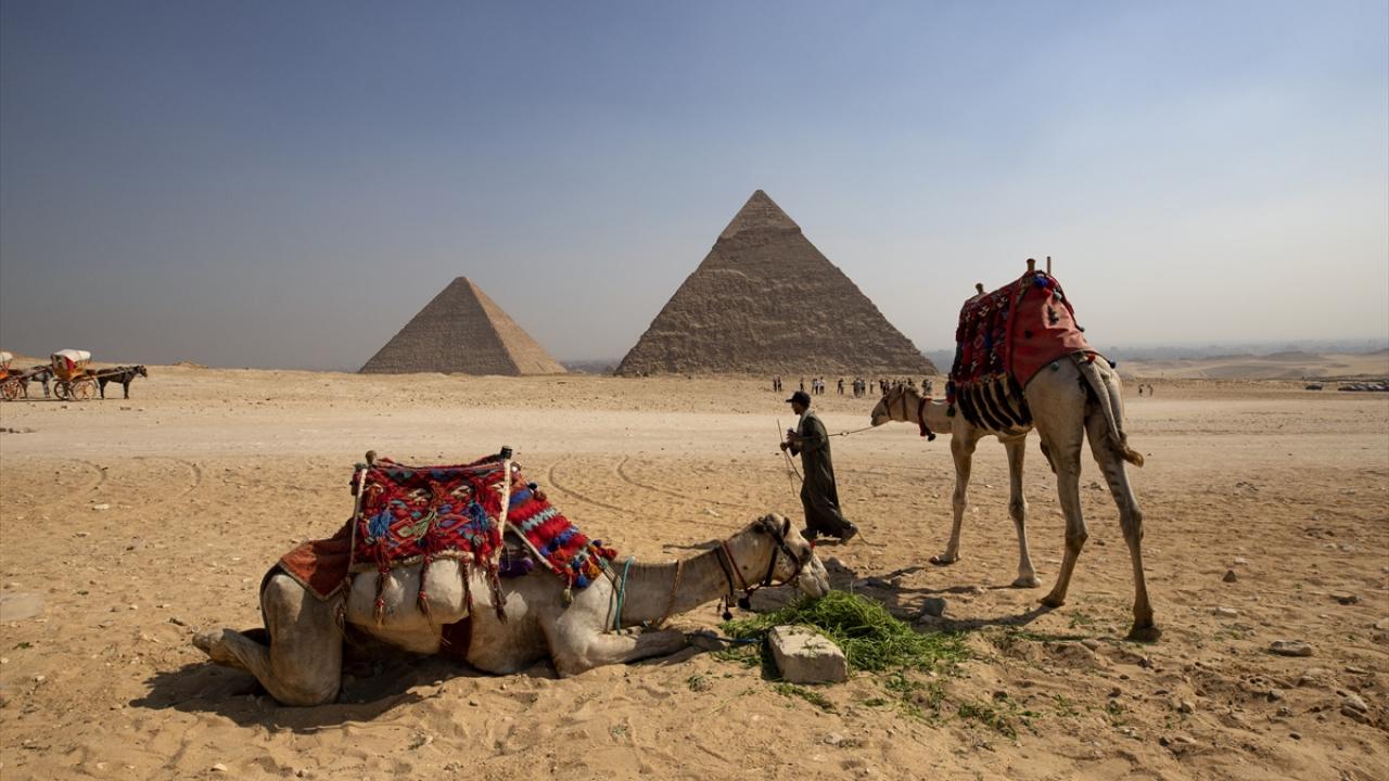 Ziyaretçiler, piramitlerin bulunduğu alanda develerle yolculuk yapıyor.
