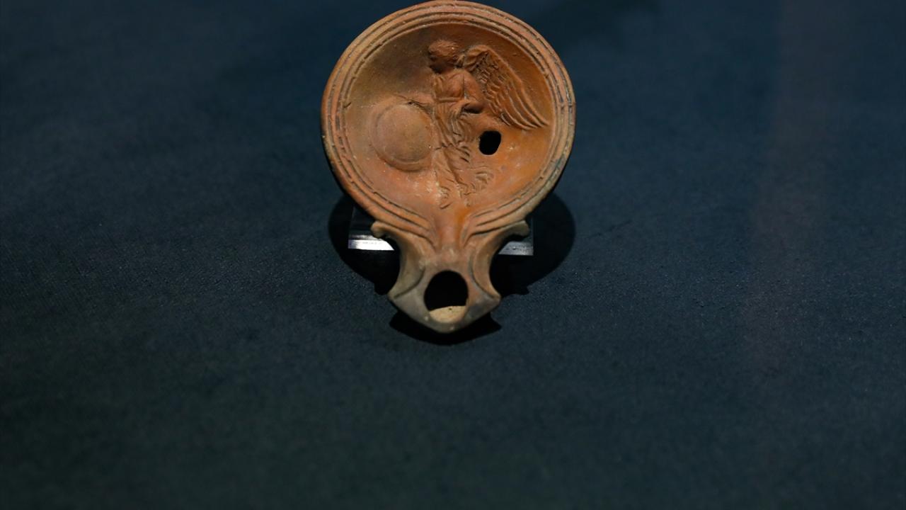 Serginin ikinci parçası olan Muğla`nın Milas ilçesindeki İasos Antik Kenti`nden çıkarılan pişmiş topraktan kandilde de Nike kabartması bulunuyor.