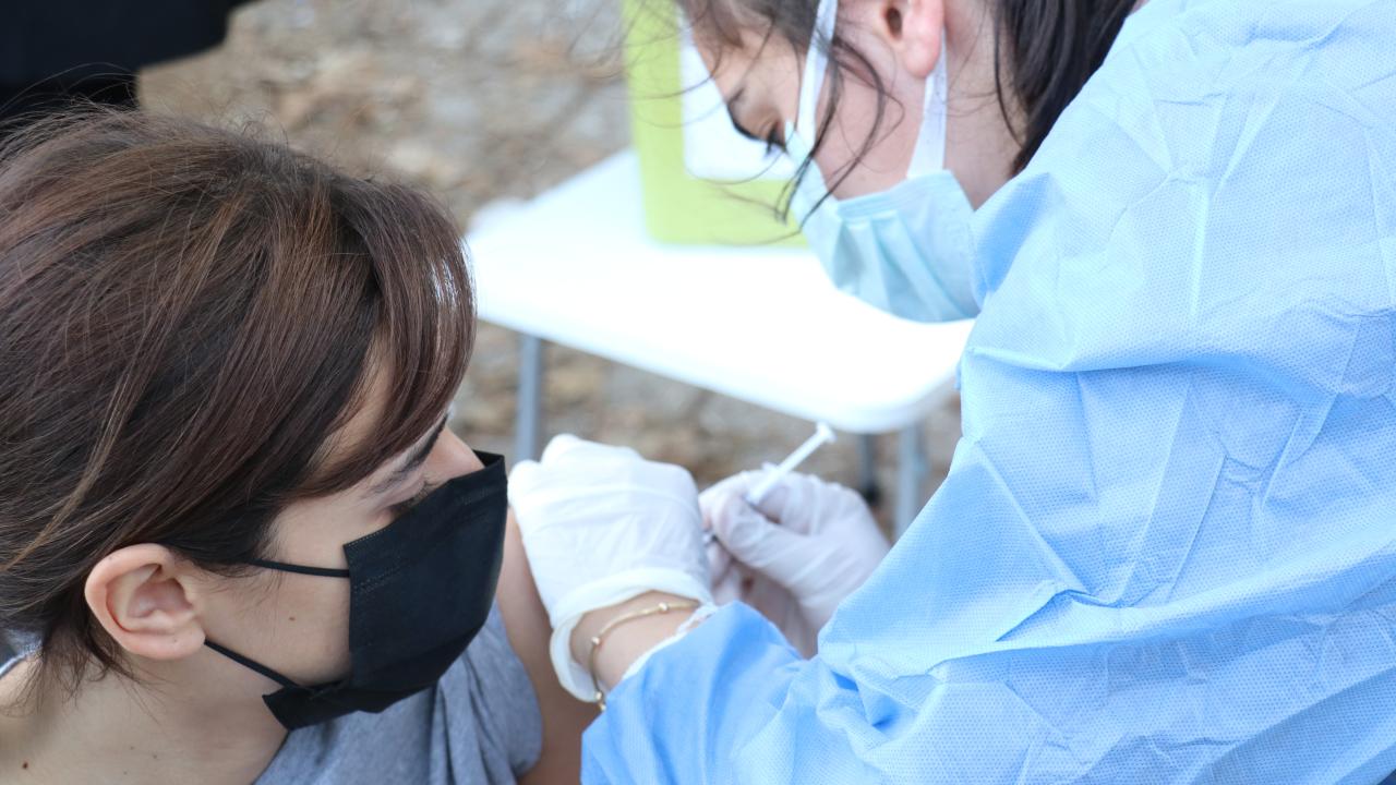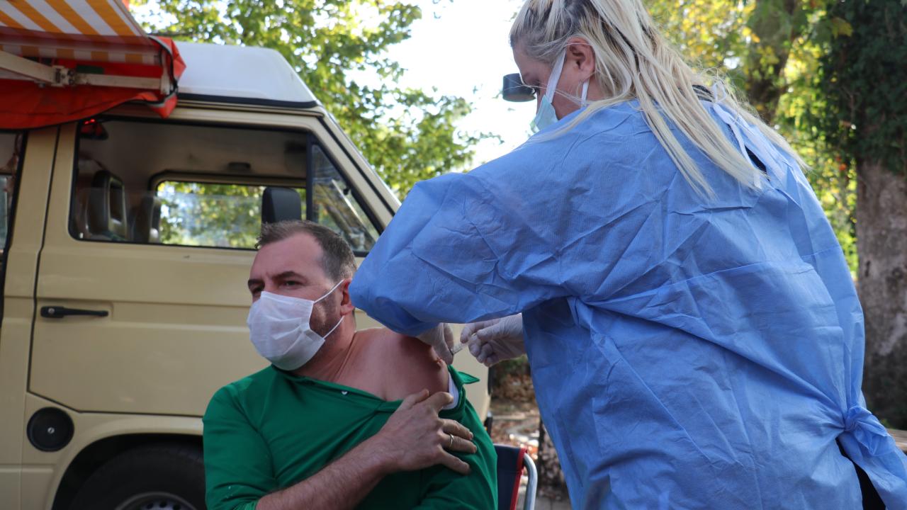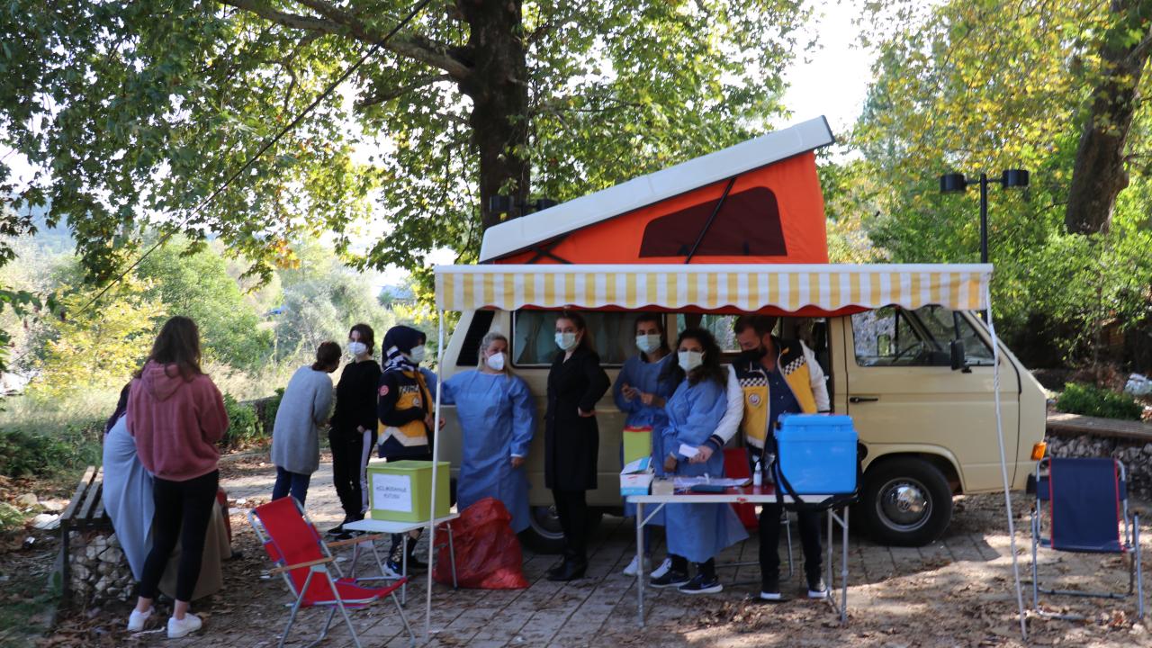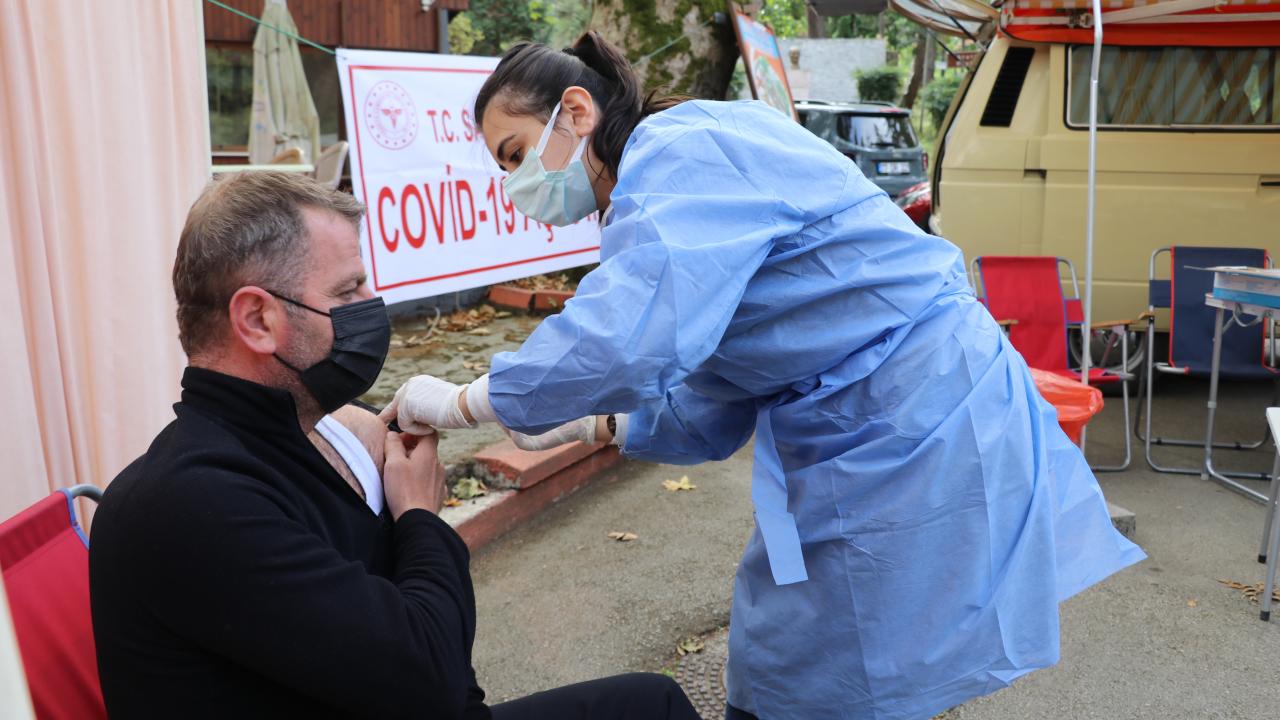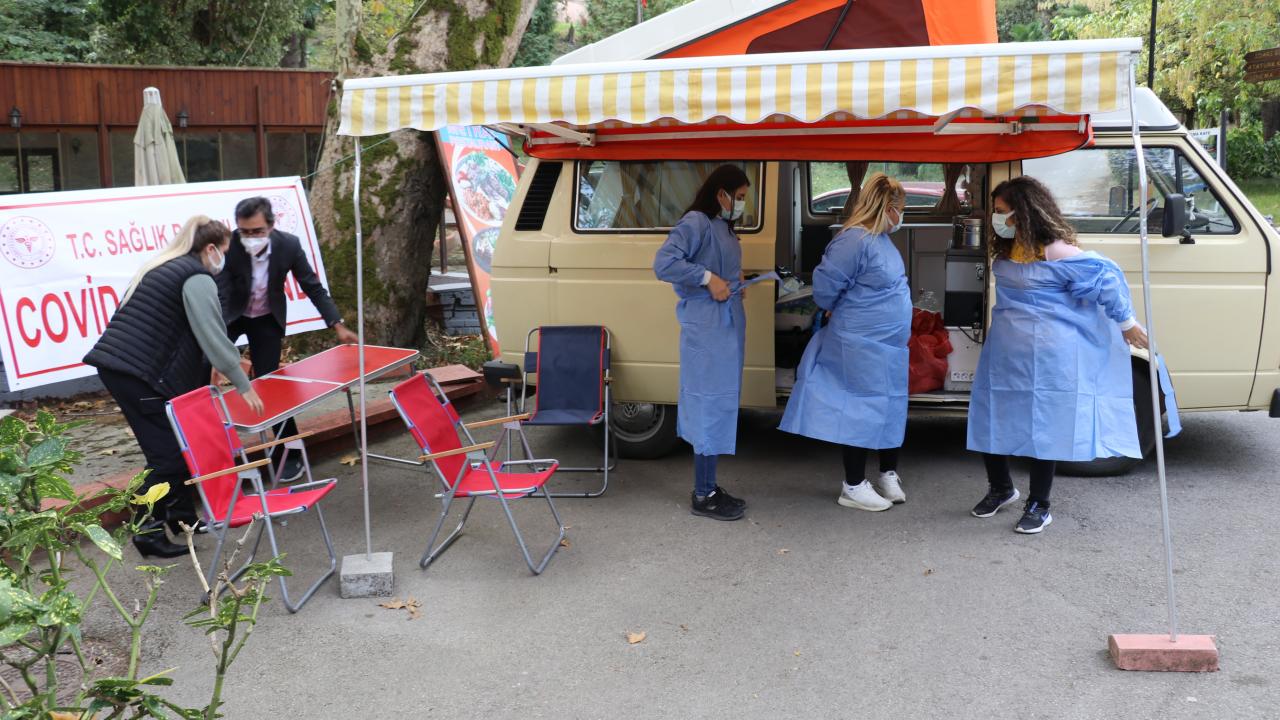Tentesi, kamp masa ve sandalyeleriyle dikkati çeken aracın yanına gelen vatandaşlarla görüşen sağlık ekibi, aşı olmak istemeyenleri de ikna edip onaylarını aldıktan sonra aşılıyor.