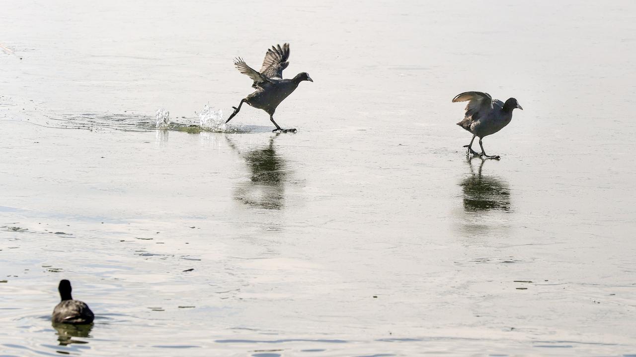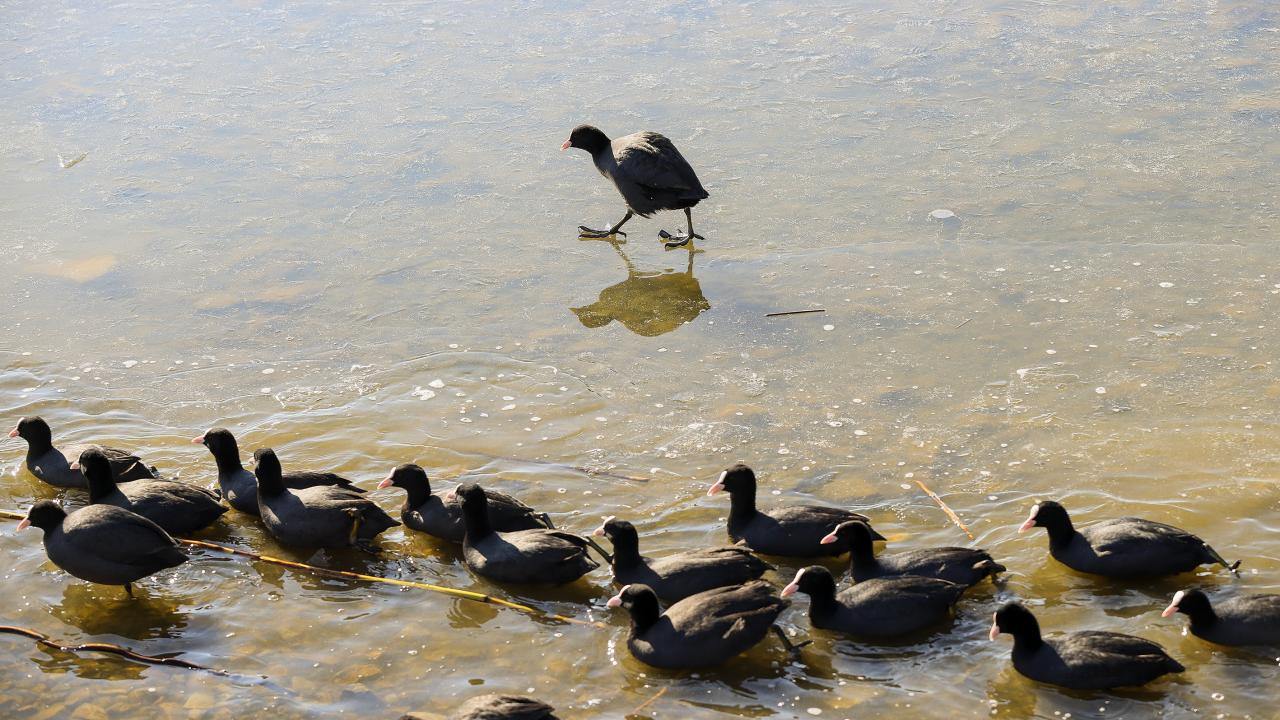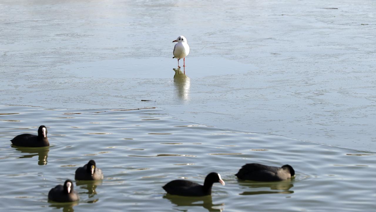 Ankara'da soğuk hava etkili olurken, Gölbaşı ilçesindeki Mogan Gölü'nde yaşayan sakarmeke kuşları, bazı bölümleri buz tutan gölde yiyecek bulmaya çalıştı.