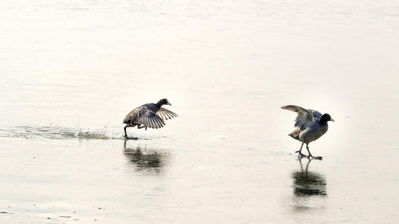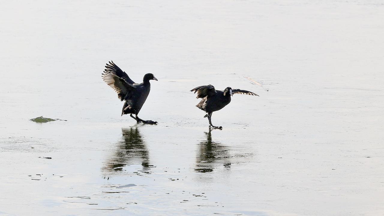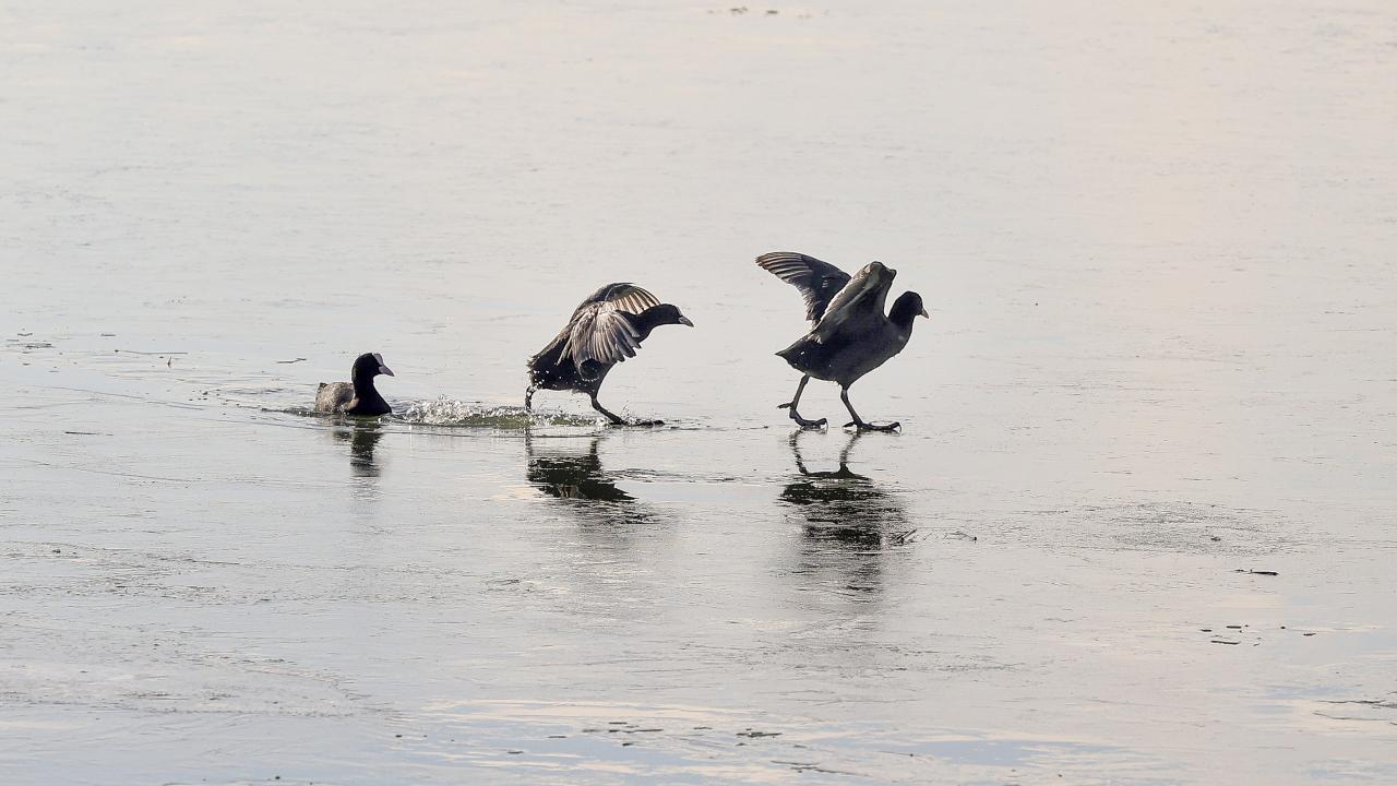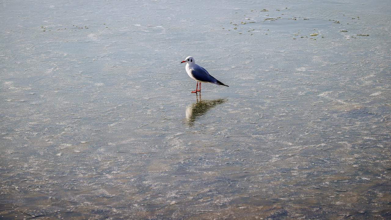 Ankara'da soğuk hava etkili olurken, Gölbaşı ilçesindeki Mogan Gölü'nde yaşayan sakarmeke kuşları, bazı bölümleri buz tutan gölde yiyecek bulmaya çalıştı.
