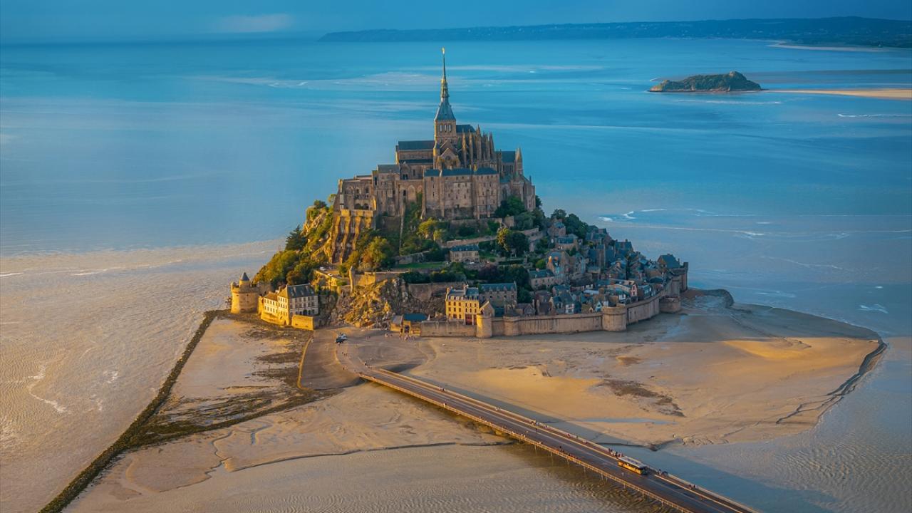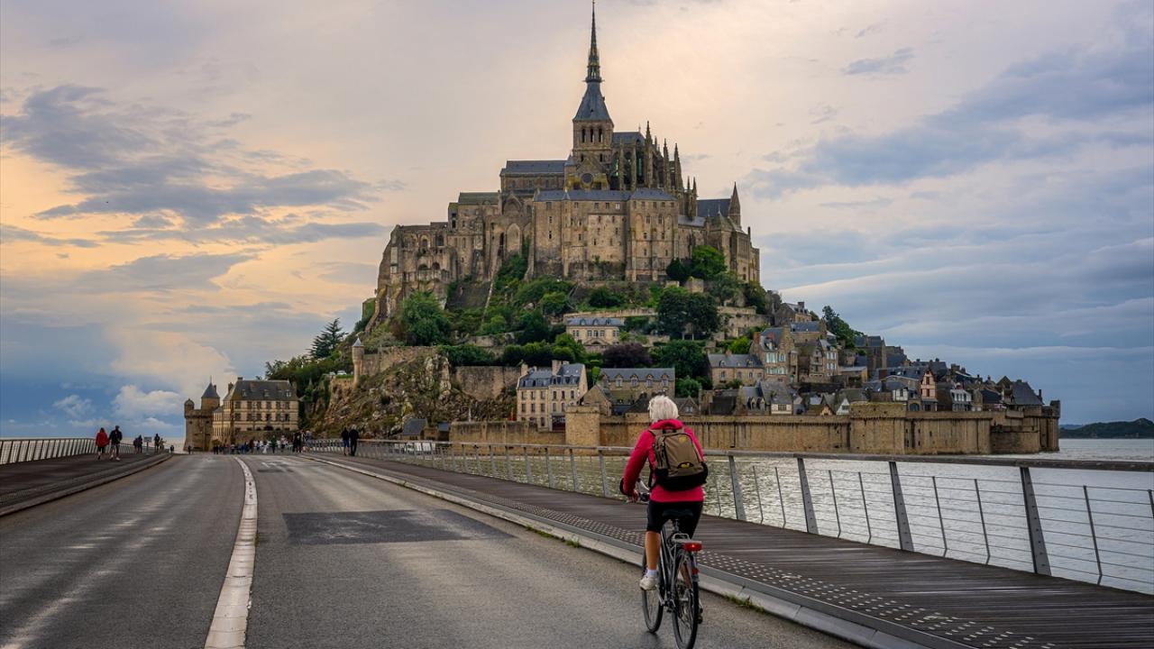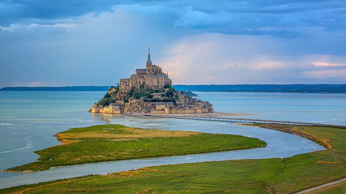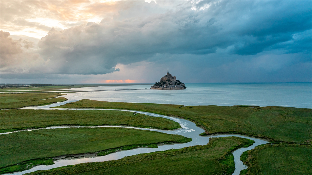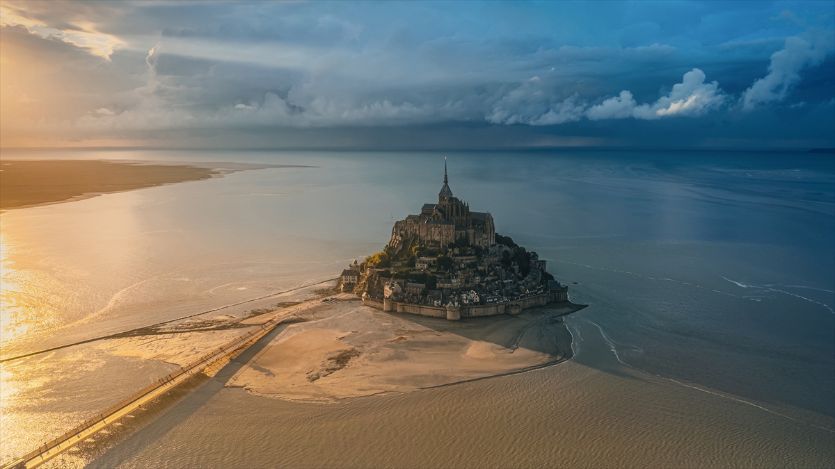 Mont Saint-Michel, metcezir (gelgit) nedeniyle denizin çok yükseldiği zamanlarda ada görünümünü alıyor.