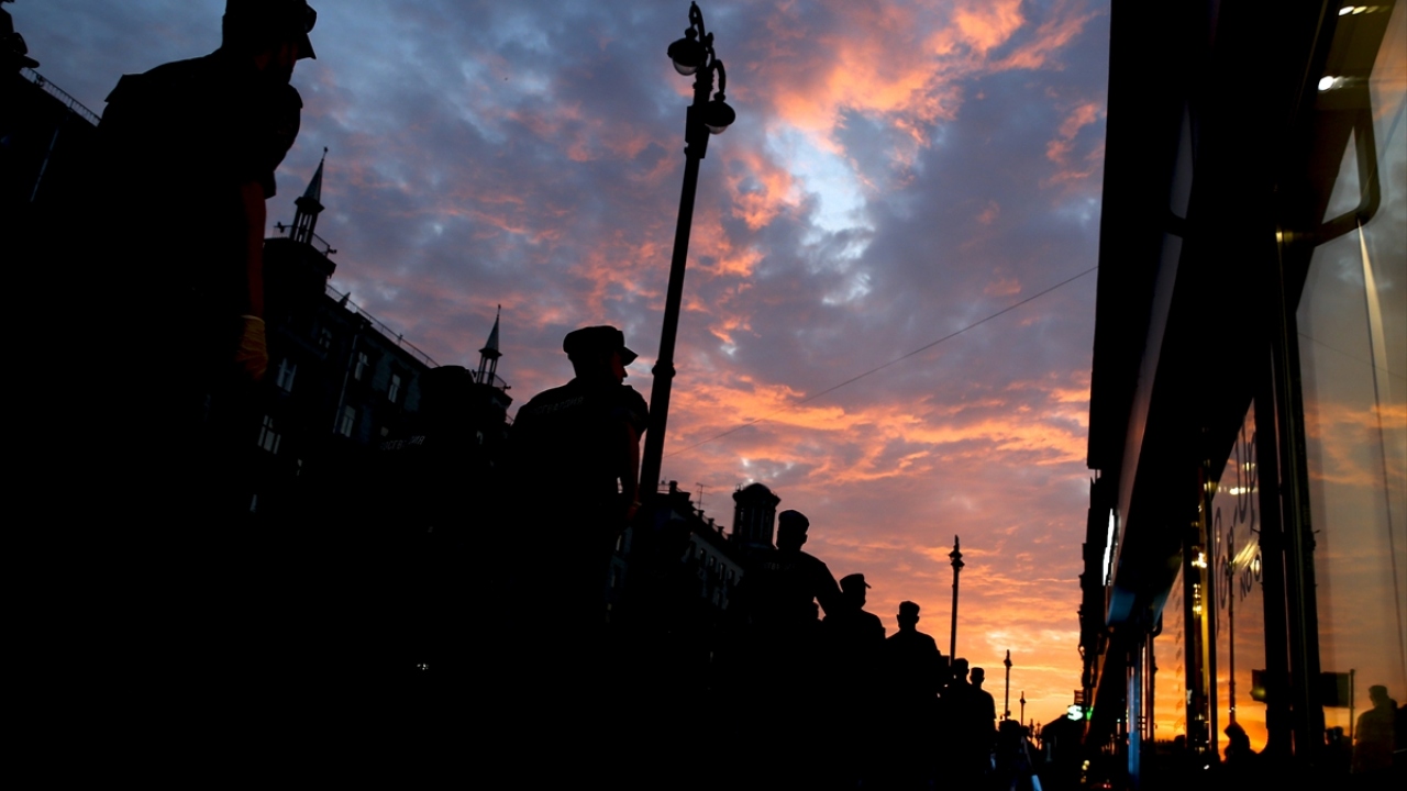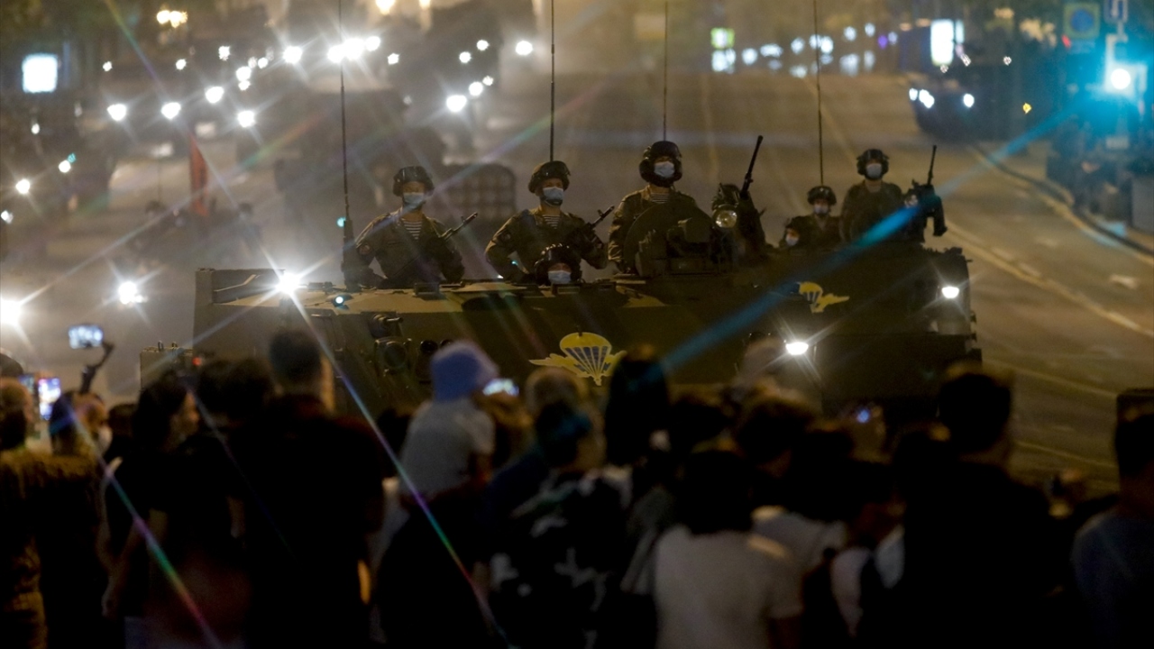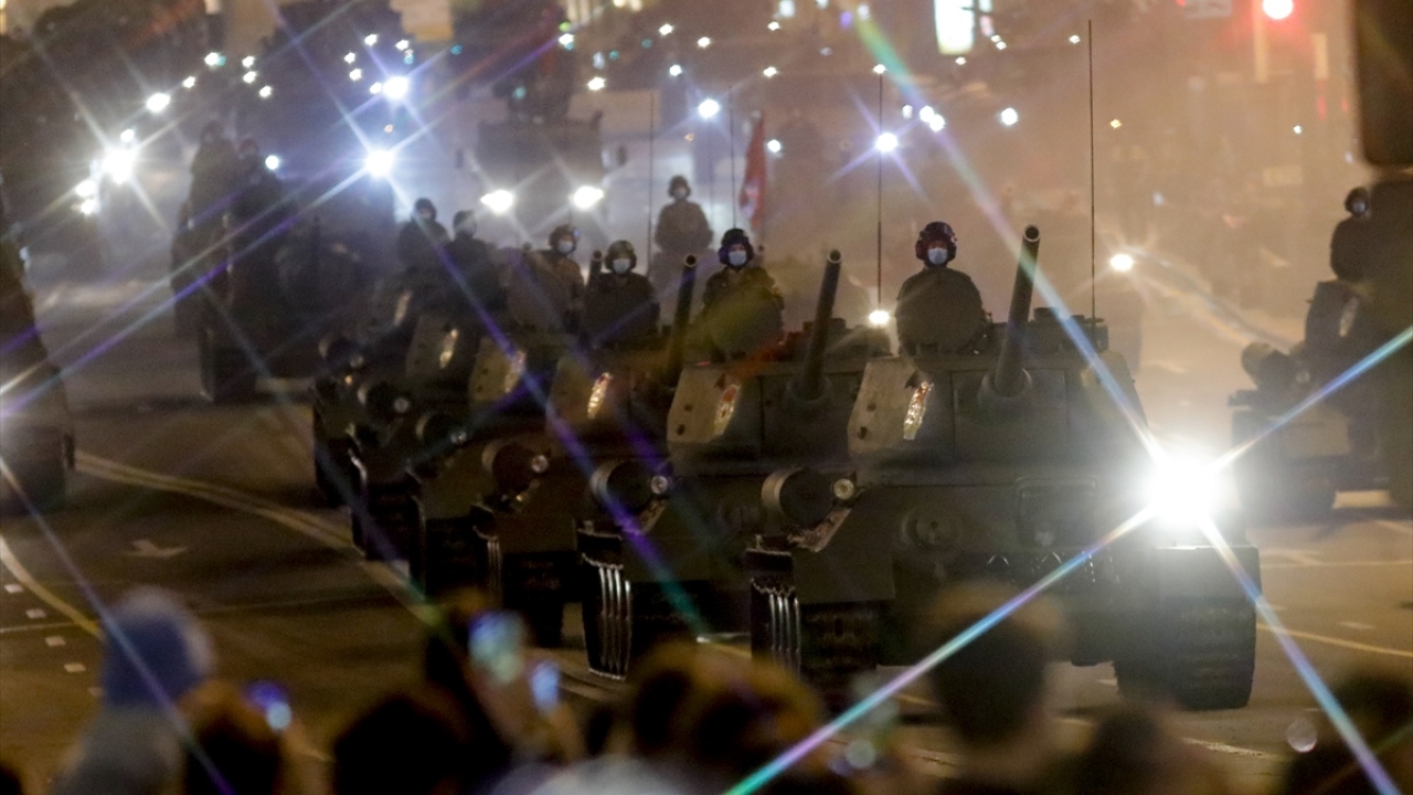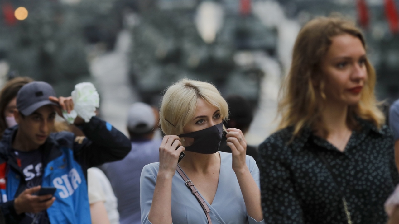 Covid-19 tedbirleri kapsamında medikal eldiven ve maske takan askerlerin kullandığı askeri araçlar, Tverskoy Caddesi’nden tarihi Kızıl Meydan’a ulaştı.