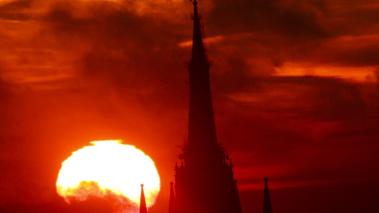 Rusya'nın başkenti Moskova'da güneş, yeni gün için 1947-1953 yılları arasında inşa edilen yedi gökdelenden biri olan ve Stalinist mimari tarzına sahip Kudrinskaya Meydanı binası üzerinden yükseldi.