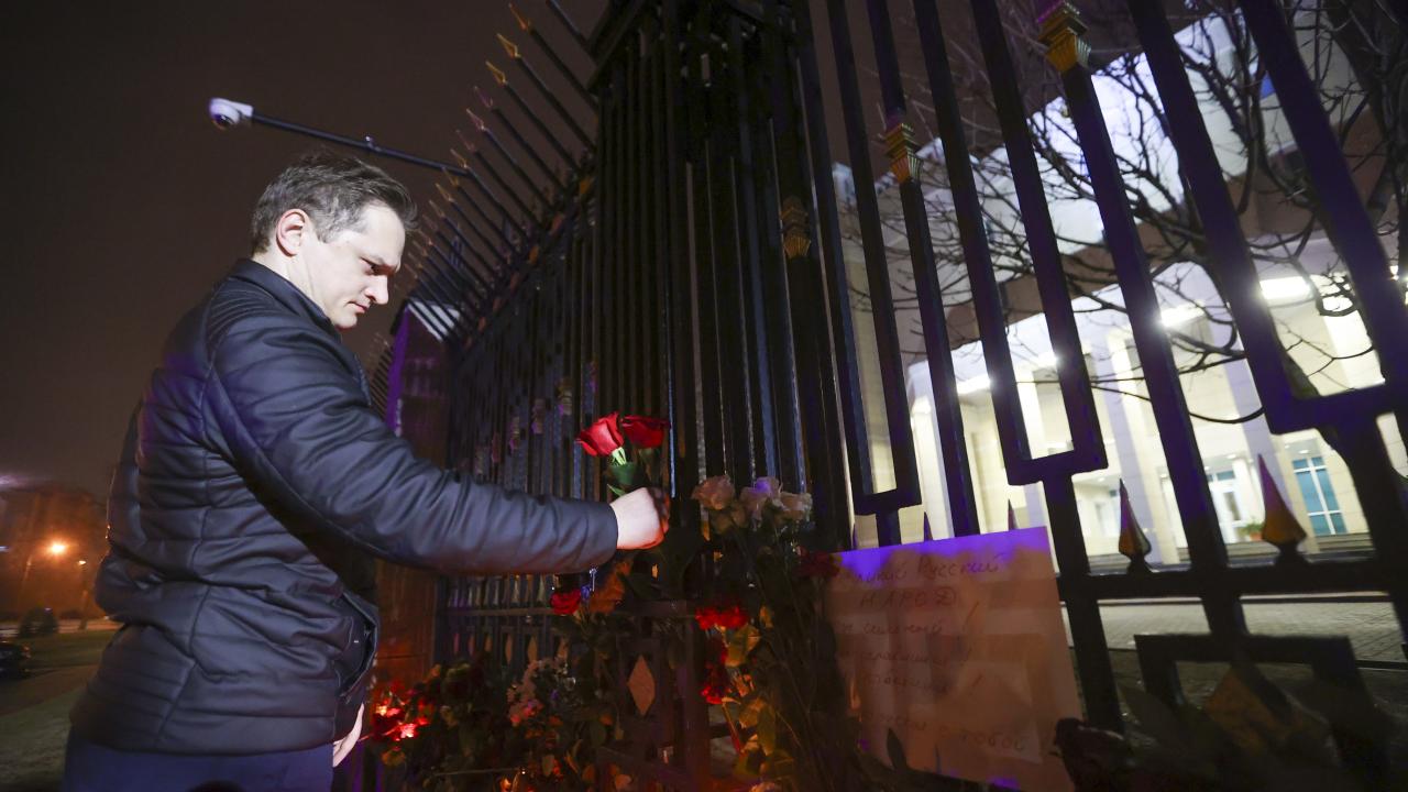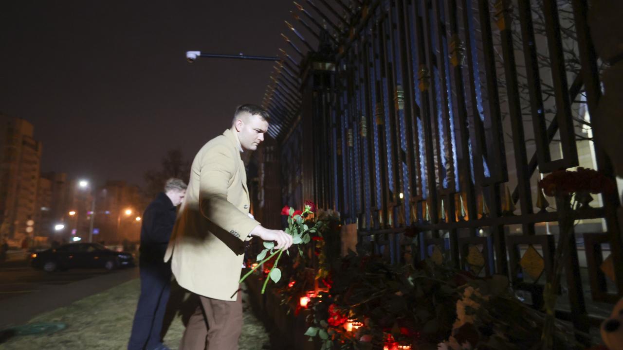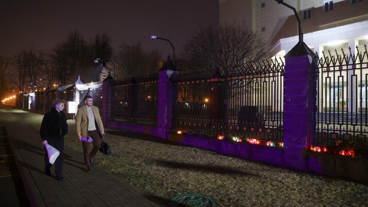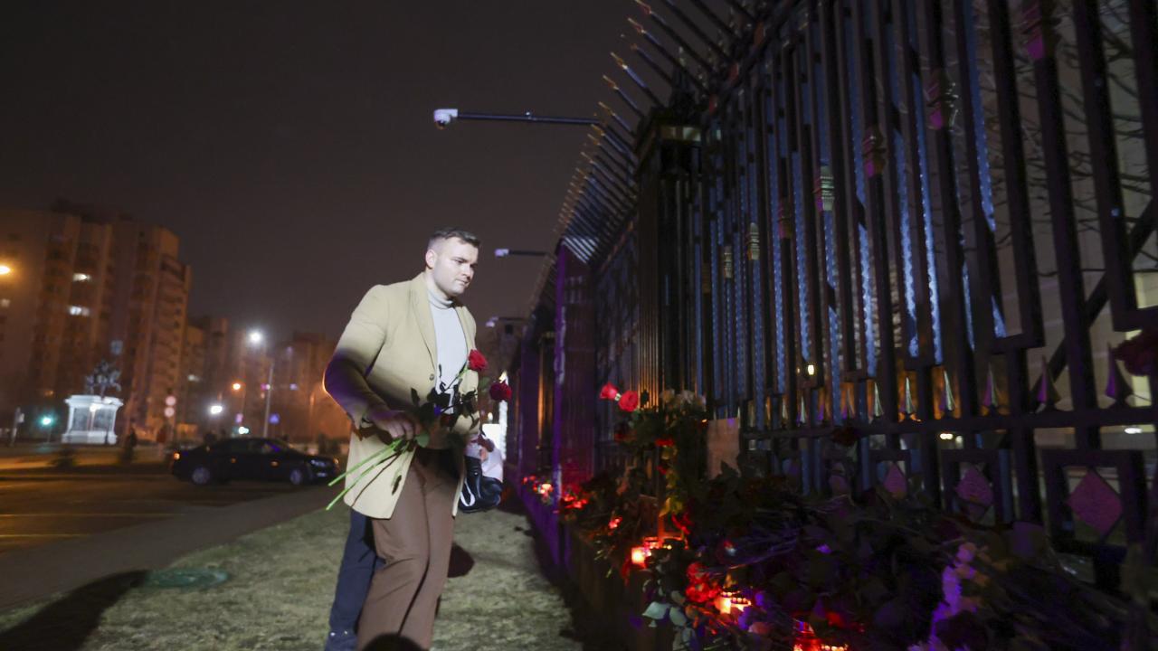 Rusya’nın başkenti Moskova’da Crocus City Hall adlı konser salonuna silahlı kişilerce düzenlenen saldırının ardından hayatını kaybedenlerin yasını tutmak amacıyla Rusya'nın Minsk Büyükelçiliği binasının önüne çiçek bırakılarak mum yakıldı.
