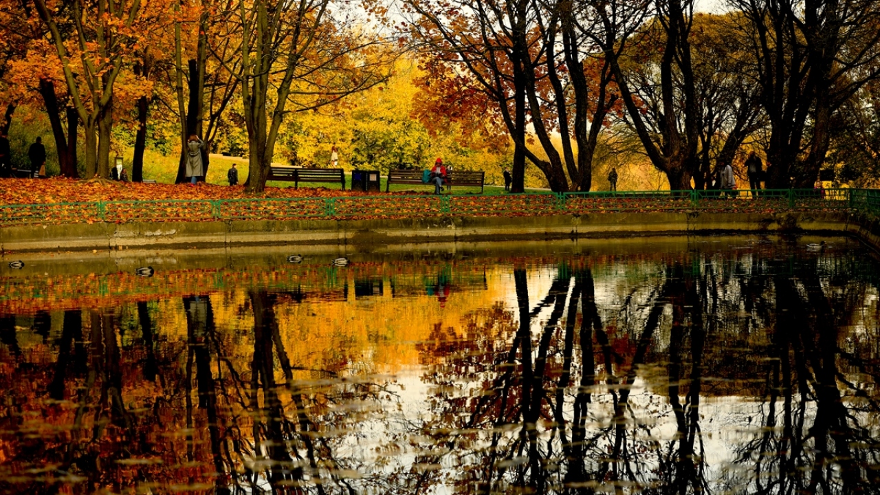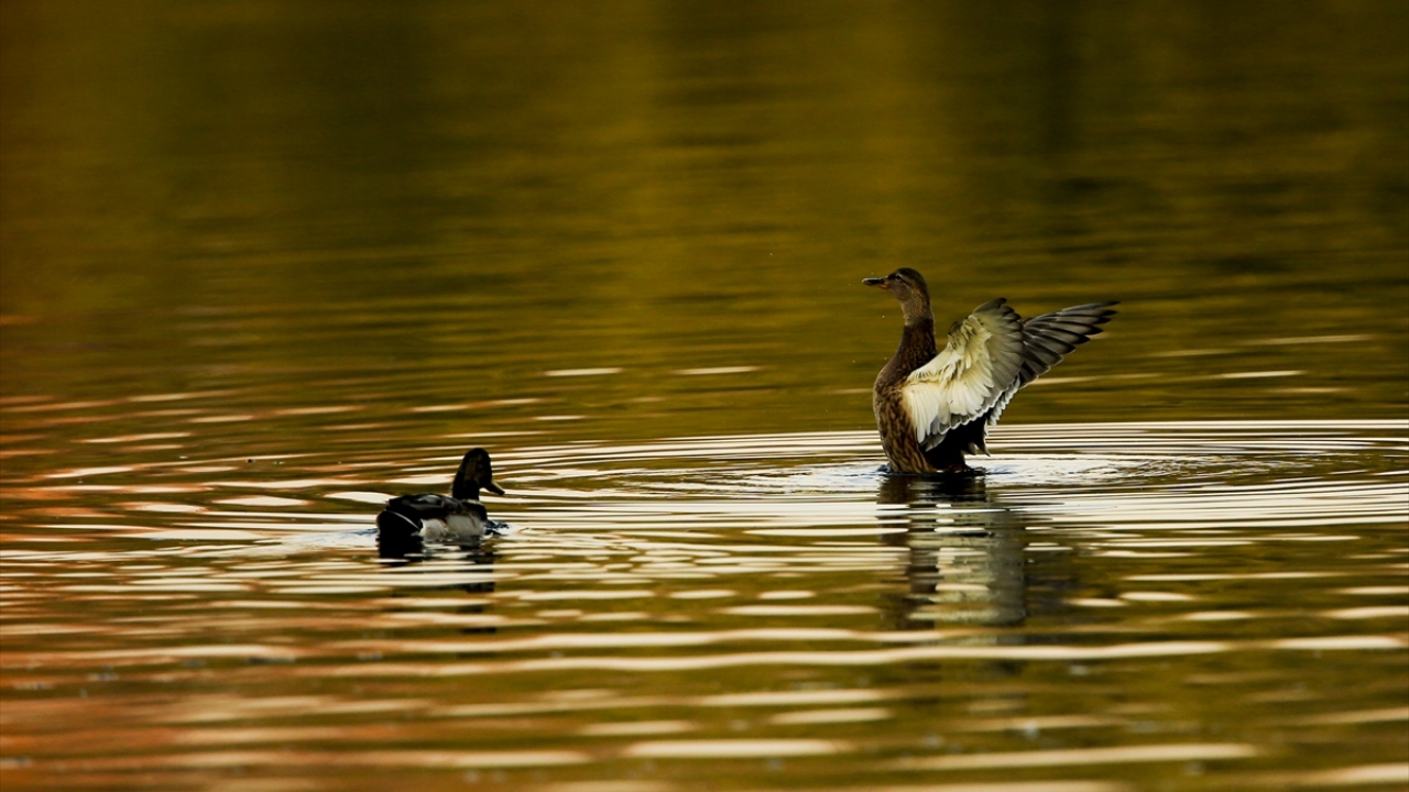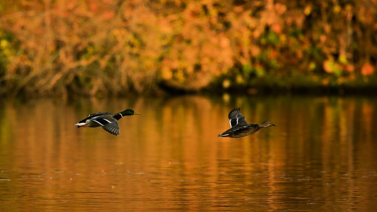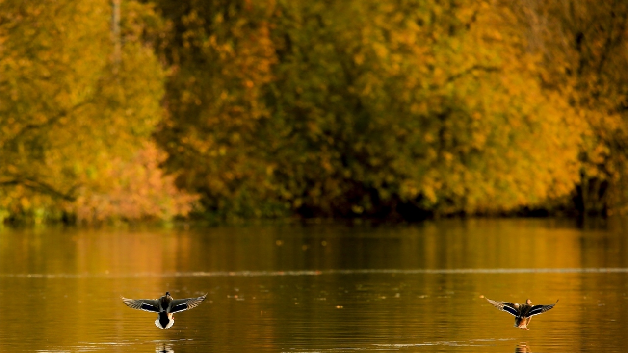 Sonbahar renklerinin yansıdığı nehrin üzerinde uçuşan kuşlar, parkı ziyaret edenlerin ilgisini çekiyor.