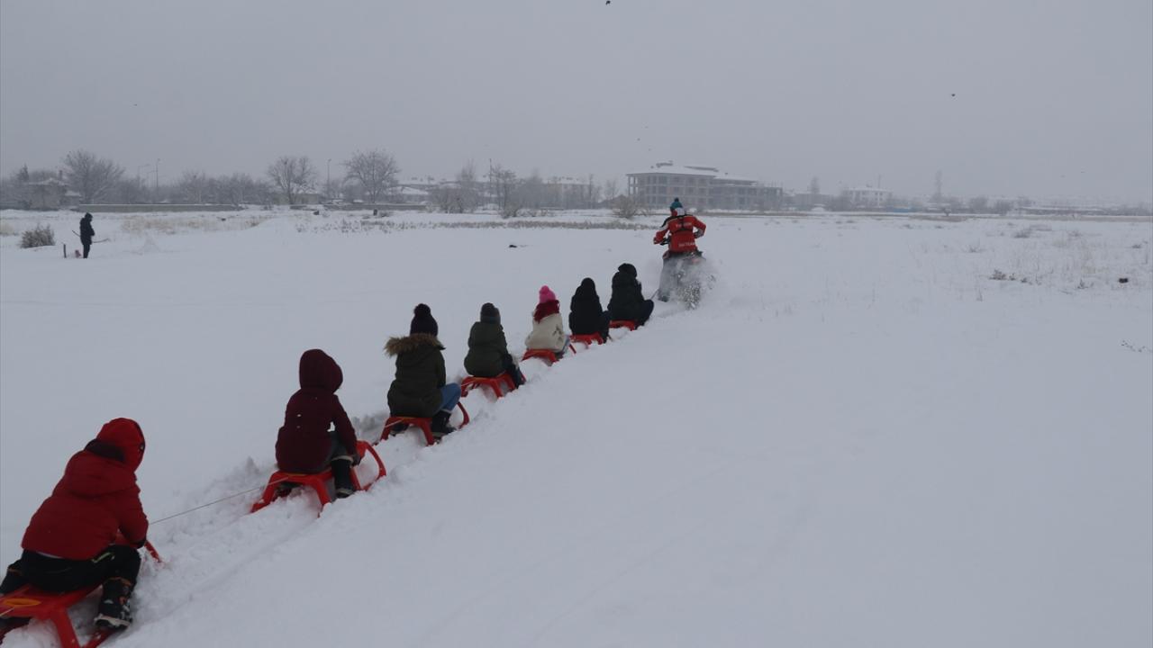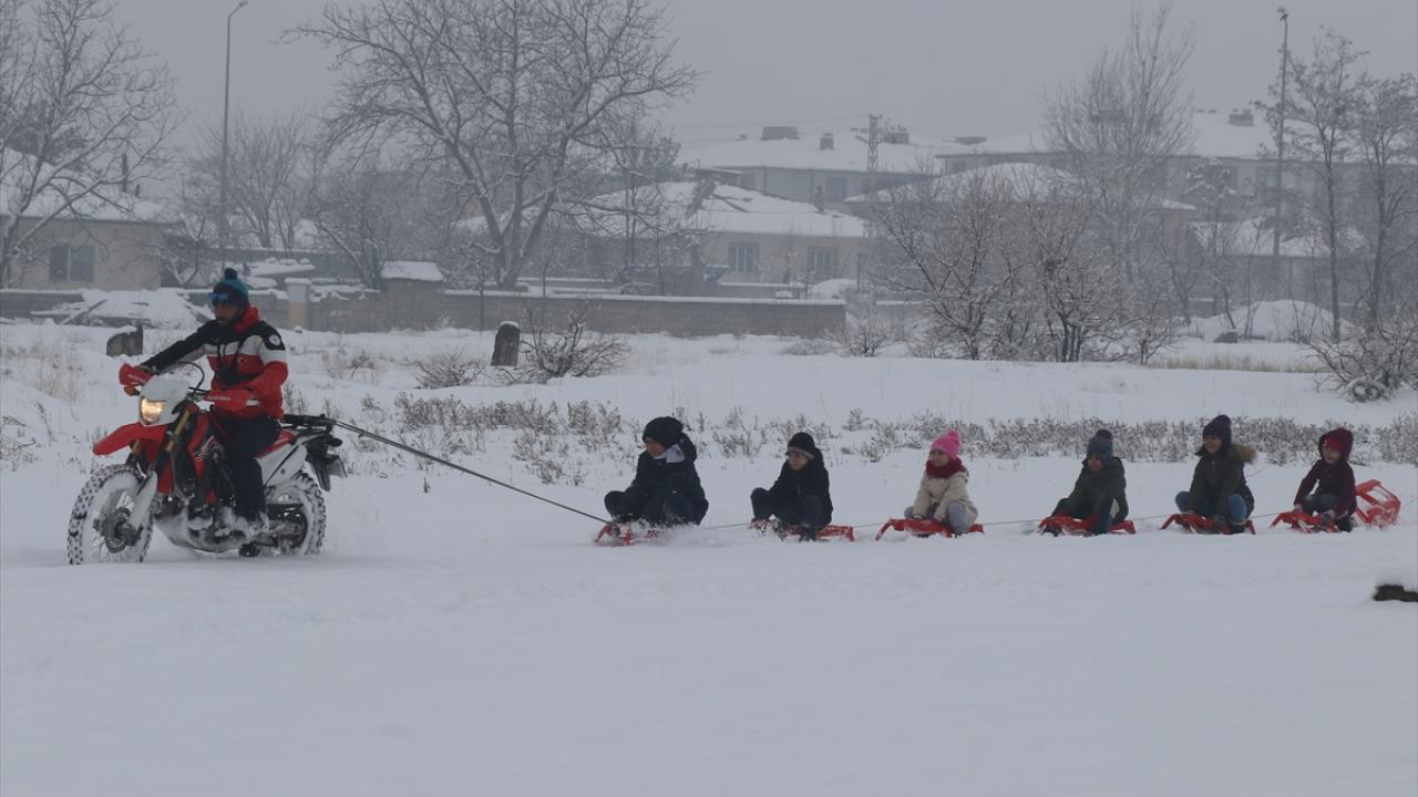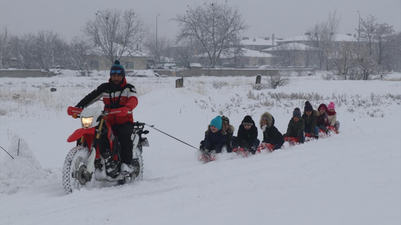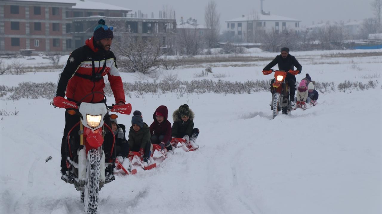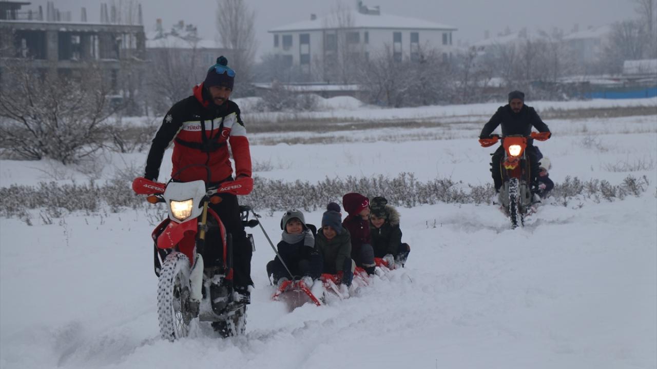 Kros motorunun arkasına iple kızak bağlayan Atilla, motoruyla, kızağa binen çocukları kar üzerinde çekerek keyifli anlar yaşattı.