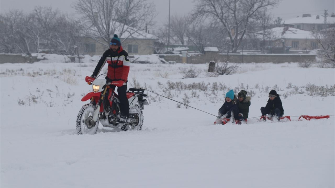 Kentte iki gündür etkisini sürdüren kar ve olumsuz hava koşulları yüzünden eğitime bugün ara verilince motosiklet tutkunu Canser Atilla, Menderes Mahallesi`nde çocuklarla bir araya geldi.