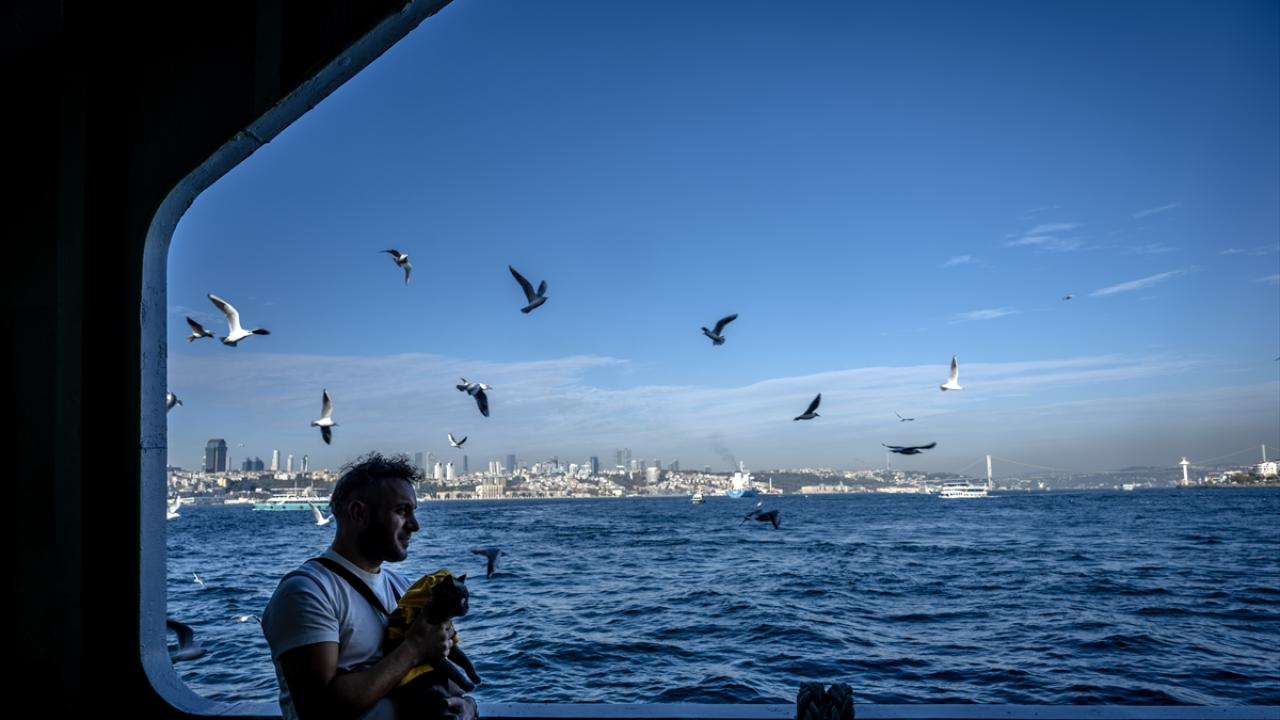 Rüzgarla hareket eden tüyleriyle motosikletin önünde tarihi kenti izleyen "Gofret", arabalı feribotta da sahibiyle martıları besleyip Boğaz`ı seyretti.
