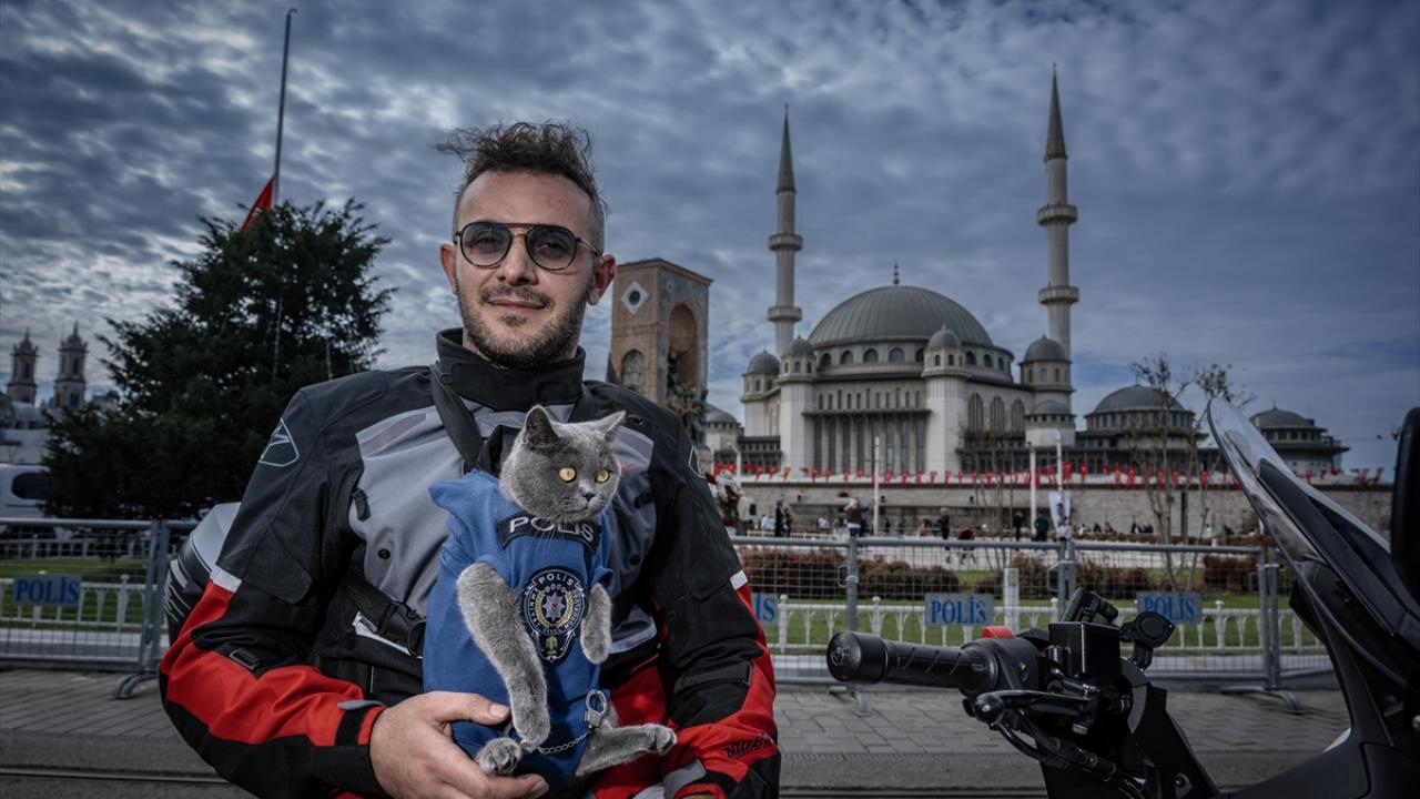 Motosikletli sahibinin göğsüne bağlı aparatta Muğla'nın Fethiye sokaklarında gezmeye alışan "Gofret" isimli kedi, polis, gelinlik ve arı gibi rengarenk kostümler giyip kaskını takarak, bu kez İstanbul'da dolaştı.