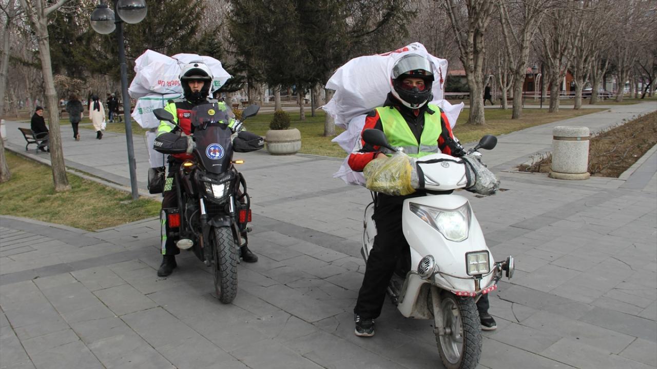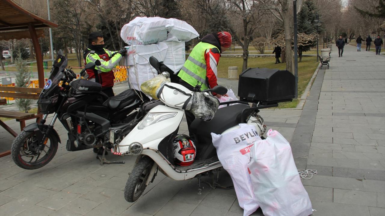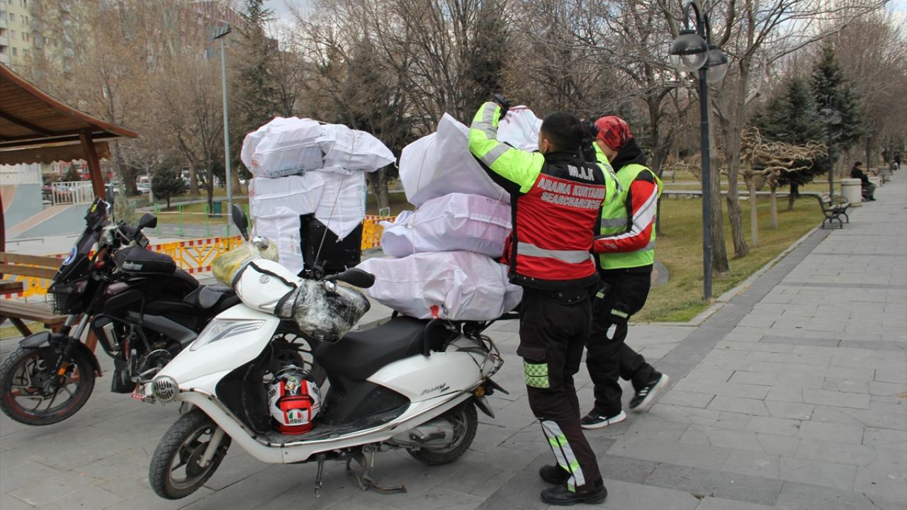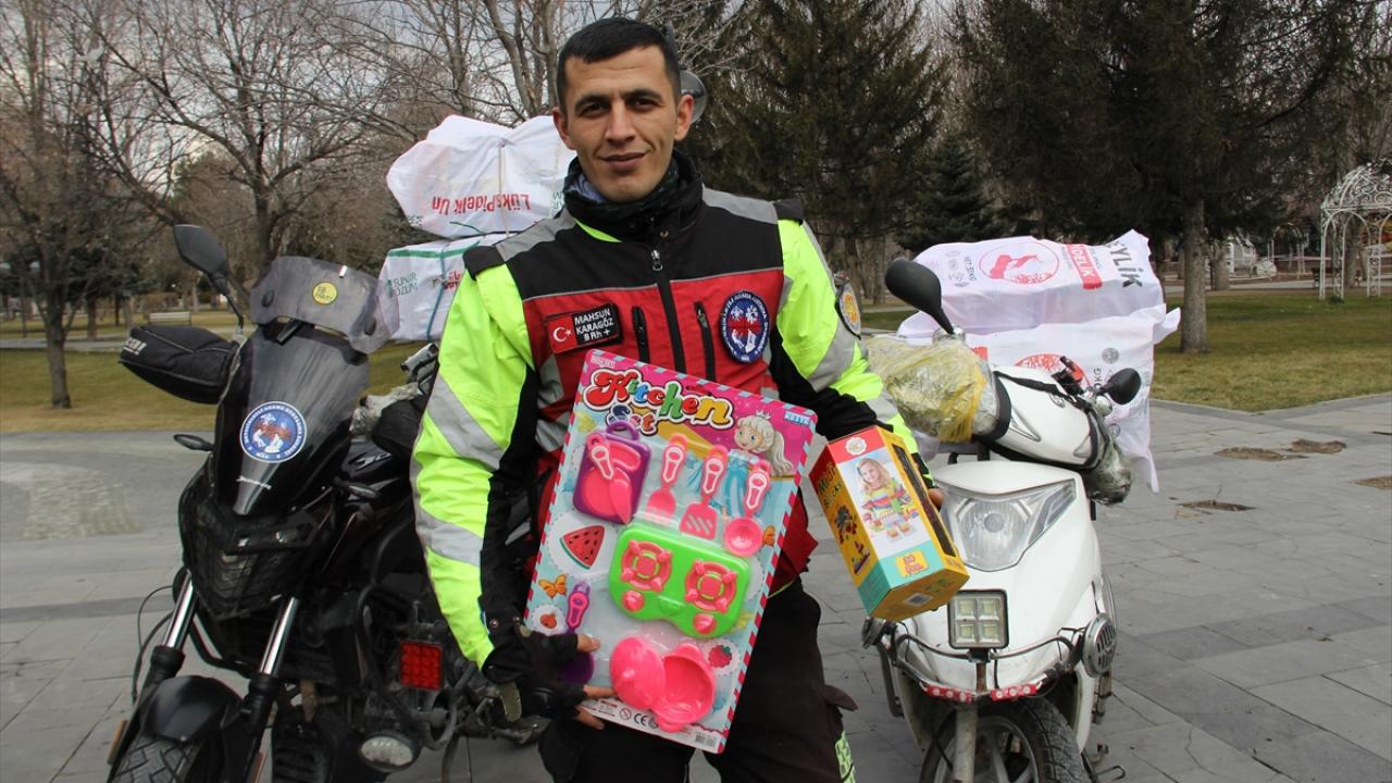 Kayseri'de bir restoranda motosikletli kurye olarak çalışan Mahsun Karagöz ve Taşkın İlbay, depremzede çocuklar için topladıkları oyuncakları Hatay'a götürdü.