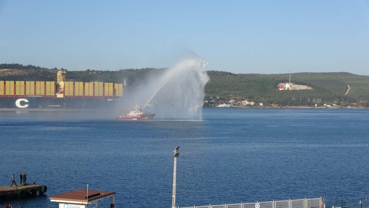 Römorkörler su gösterisiyle gemiyi selamladı. Dev geminin geçişi sırasında güvenlik gerekçesiyle Çanakkale Boğazı kuzeyden güneye saat 07.00 ile saat 12.30 arası trafiğe kapatıldı.