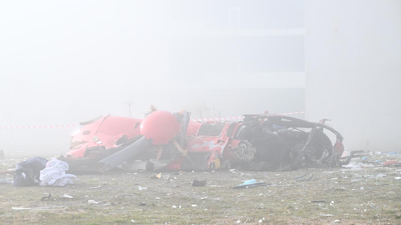 Helikopterden sızan yakıtın alev alması riskine karşı itfaiye ekipleri su sıkarak önlem alıyor.