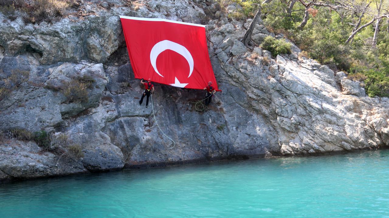 Suda dalgalanan Türk bayrağı, kayalık alana yaklaşınca JAK timi kayalardan sarkarak 2. Türk bayrağını da açtı.