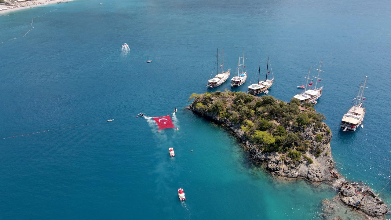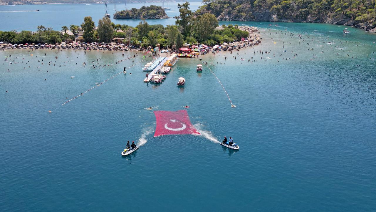 Daha sonra jet skiyle suya açılan 6 kişilik ekip, 12 metre uzunluğunda ve 8 metre genişliğindeki Türk bayrağını denizde yüzdürdü.