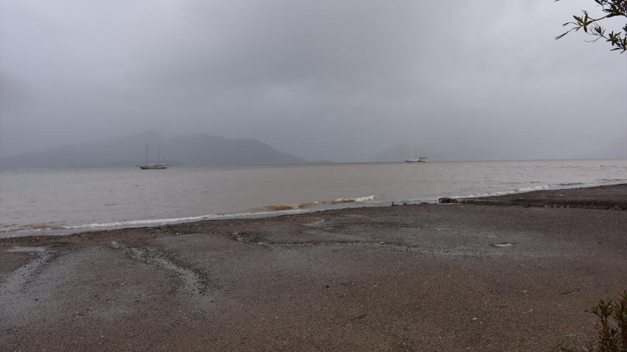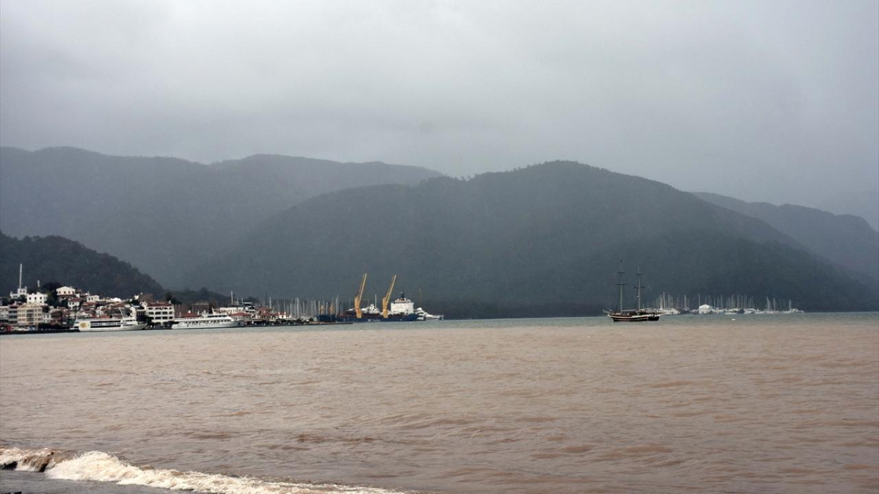 Marmaris`te sağanak sonrası yüksek kesimlerden gelen çamurlu su dolayısıyla denizin rengi kahverengiye dönüştü.