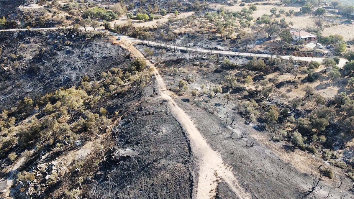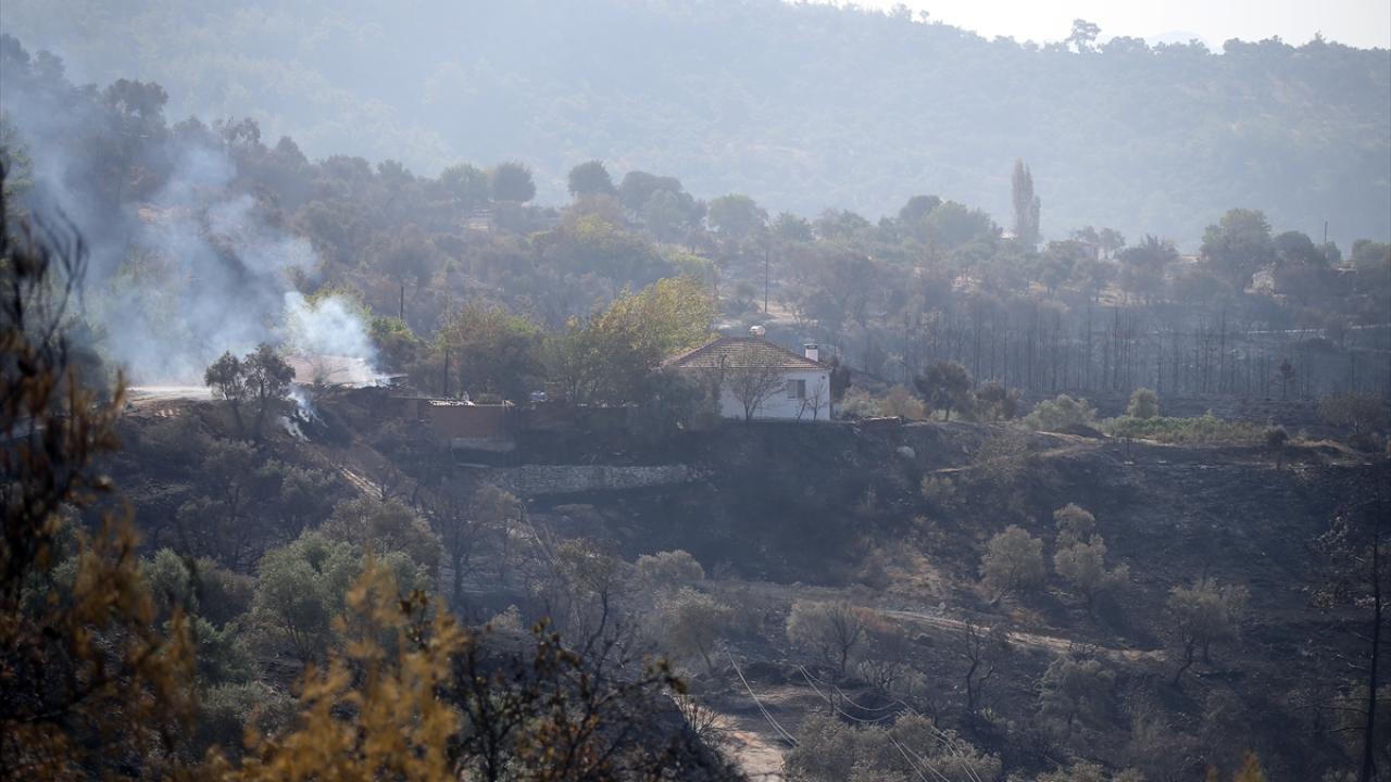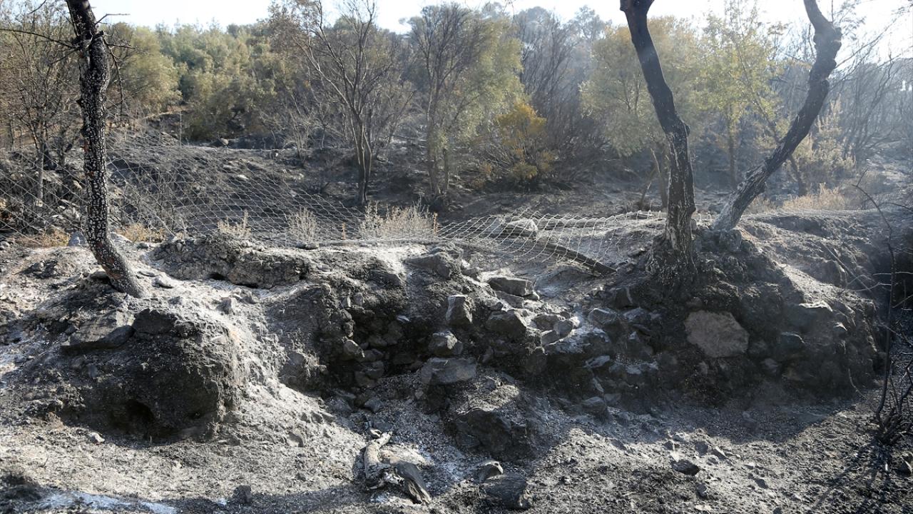 Yangında ilk belirlemelere göre yaklaşık 60 hektarlık ormanlık ve zeytinlik alan zarar gördü.