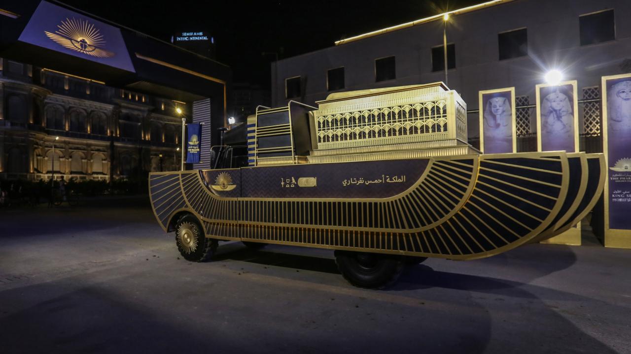 Mumyalar, her kral ve kraliçenin adına özel olarak hazırlanmış antik Mısır tarzında dekore edilmiş altın renkli araçlarla nakledildi.