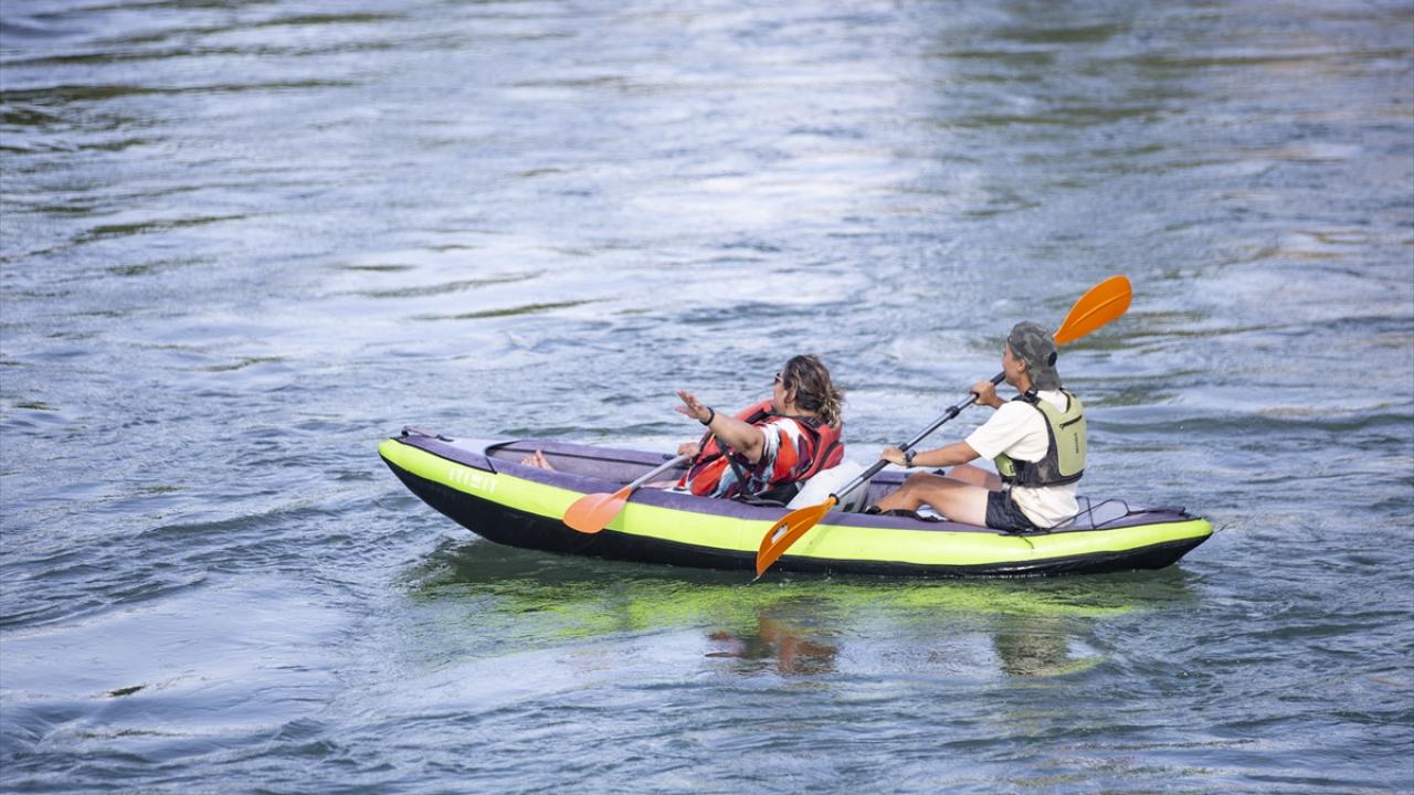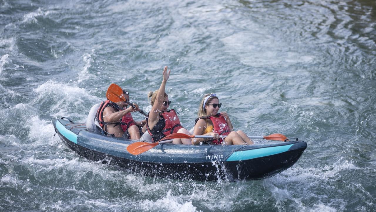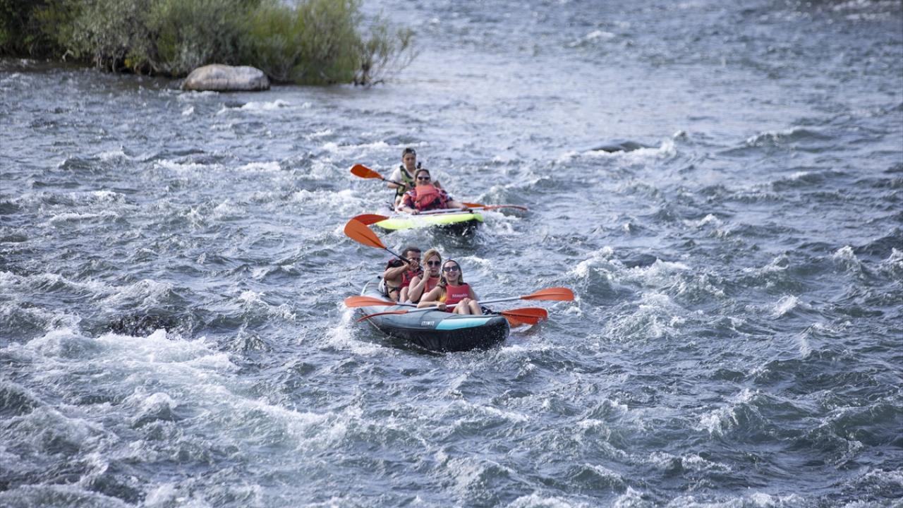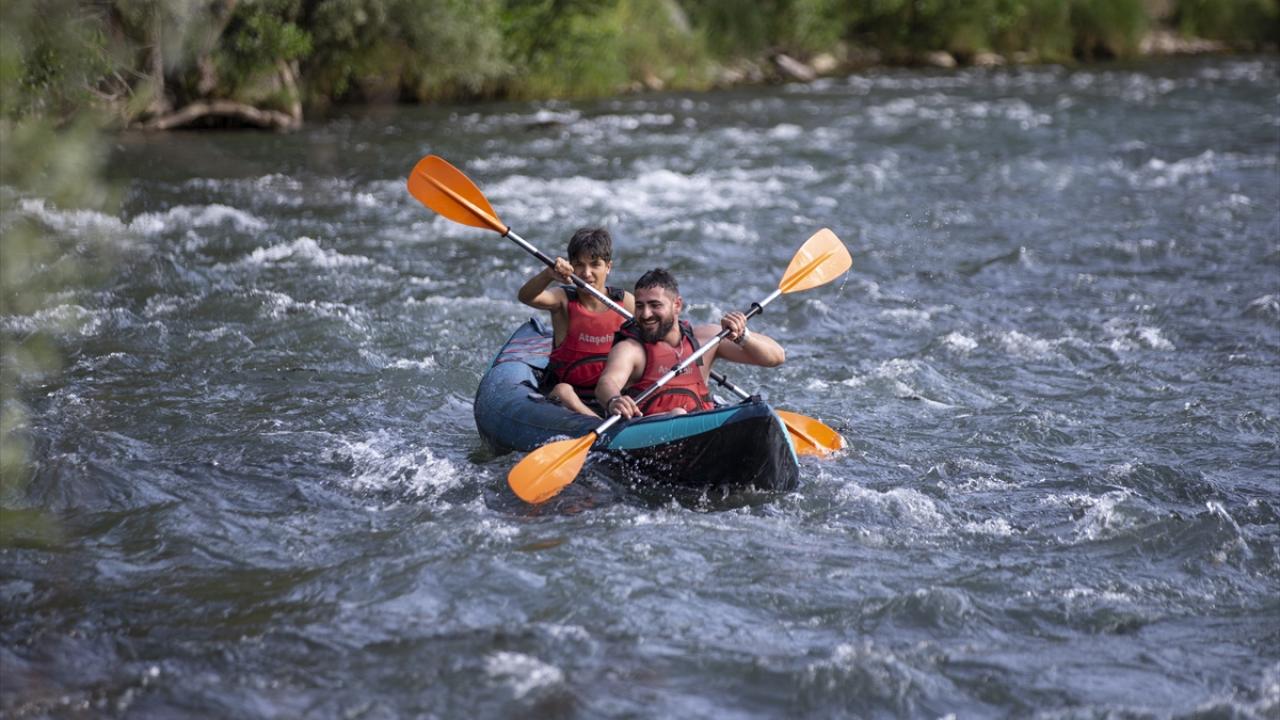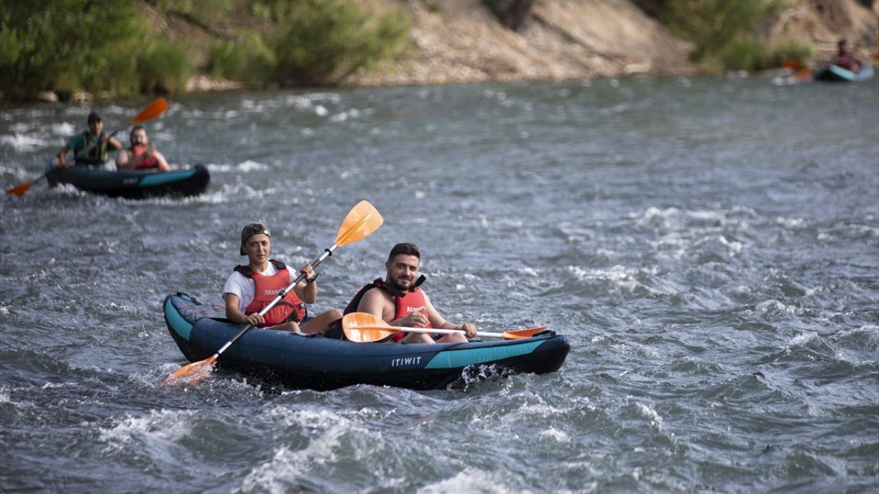 Gruplar halinde Munzur Çayı’nın berrak sularında kürek çeken tatilciler, yaklaşık 6 kilometrelik parkurda seyahat ediyor.