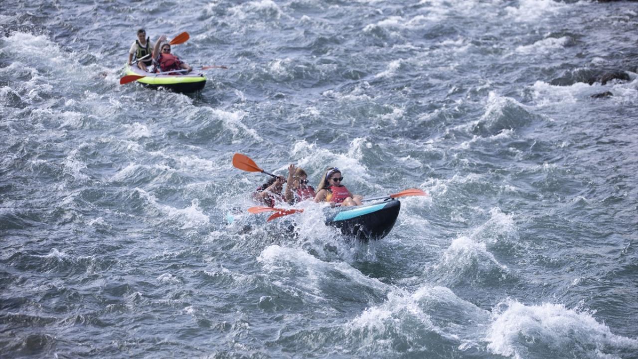 Tatilciler, bazı alanlarda da kanolarla çaydaki yüksek dalgaların arasına giriyor.