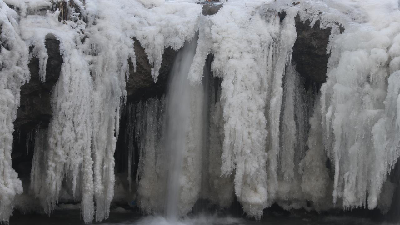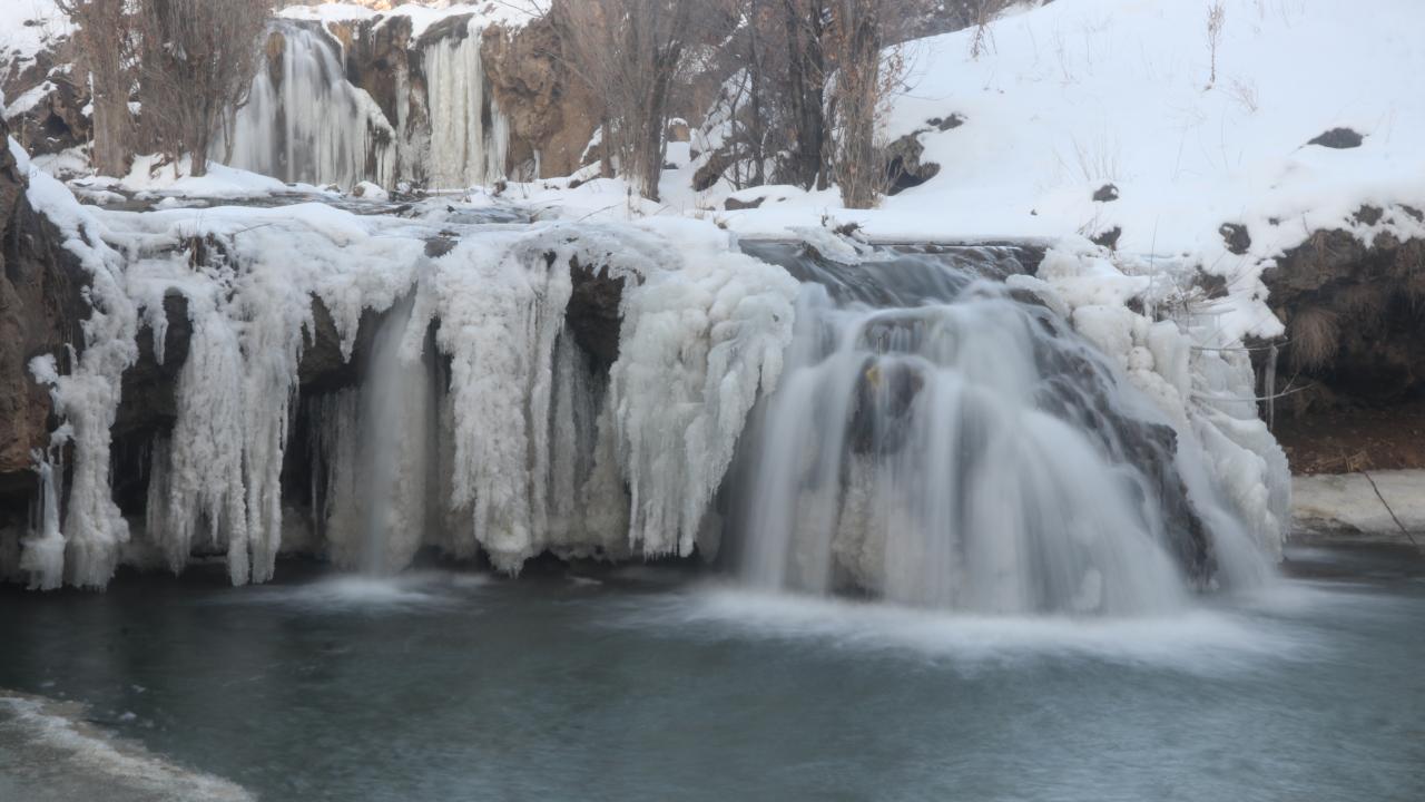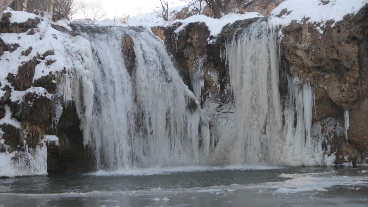 Hava sıcaklığının sıfırın altında 18 dereceye kadar düştüğü Muradiye ilçesinde, Bendimahi Çayı üzerinde yaklaşık 20 metre yüksekten akan şelalenin bir kısmı, buz tuttu.