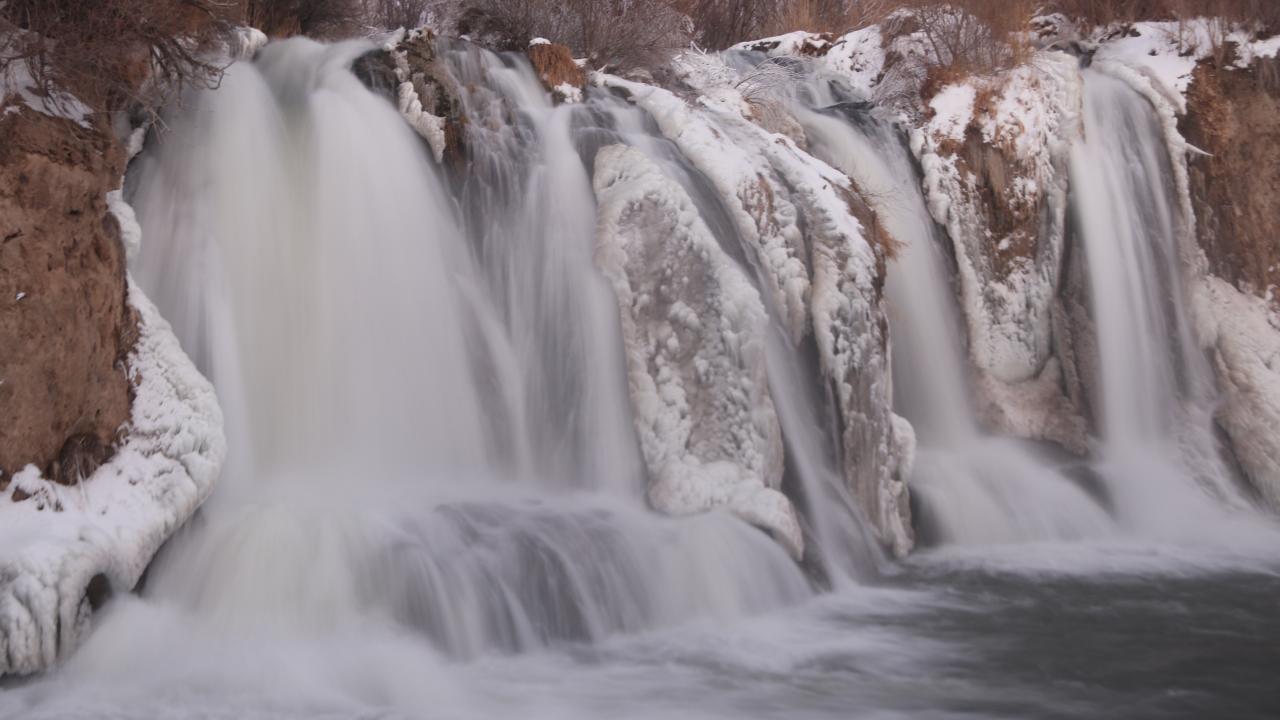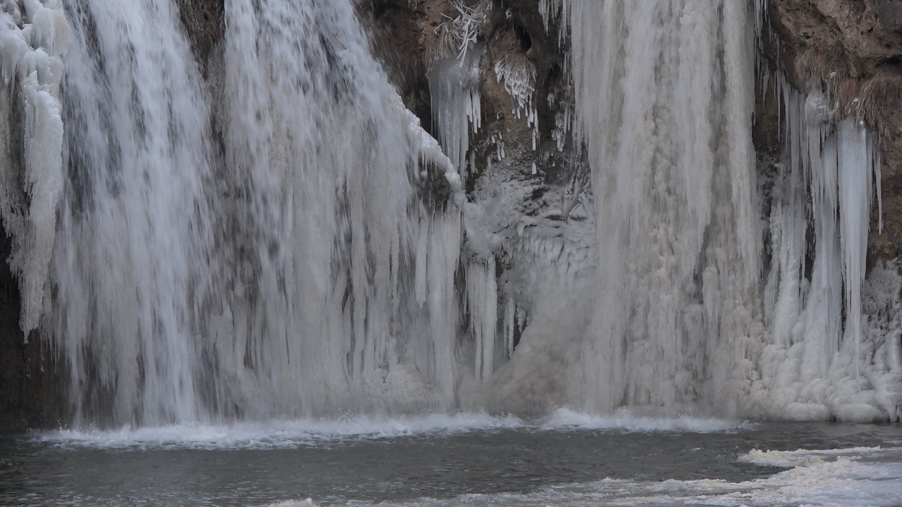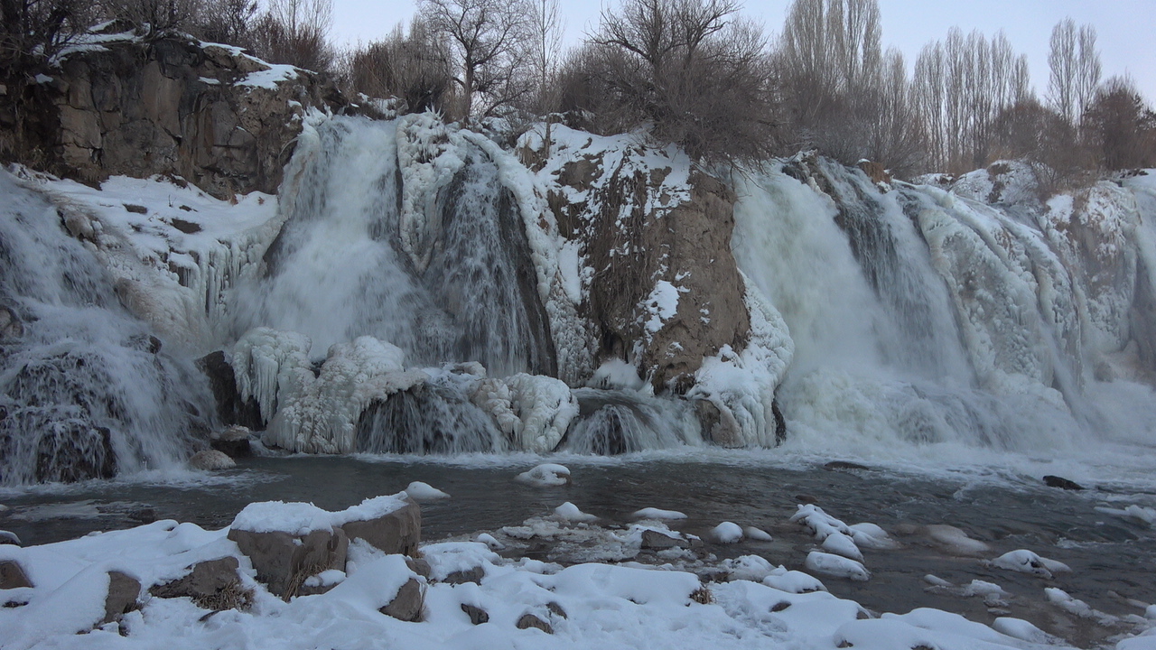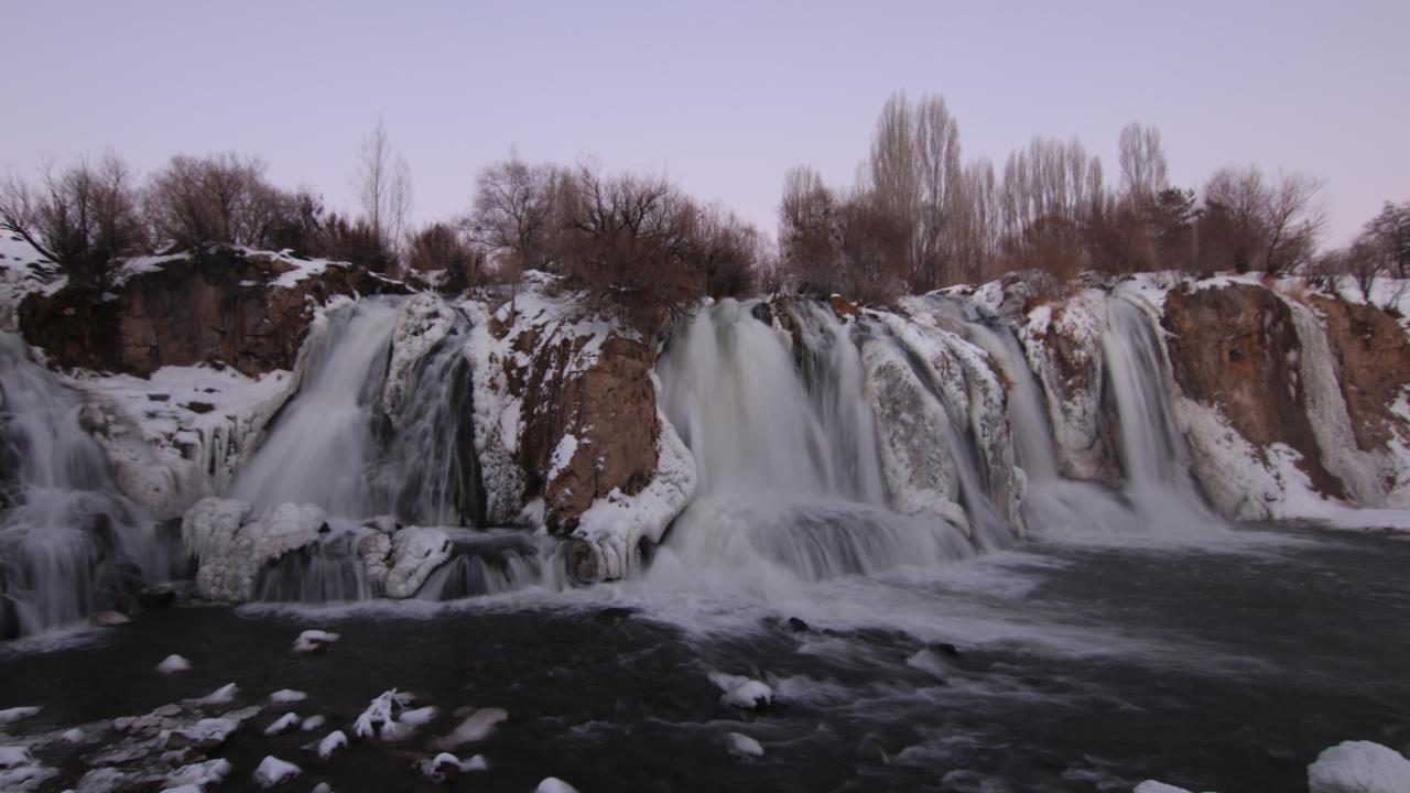 Hava sıcaklığının sıfırın altında 18 dereceye kadar düştüğü Muradiye ilçesinde, Bendimahi Çayı üzerinde yaklaşık 20 metre yüksekten akan şelalenin bir kısmı, buz tuttu.