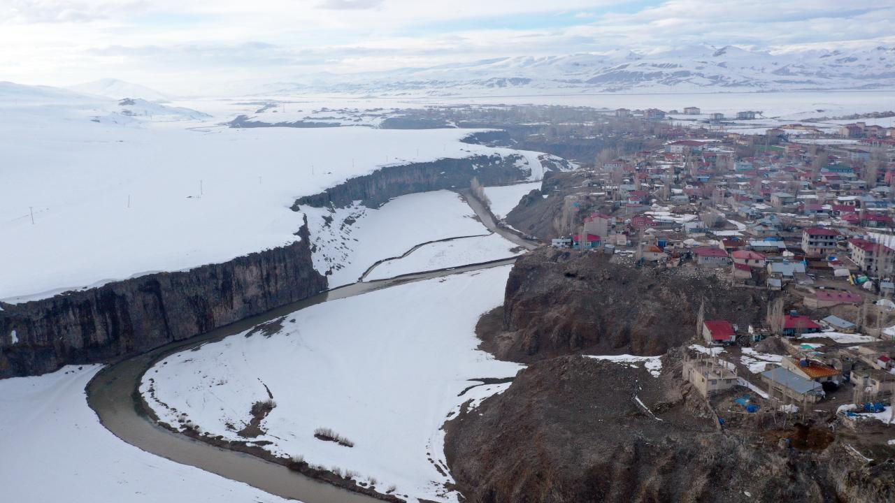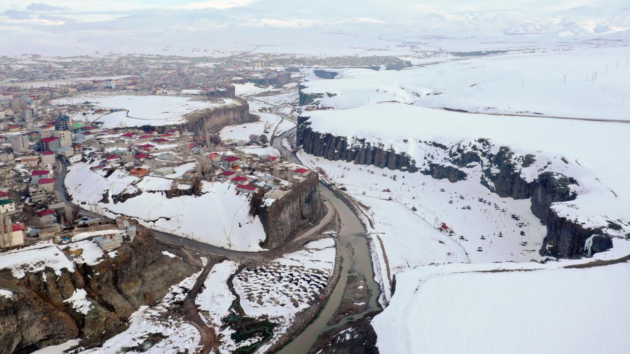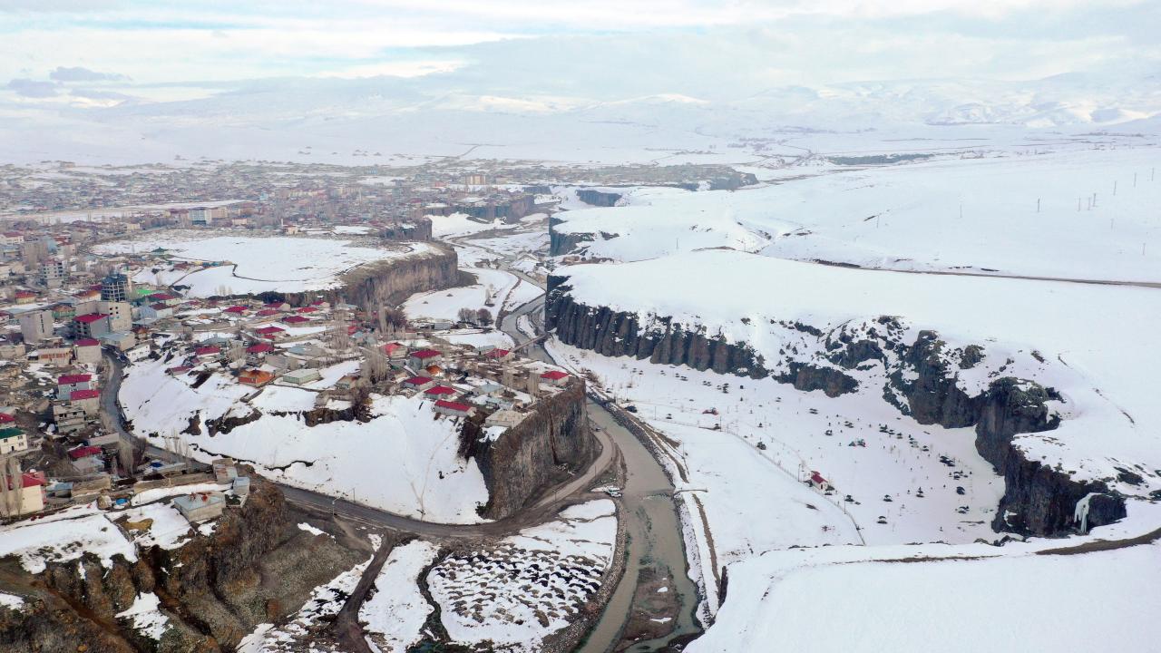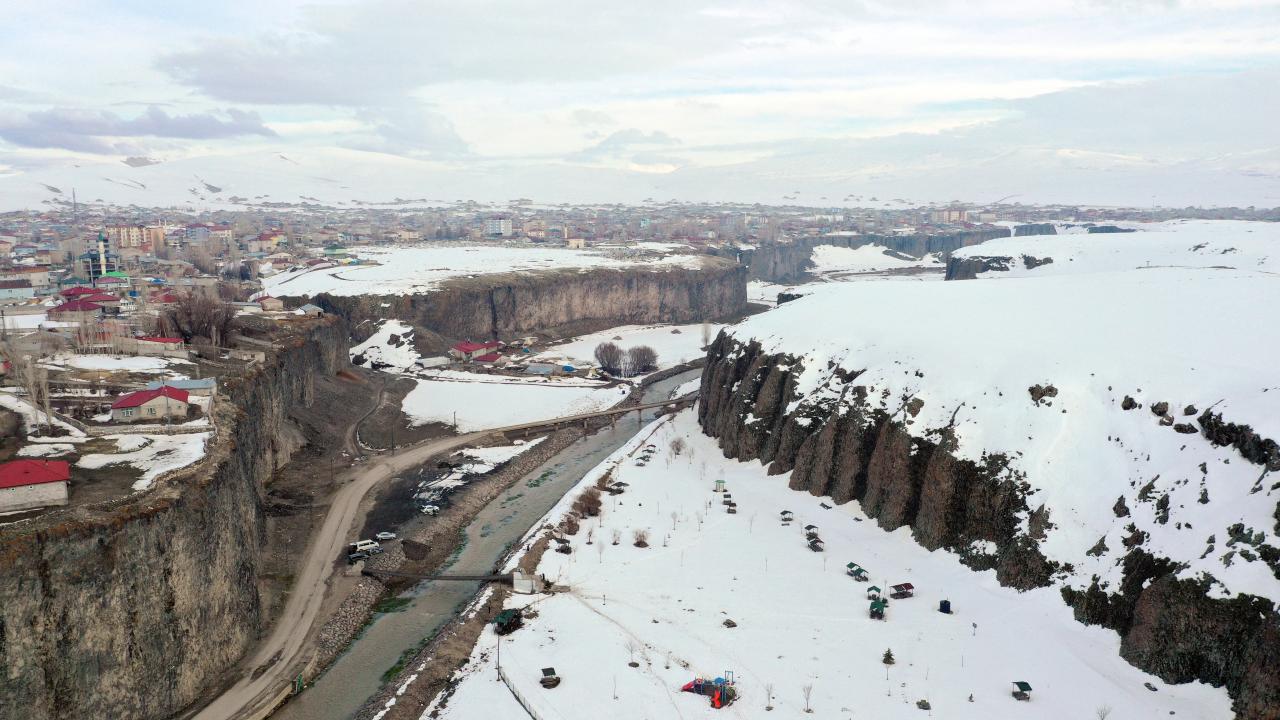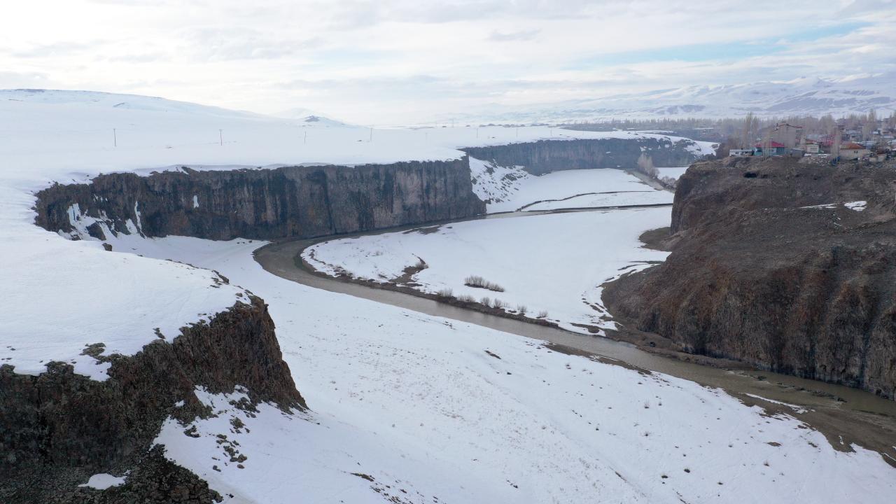 Ağrı'nın Diyadin ilçesinde bahar mevsiminde de beyaz örtüyle kaplanan Murat Kanyonu, dronla görüntülendi.