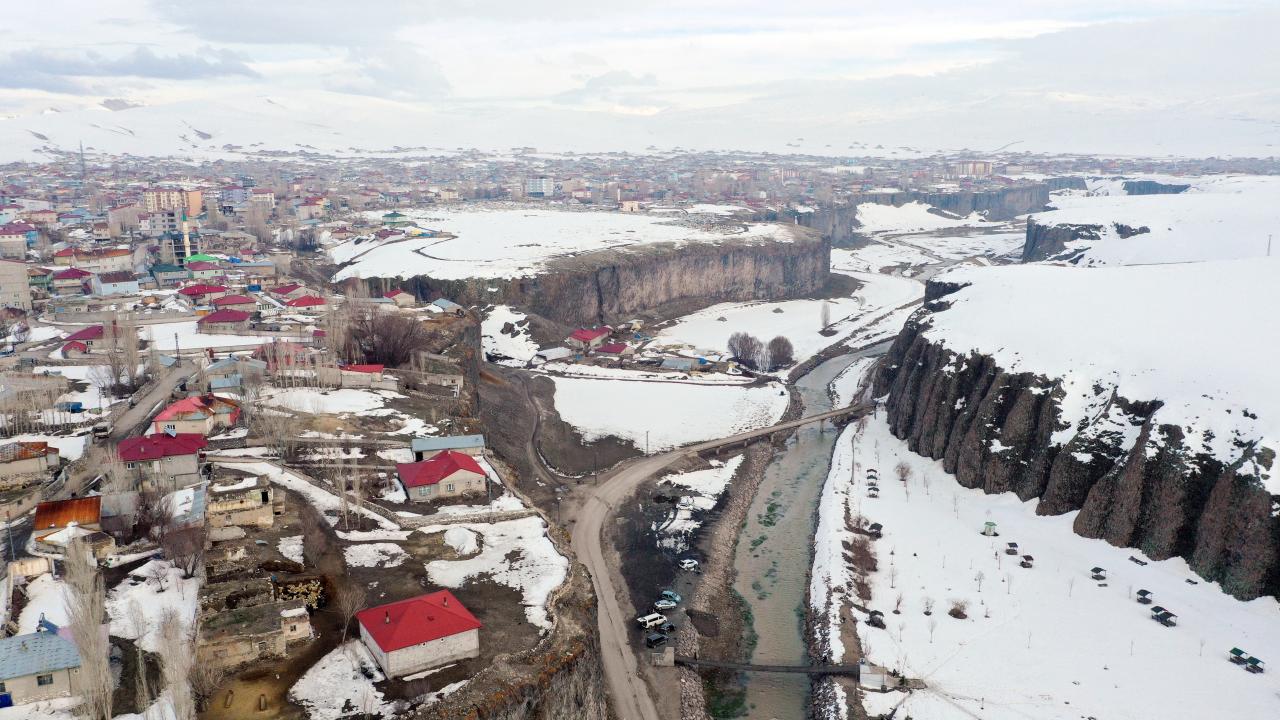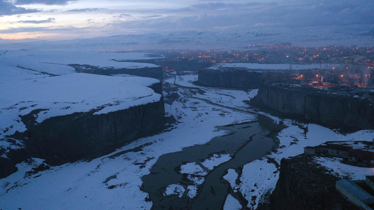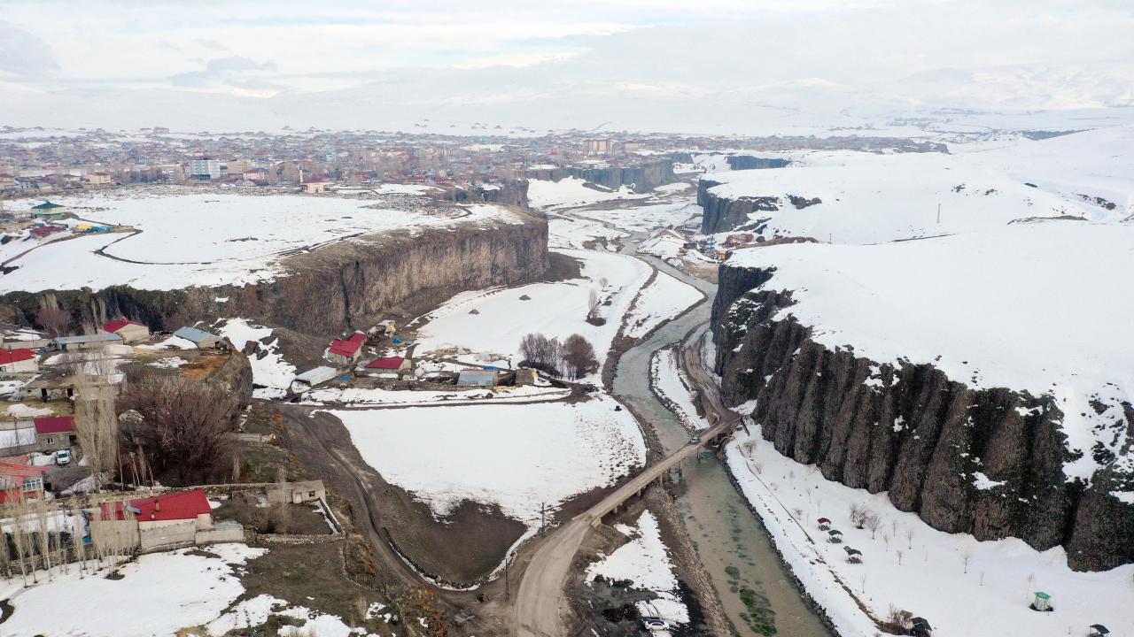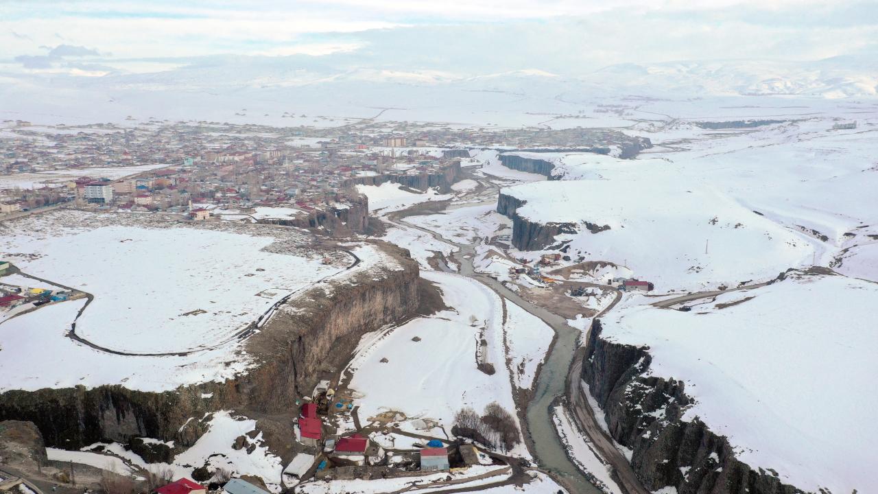 Ağrı'nın Diyadin ilçesinde bahar mevsiminde de beyaz örtüyle kaplanan Murat Kanyonu, dronla görüntülendi.