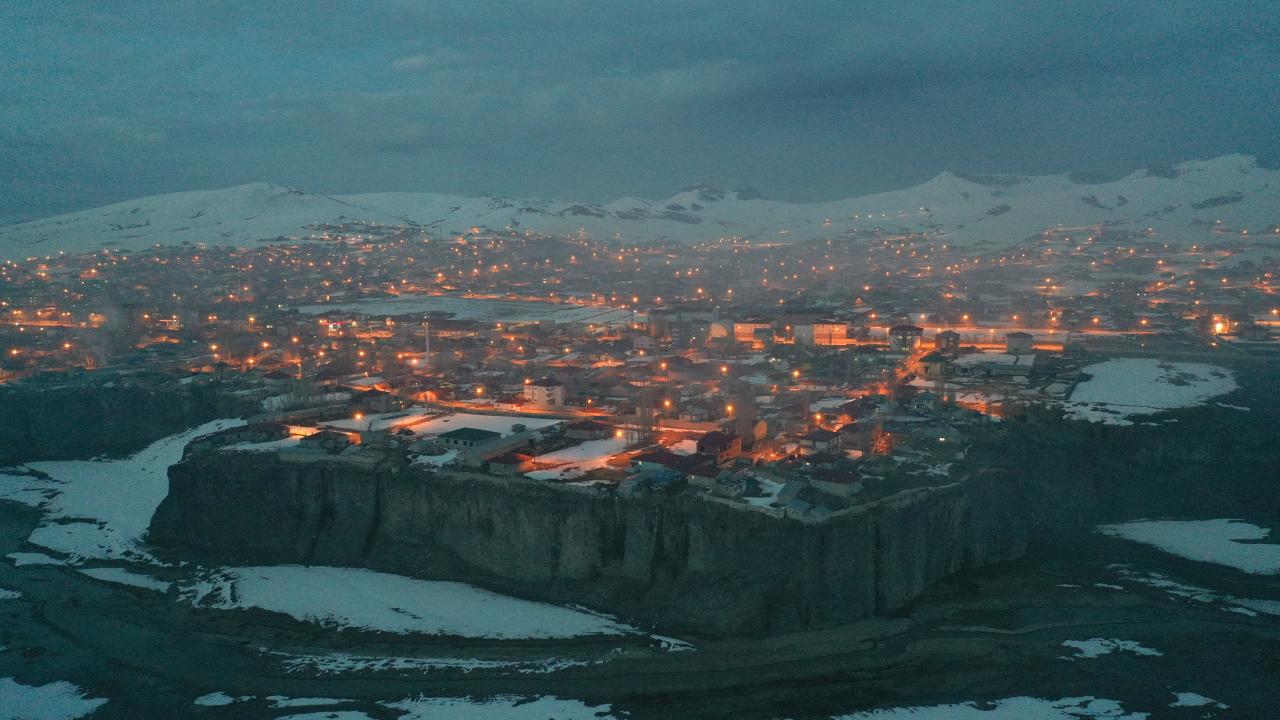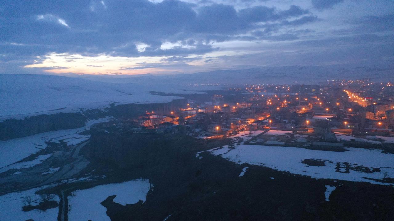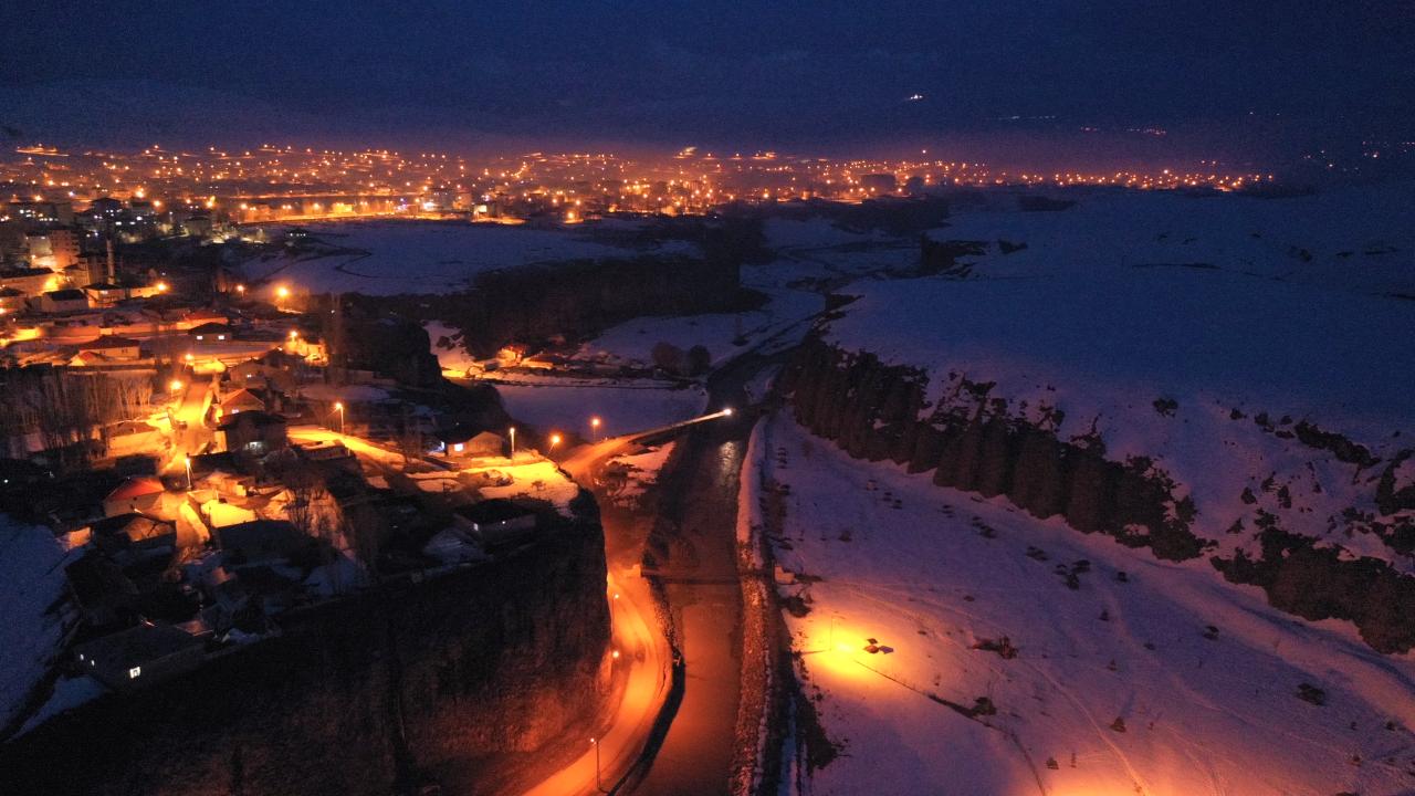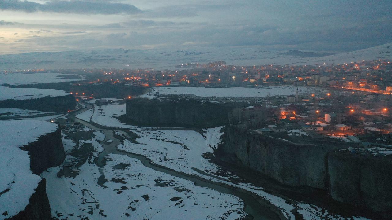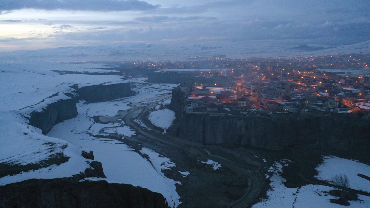 Ağrı'nın Diyadin ilçesinde bahar mevsiminde de beyaz örtüyle kaplanan Murat Kanyonu, dronla görüntülendi.