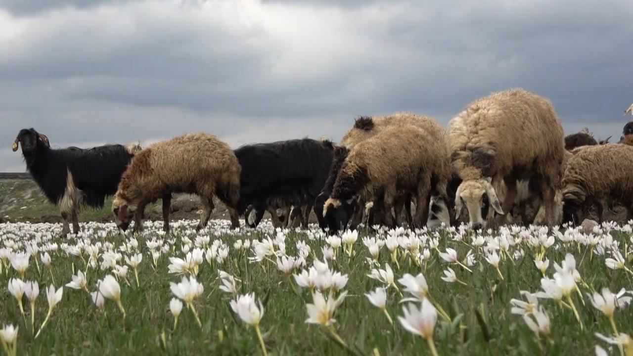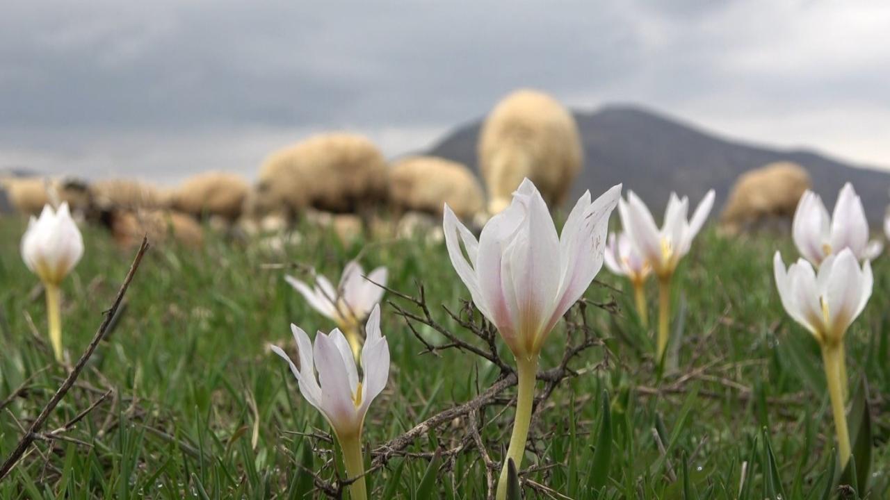 Meraya çıkan kuzuların kardelenlerin arasında otlanması güzel görüntüler oluşturdu.