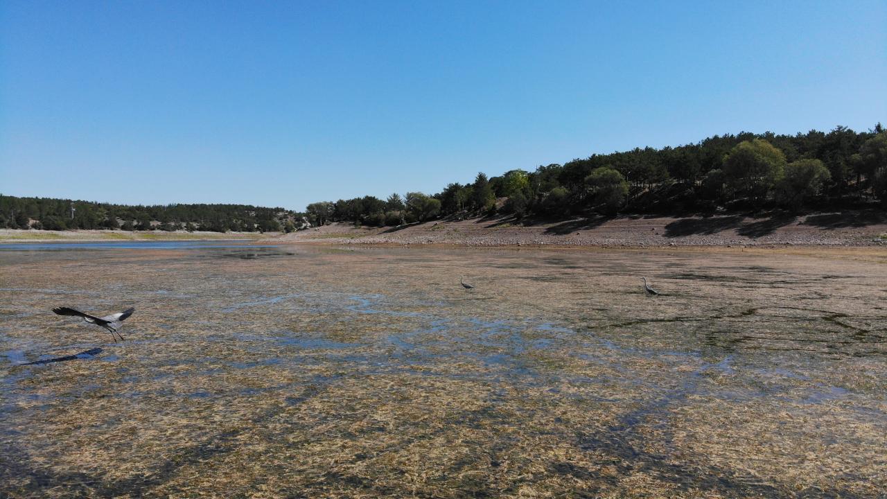 Öte yandan, buharlaşma nedeniyle daha önce suyun kapladığı bazı alanlarda bataklık oluştu. Bataklık alanlarda görülen balıkçıllar ise dikkat çekti. Ortaya çıkan kurak manzaralar dron ile havadan görüntülendi.