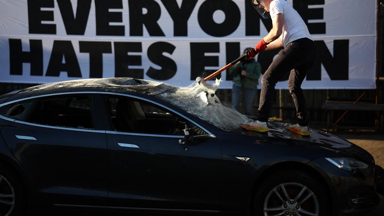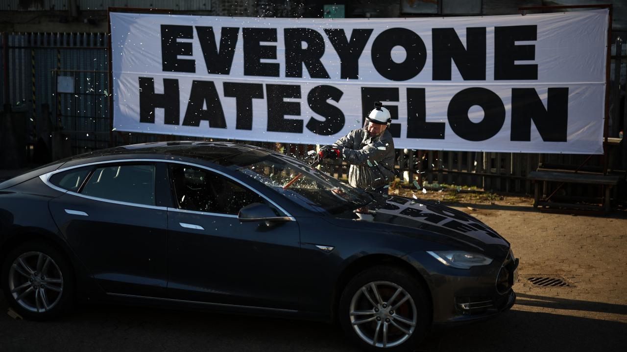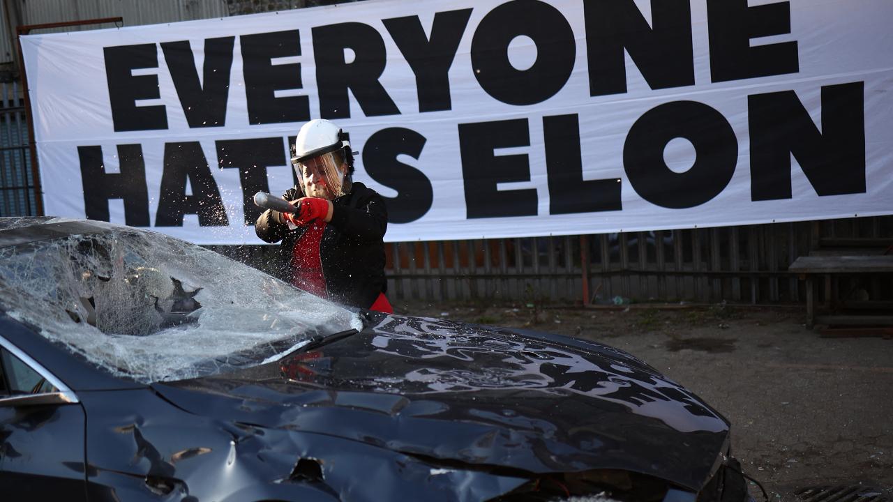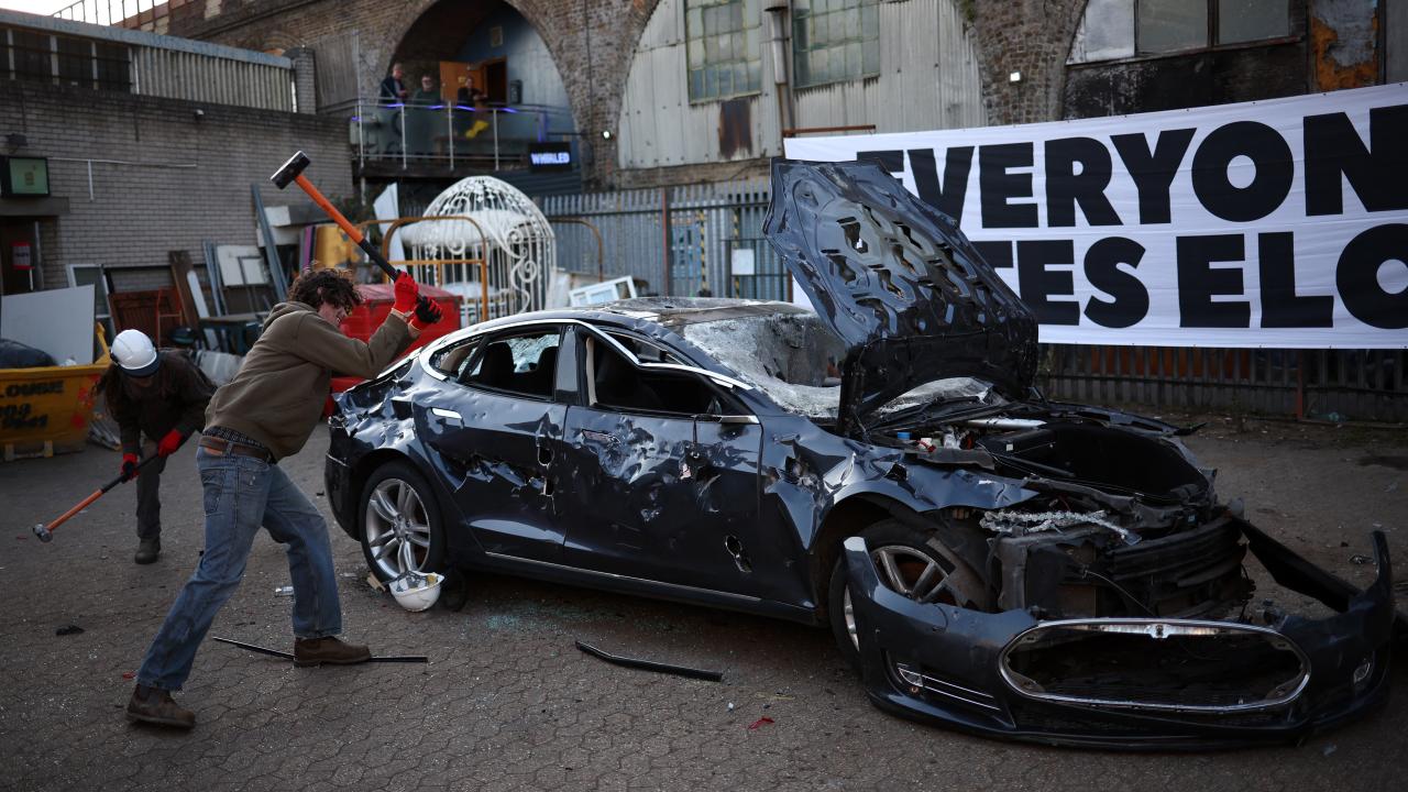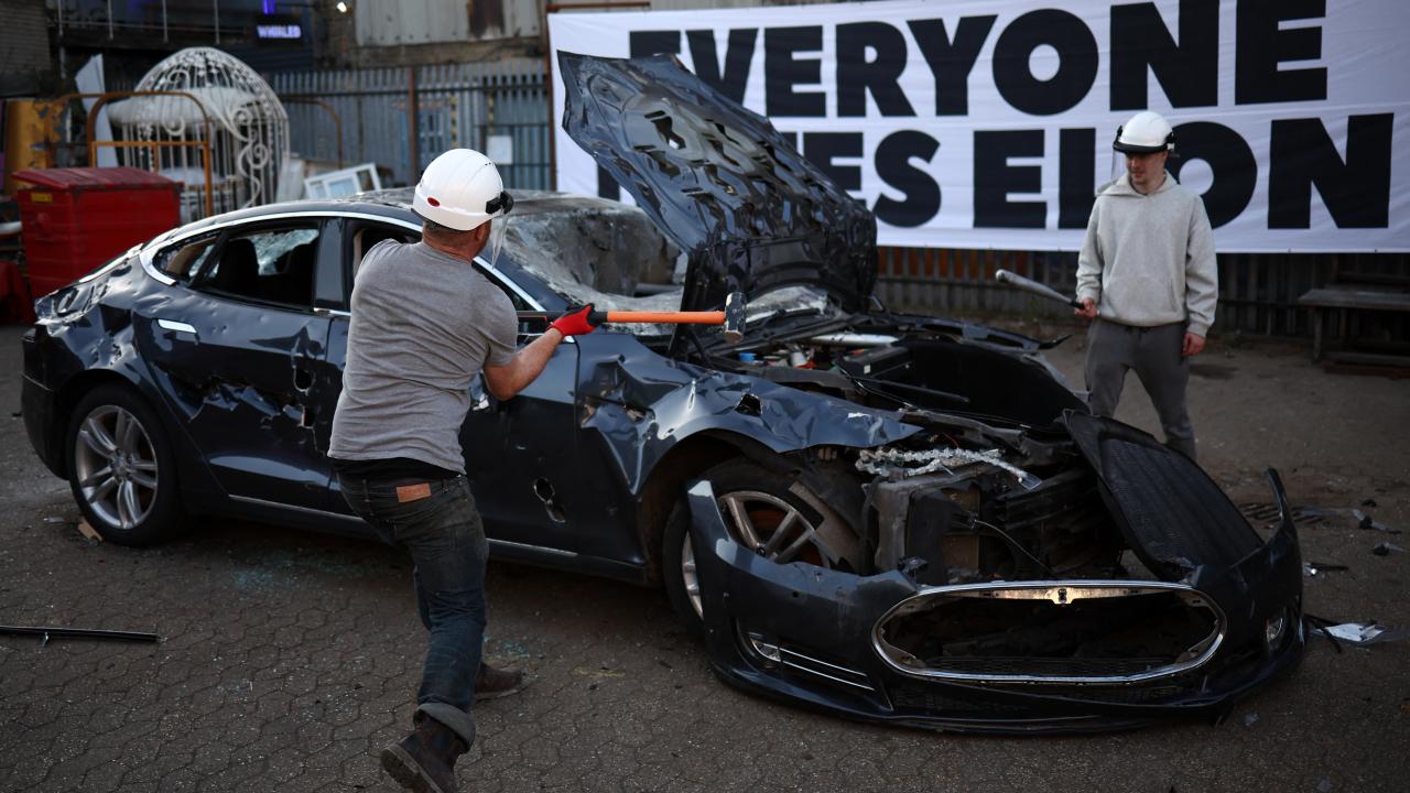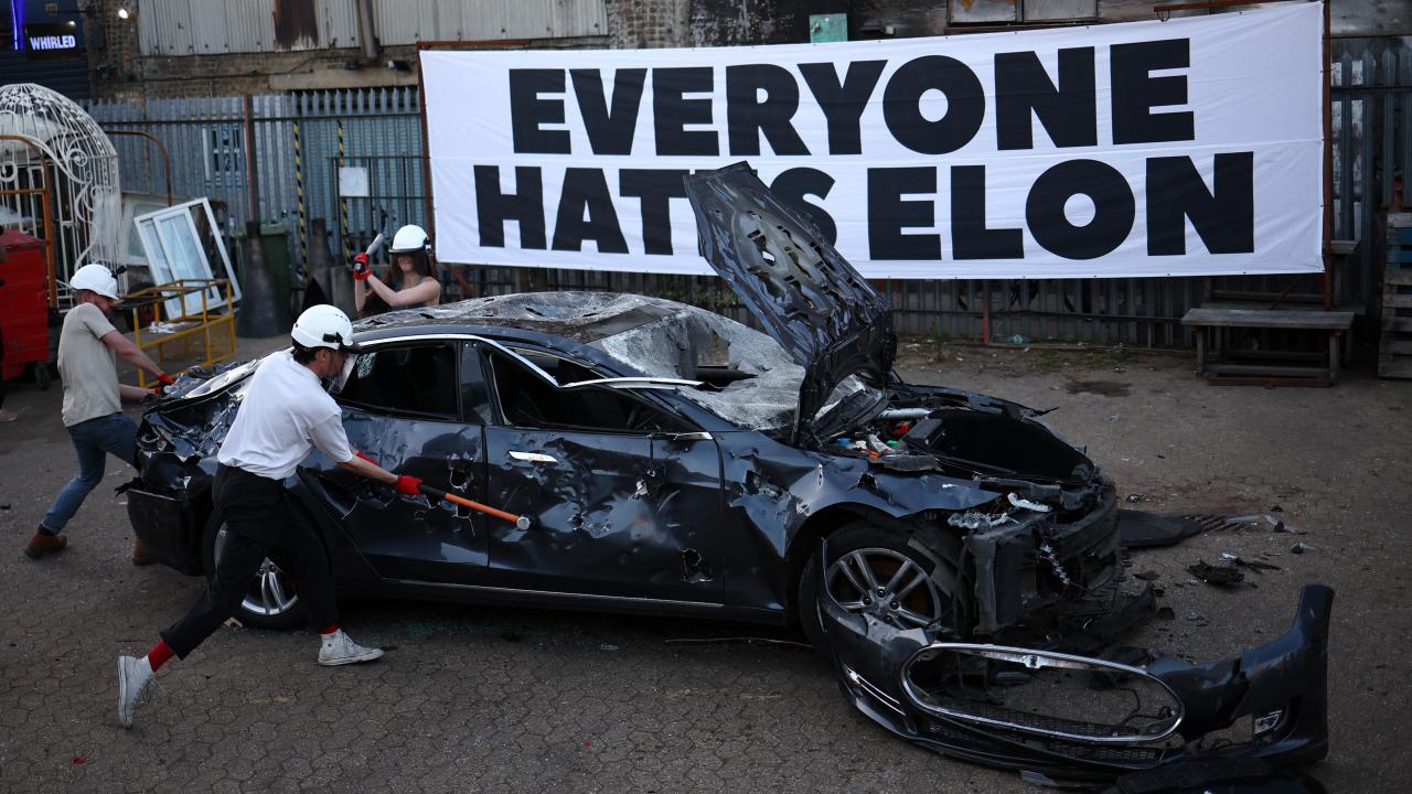 İngiltere'de, "Herkes Elon'dan Nefret Ediyor" adlı kampanya grubu, servet eşitsizliğine dikkat çekmek amacıyla hurdalığa gidecek bir Tesla aracı balyozla parçaladı.