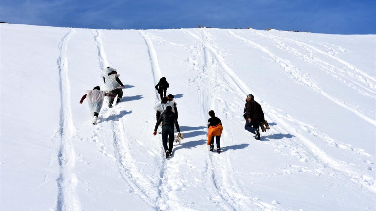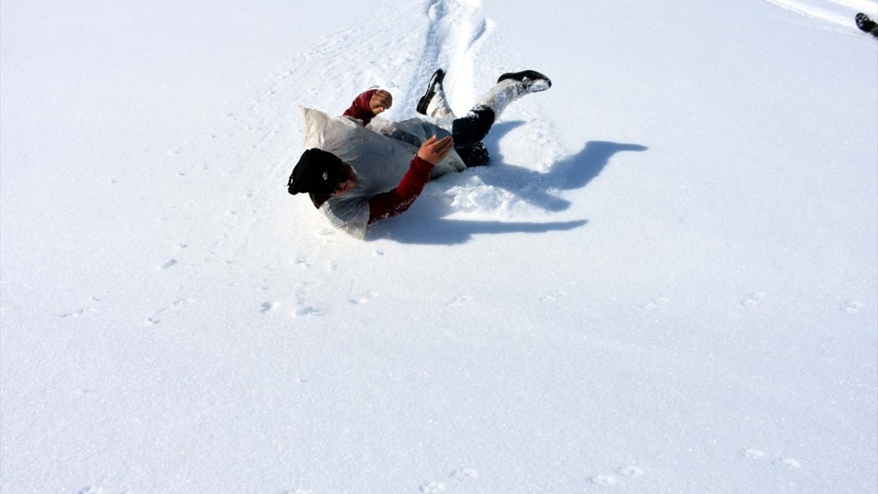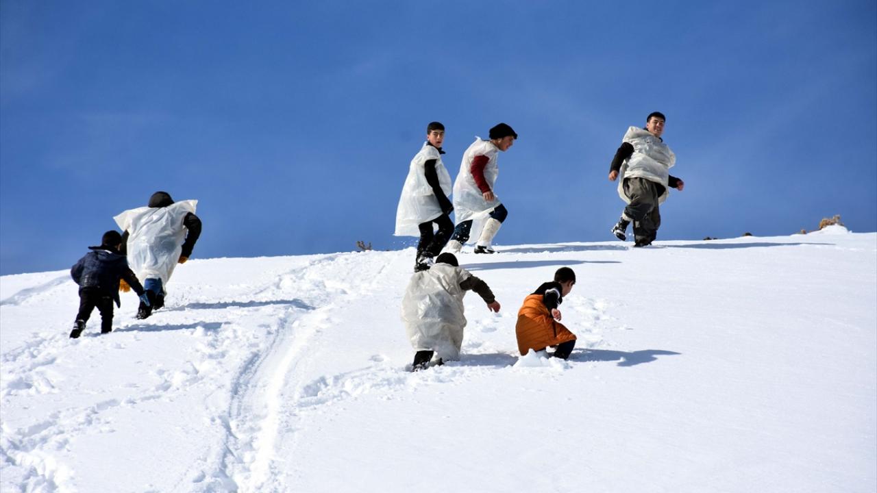 Muş'un Yukarıyongalı köyündeki çocuklar, naylon, poşet ve bidonlarla çıktıkları karlı tepelerden kayarak eğlendi.