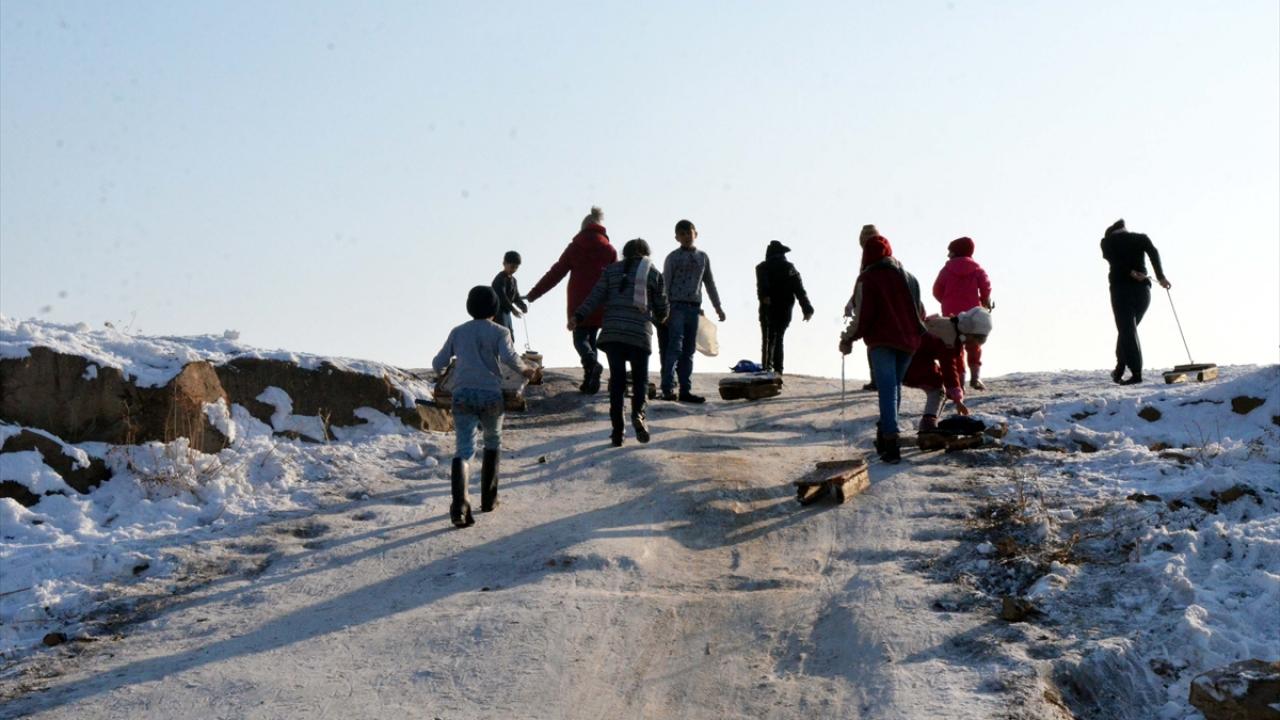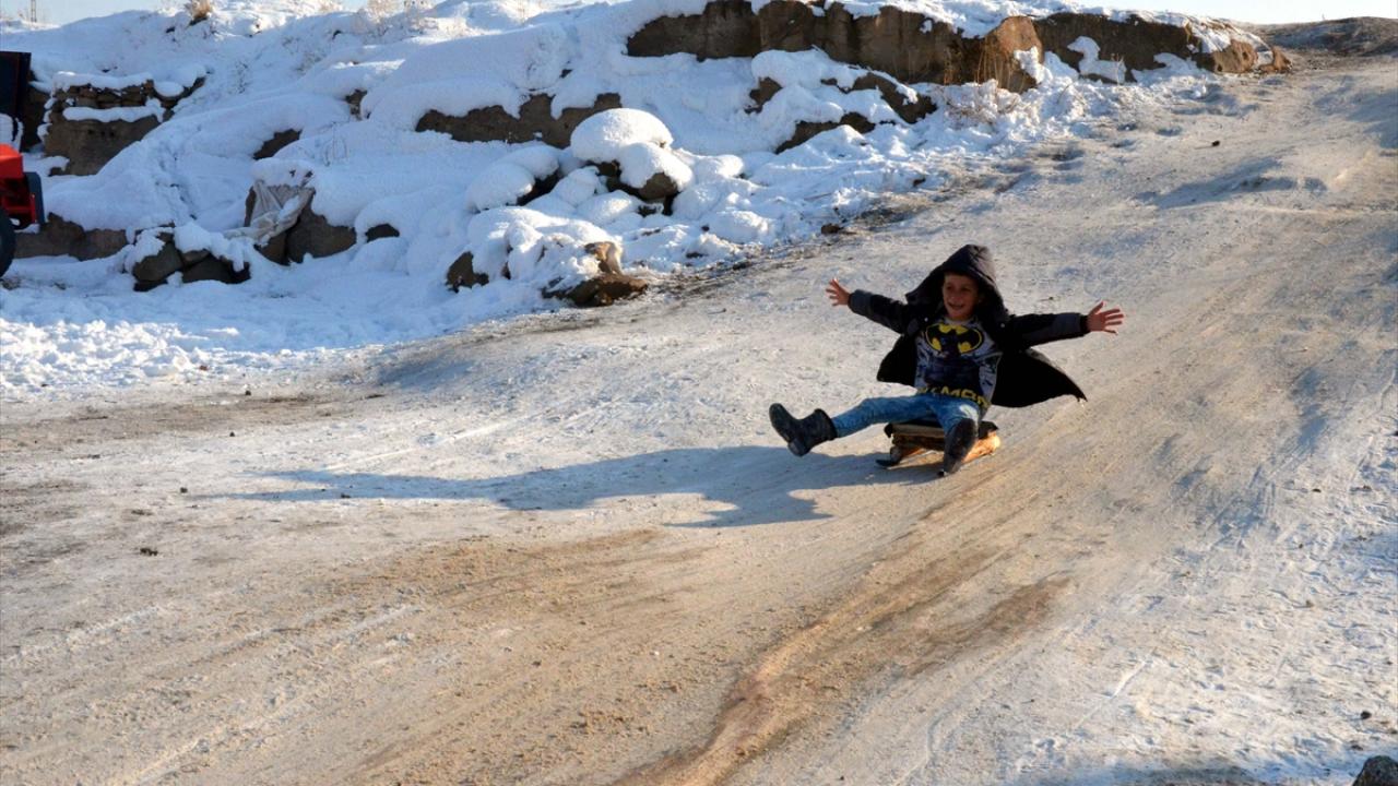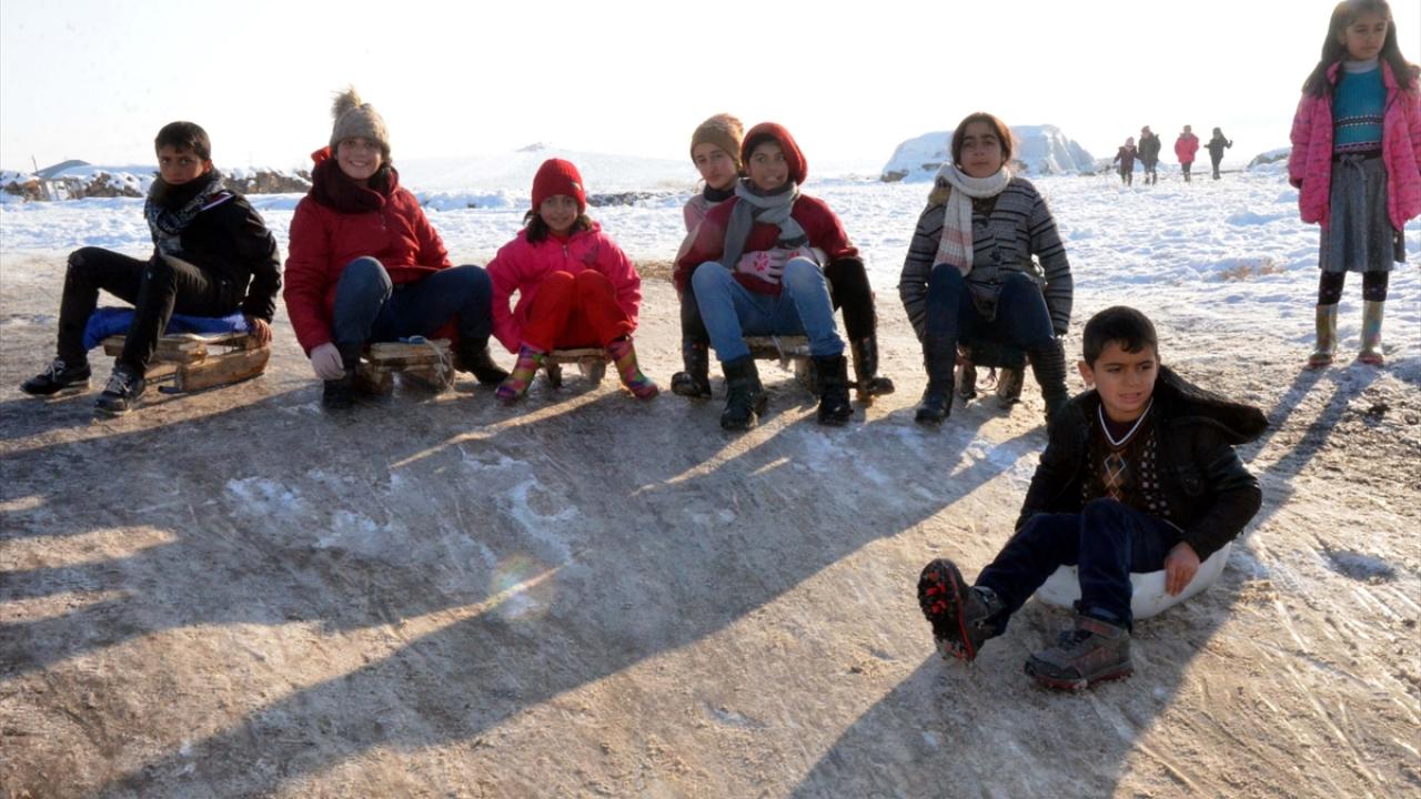 Muşlu çocuklar karla kaplanan alanlarda kızaklarıyla kayarak gönüllerince eğleniyor.