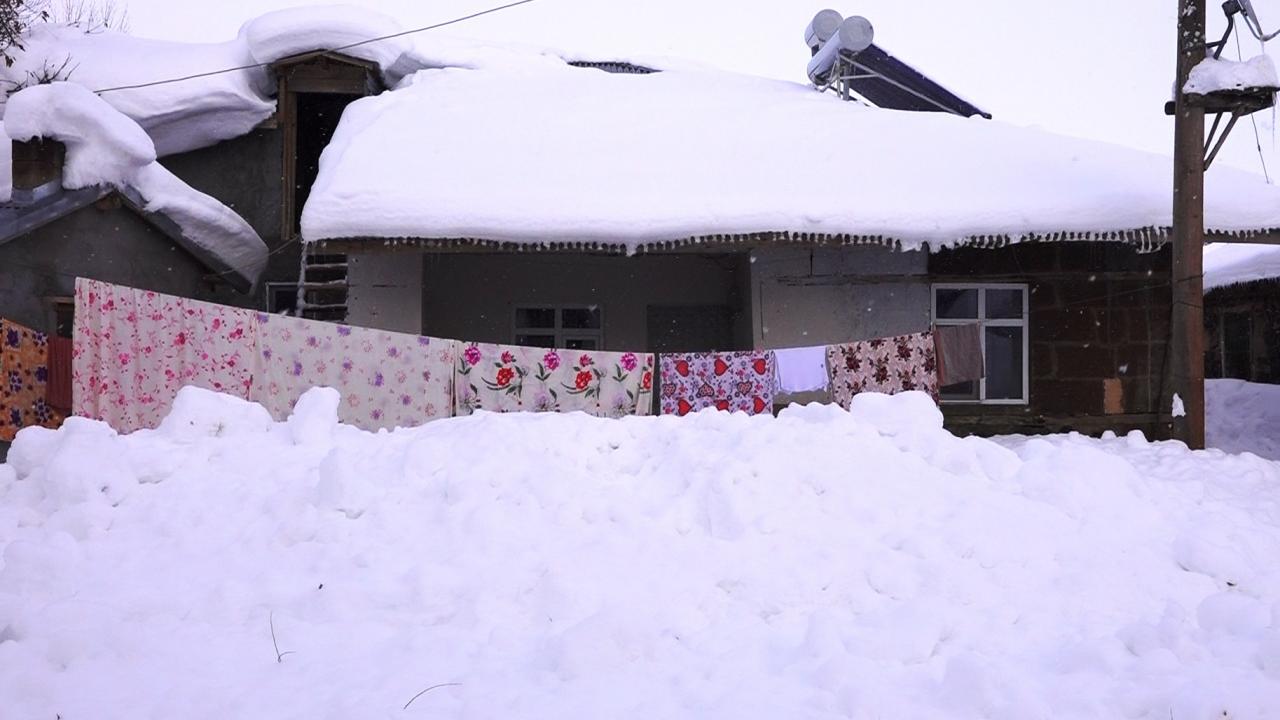 Evlerin, araçların ve traktörlerin kar altında kaldığı köyde, kapı önlerine asılan çamaşırlar da soğuk havanın etkisiyle donuyor.